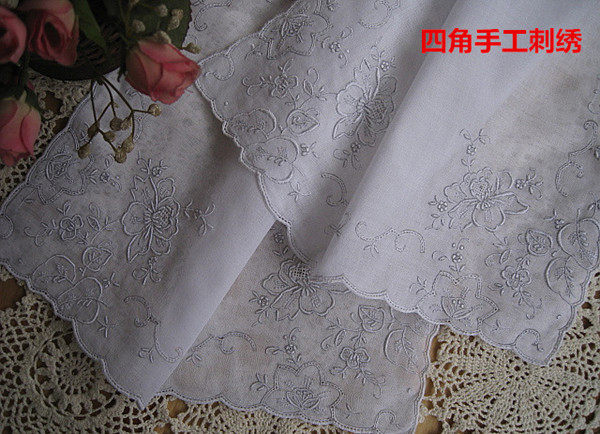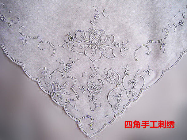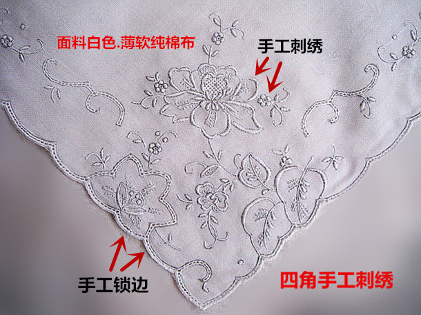 精致飽滿立體的四角手工刺繡,手工鏤空小花窗,手工鎖邊。尺寸31X31Cm。面料白色薄純棉布。 出口歐美及日本,他們喜歡手繡,能顯示出一定的品位與檔次。另外說明一下,店里的手帕布料越薄越貴,薄如蟬翼的更貴,請知悉。(繡花邊緣有黑紋線,是傳統的工藝,增加繡的立體感的)。如果喜歡這種手工藝術,它是一個不錯的選擇,刺繡的精美度與呈現沒有什么好不好,值不值的,只有你喜歡不喜歡,或價錢與同行同等質量的比較,貴不貴的問題,歡迎鑒別。超值品。標的價格是一個的價錢。