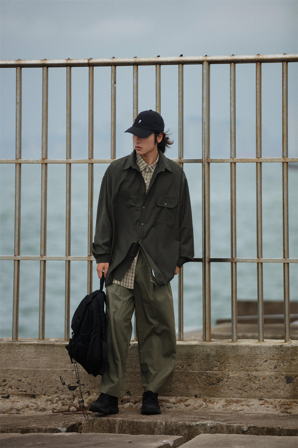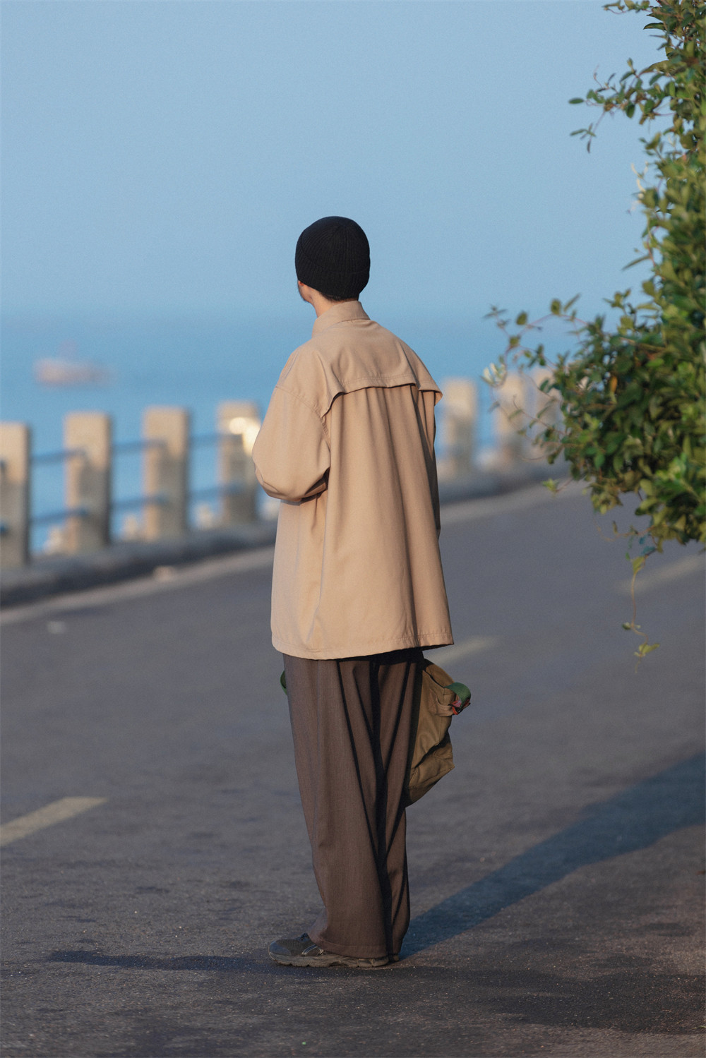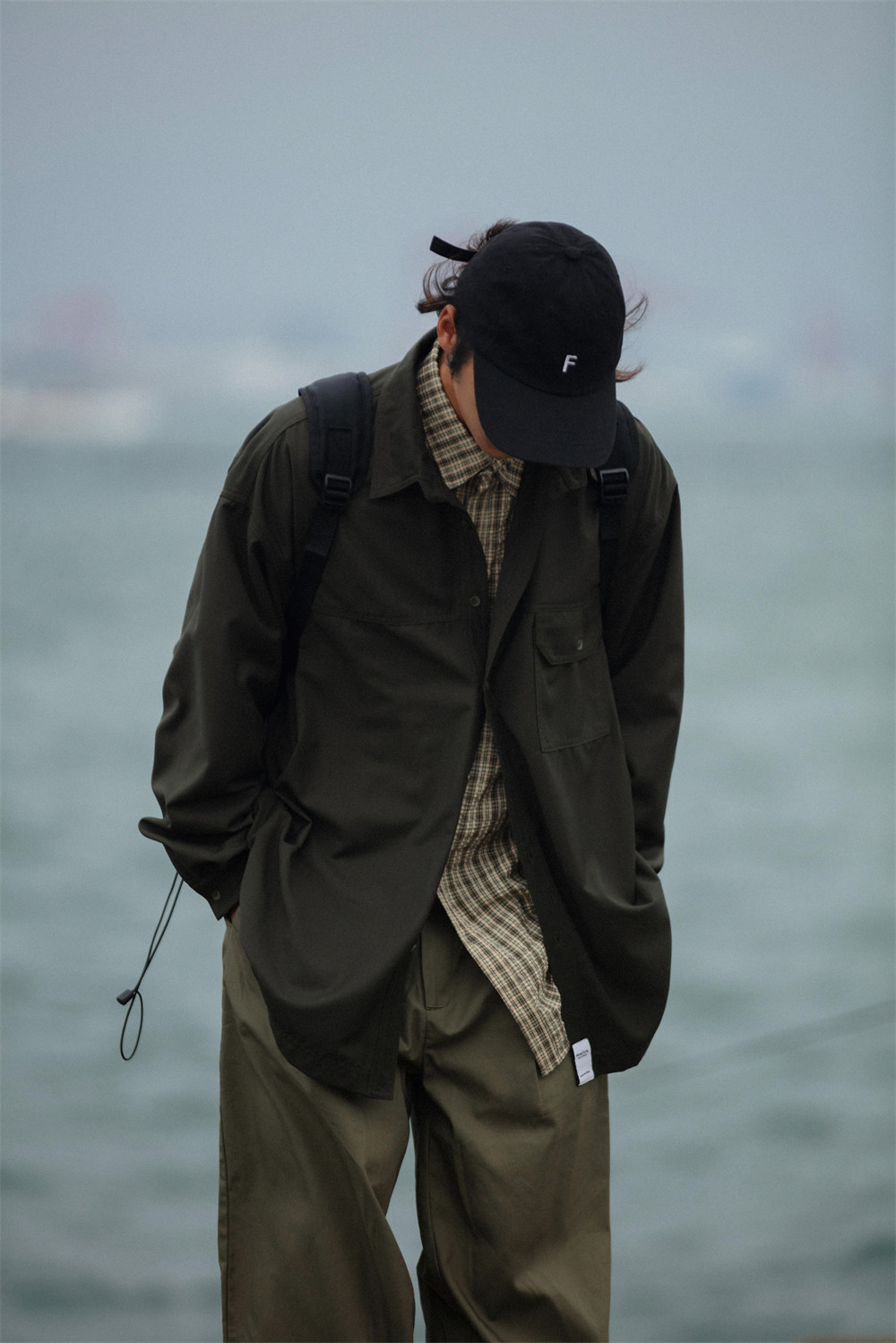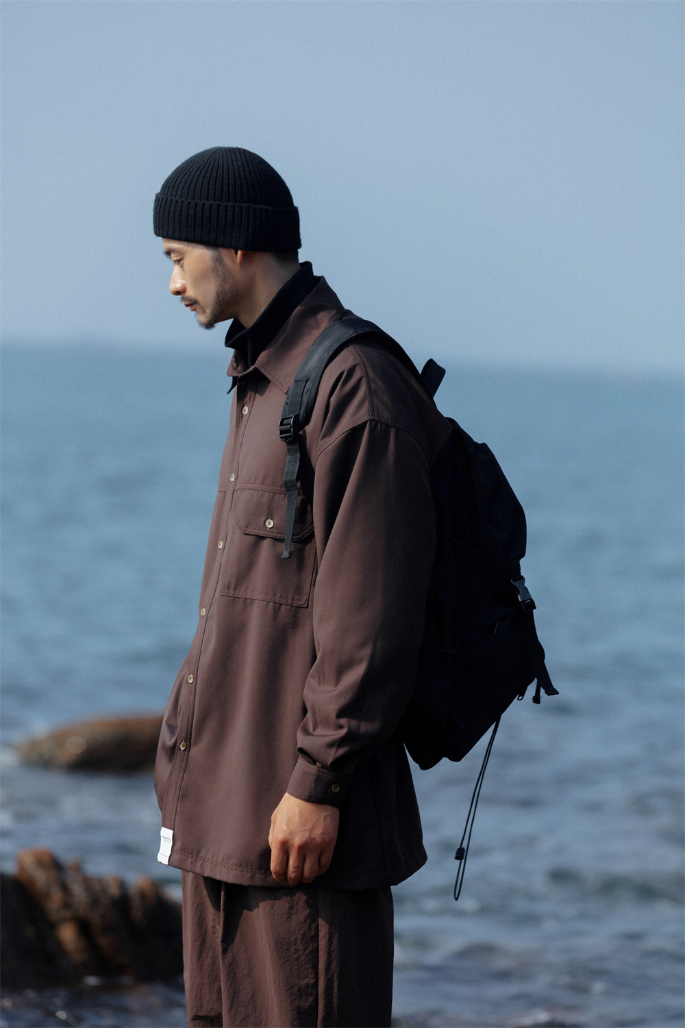 高克重仿毛料面料,具有良好的抗皺性能和垂墜感。版型方面是寬肥的戶外工裝版型,前片做了分割拼接,門襟定制標簽貼標縫制,增加視覺效果。落肩寬闊的版型,滿足戶外穿著的同時,我們在后背設計了風琴鏤空設計,內里采用網眼面料,增加透氣性和視覺效果!