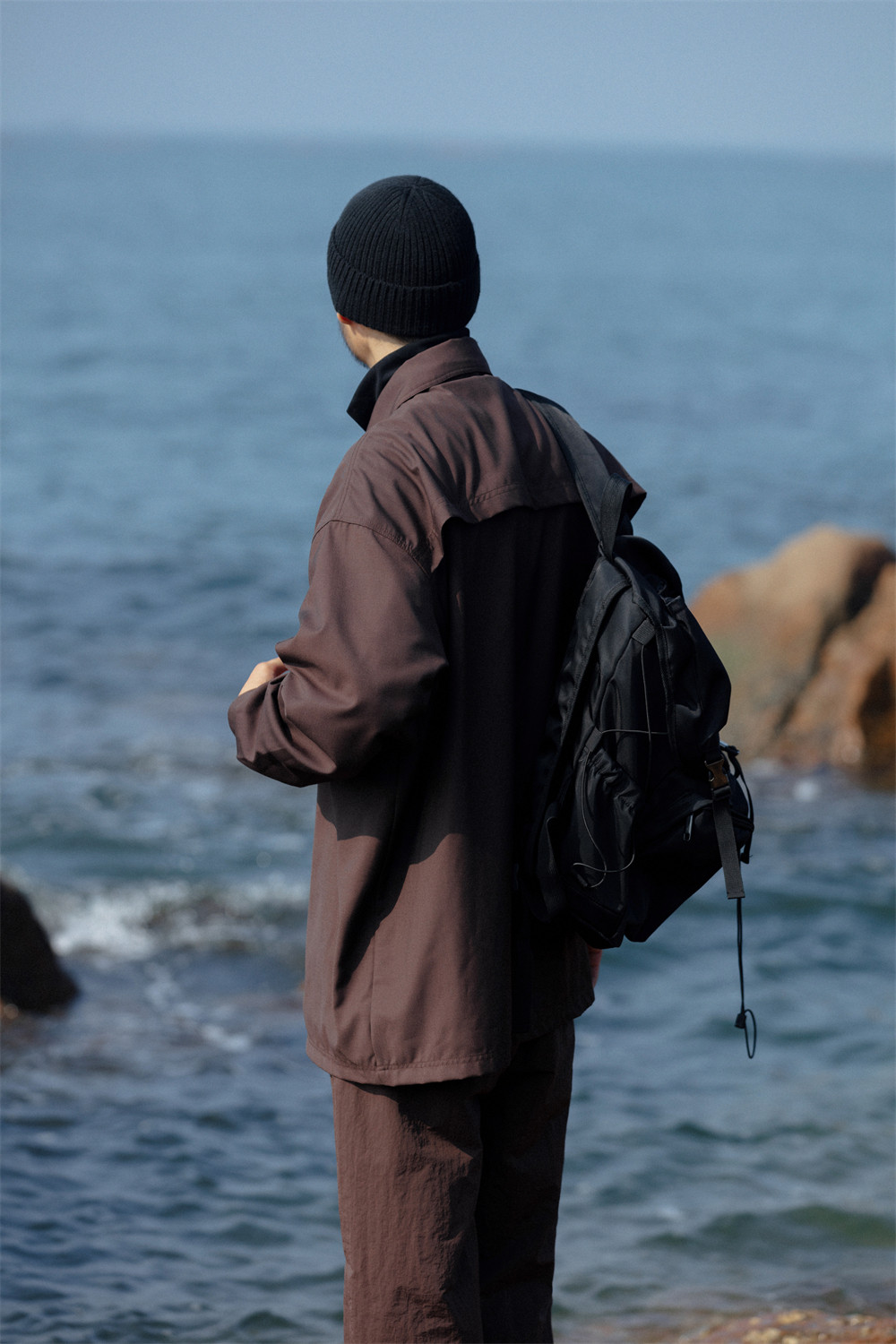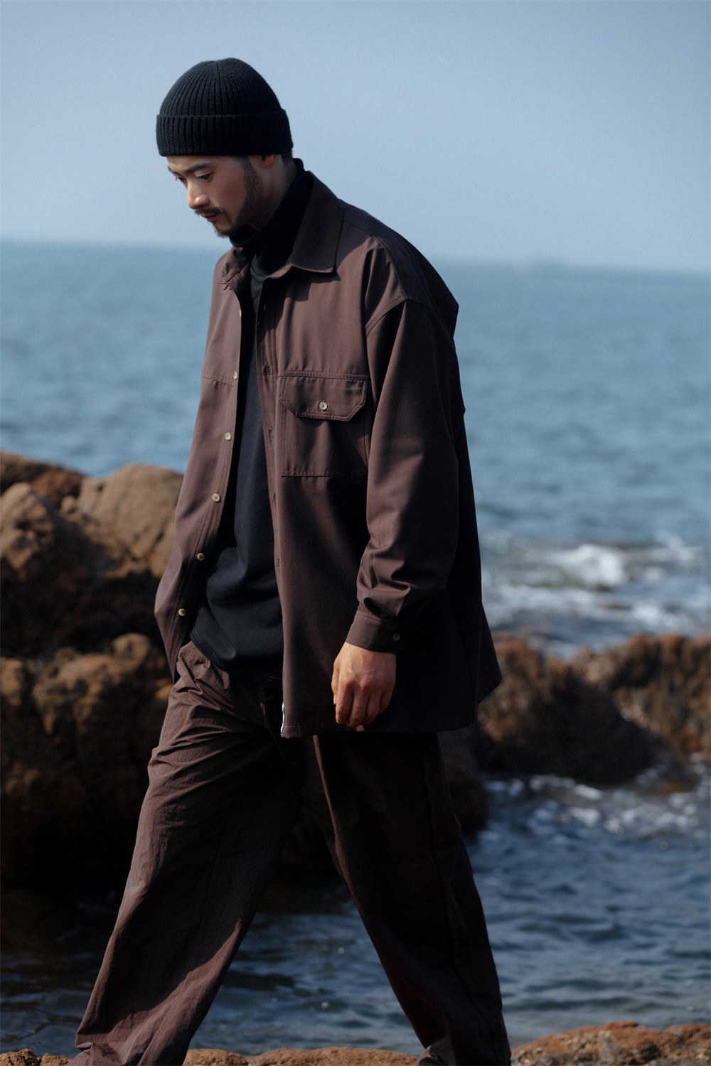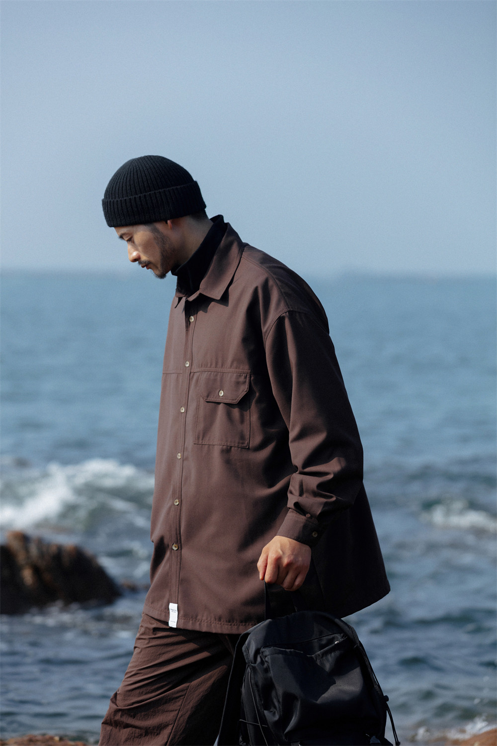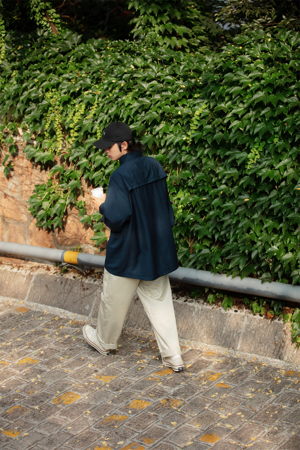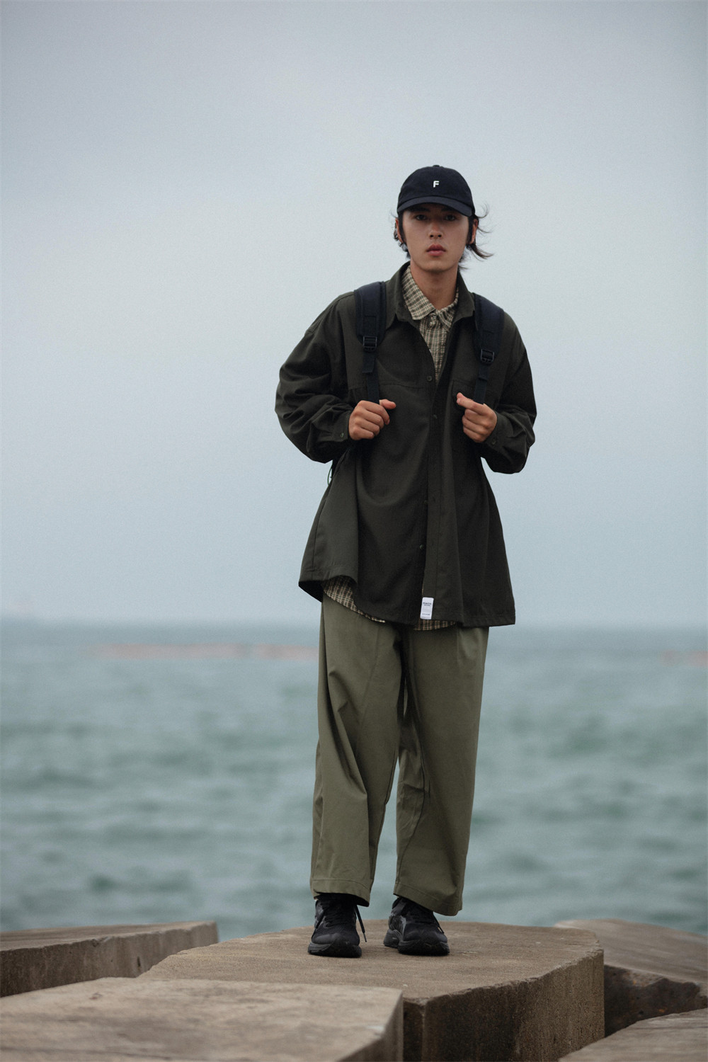 高克重仿毛料面料,具有良好的抗皺性能和垂墜感。版型方面是寬肥的戶外工裝版型,前片做了分割拼接,門襟定制標簽貼標縫制,增加視覺效果。落肩寬闊的版型,滿足戶外穿著的同時,我們在后背設計了風琴鏤空設計,內里采用網眼面料,增加透氣性和視覺效果!