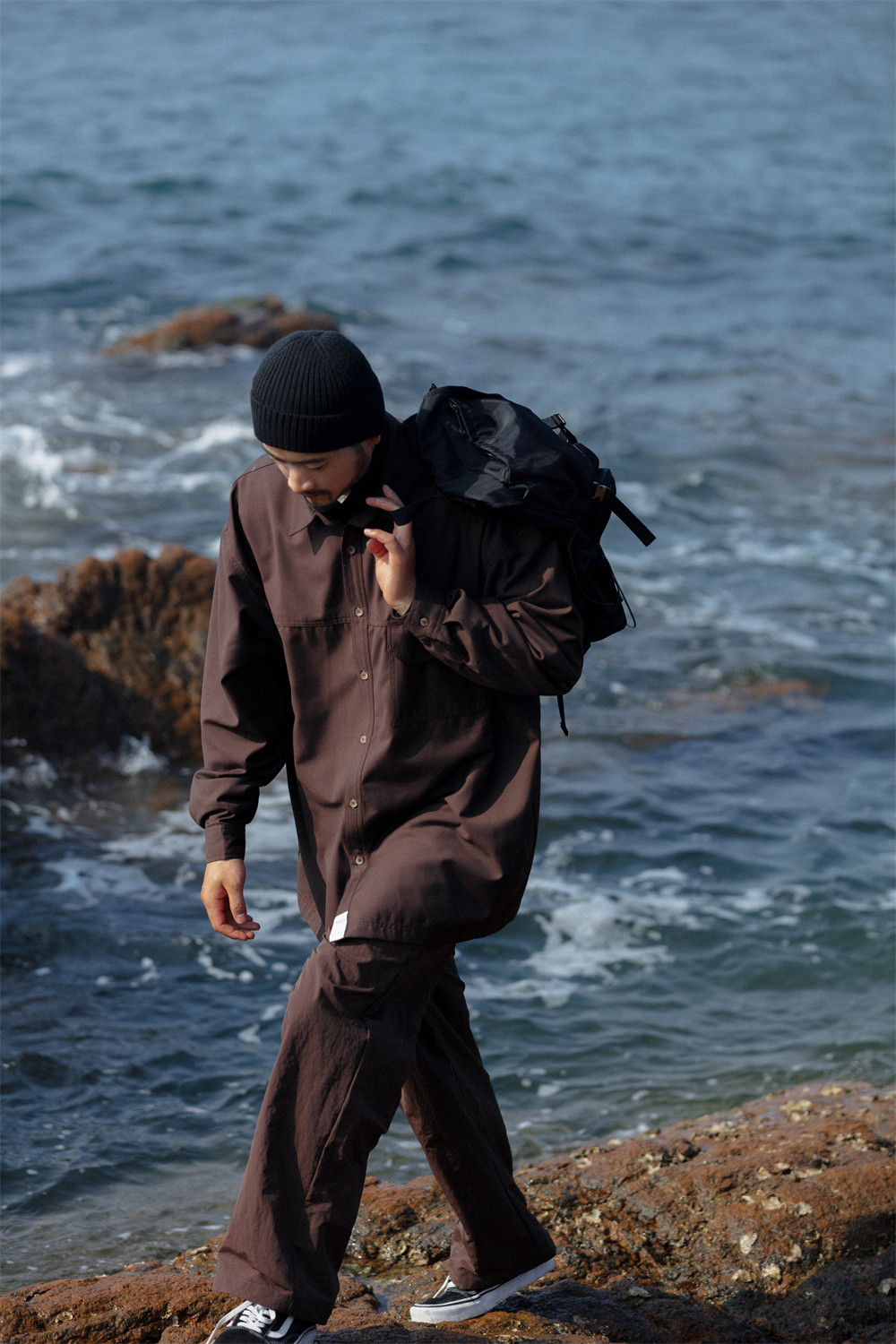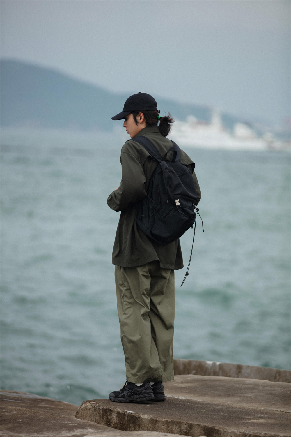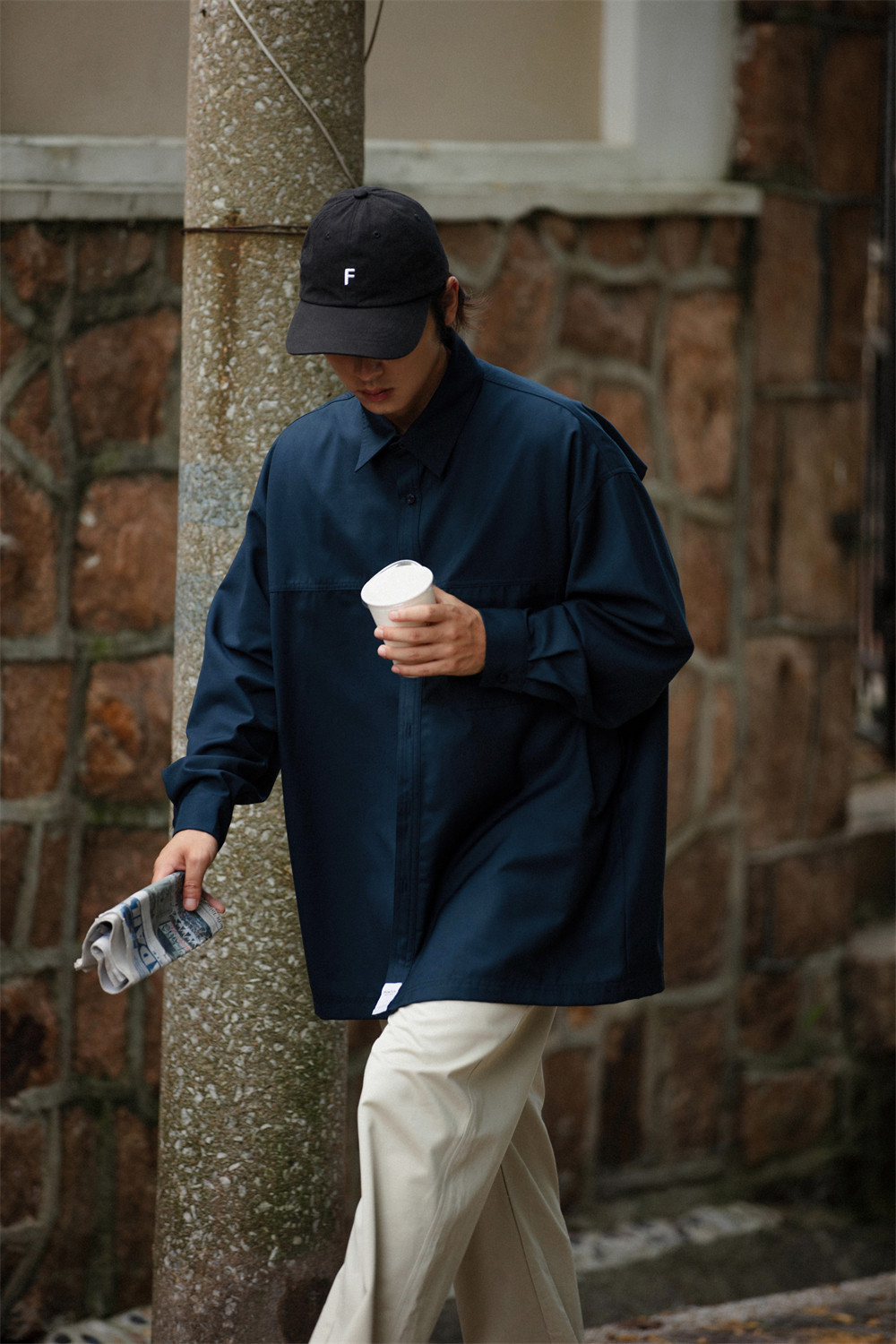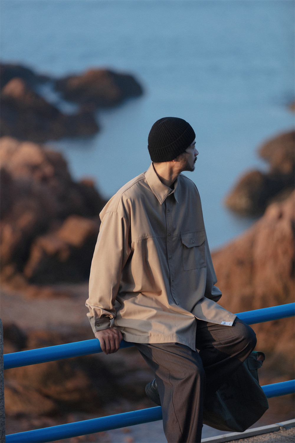 高克重仿毛料面料,具有良好的抗皺性能和垂墜感。版型方面是寬肥的戶外工裝版型,前片做了分割拼接,門襟定制標簽貼標縫制,增加視覺效果。落肩寬闊的版型,滿足戶外穿著的同時,我們在后背設計了風琴鏤空設計,內里采用網眼面料,增加透氣性和視覺效果!