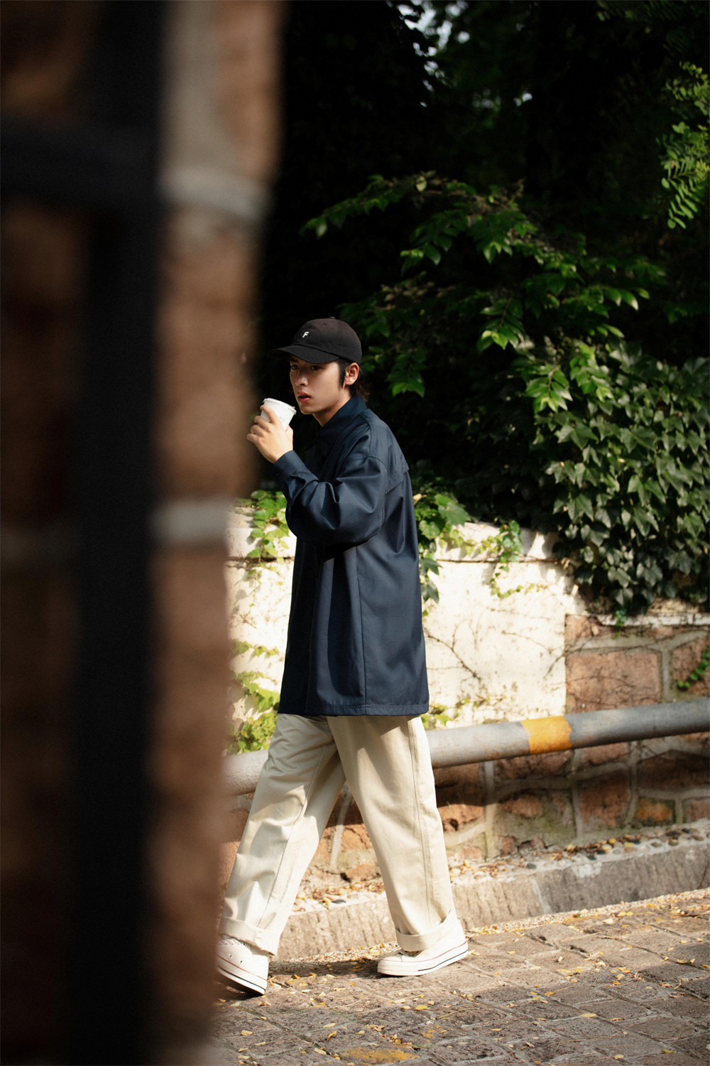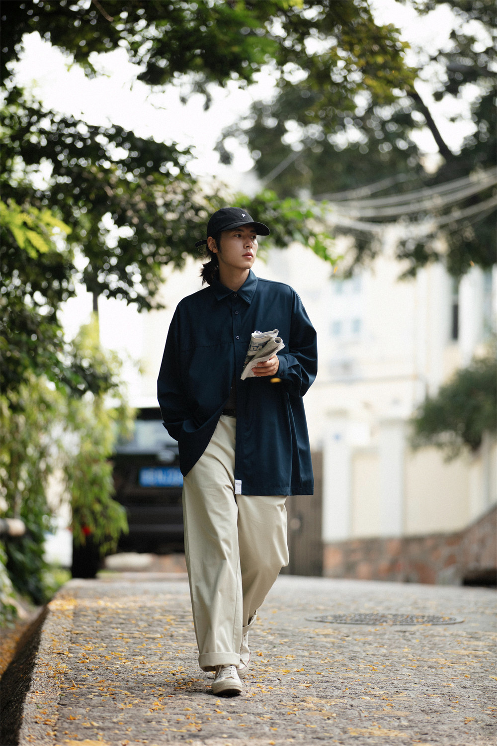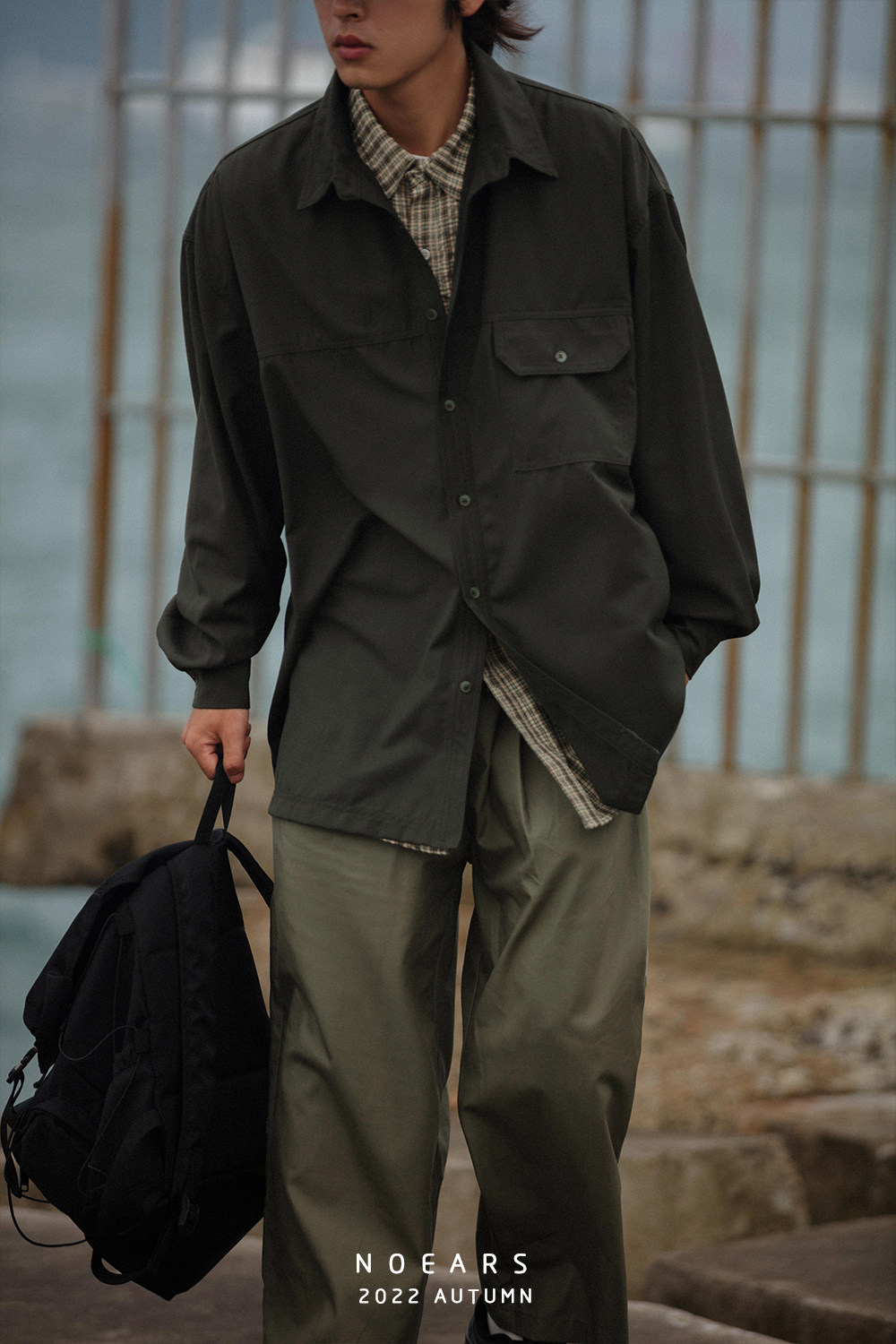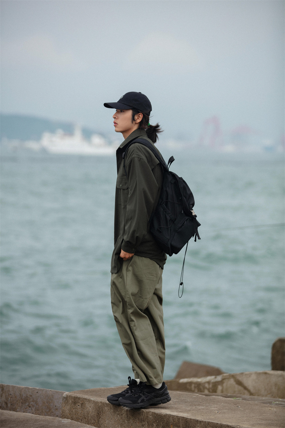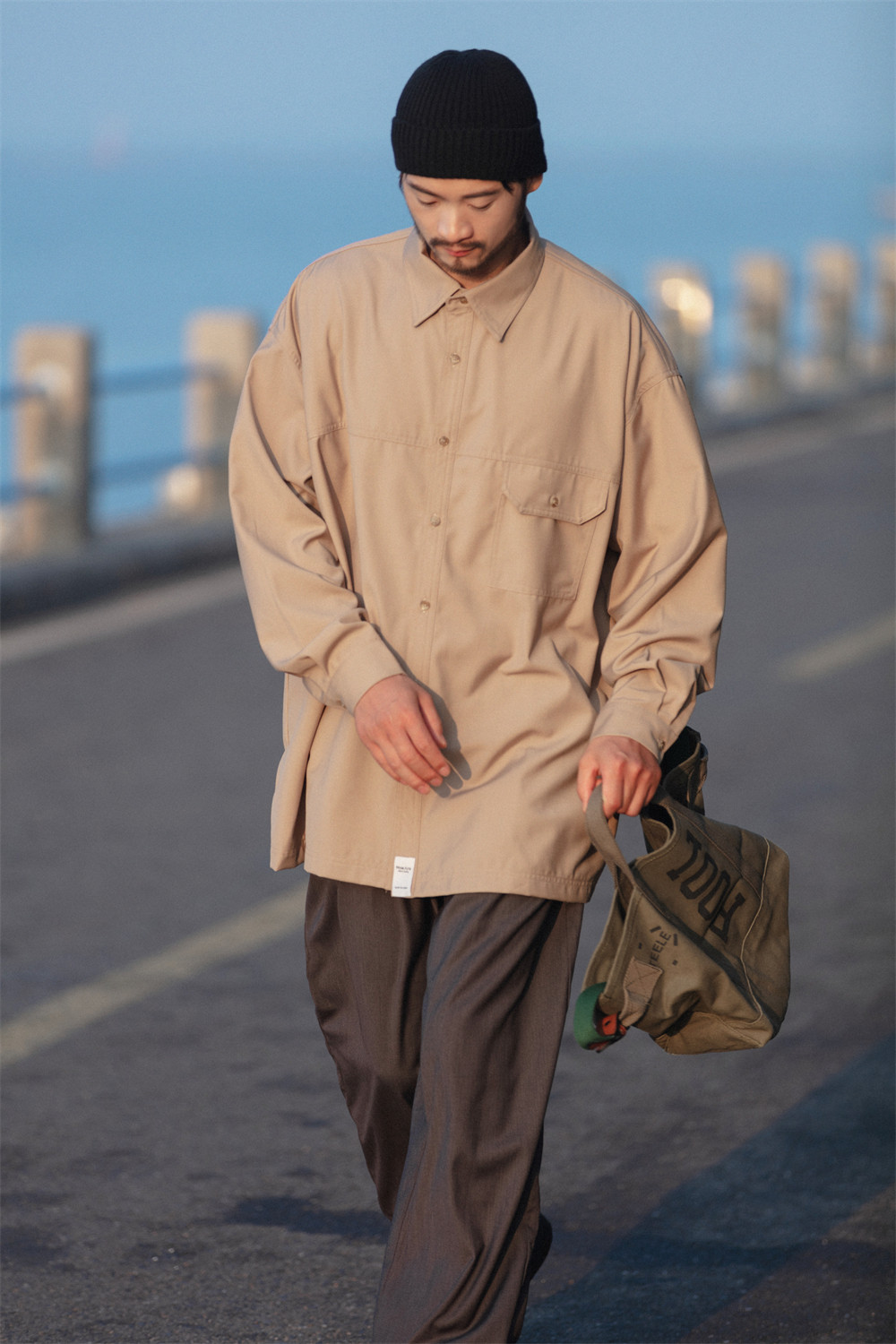 高克重仿毛料面料,具有良好的抗皺性能和垂墜感。版型方面是寬肥的戶外工裝版型,前片做了分割拼接,門襟定制標簽貼標縫制,增加視覺效果。落肩寬闊的版型,滿足戶外穿著的同時,我們在后背設計了風琴鏤空設計,內里采用網眼面料,增加透氣性和視覺效果!