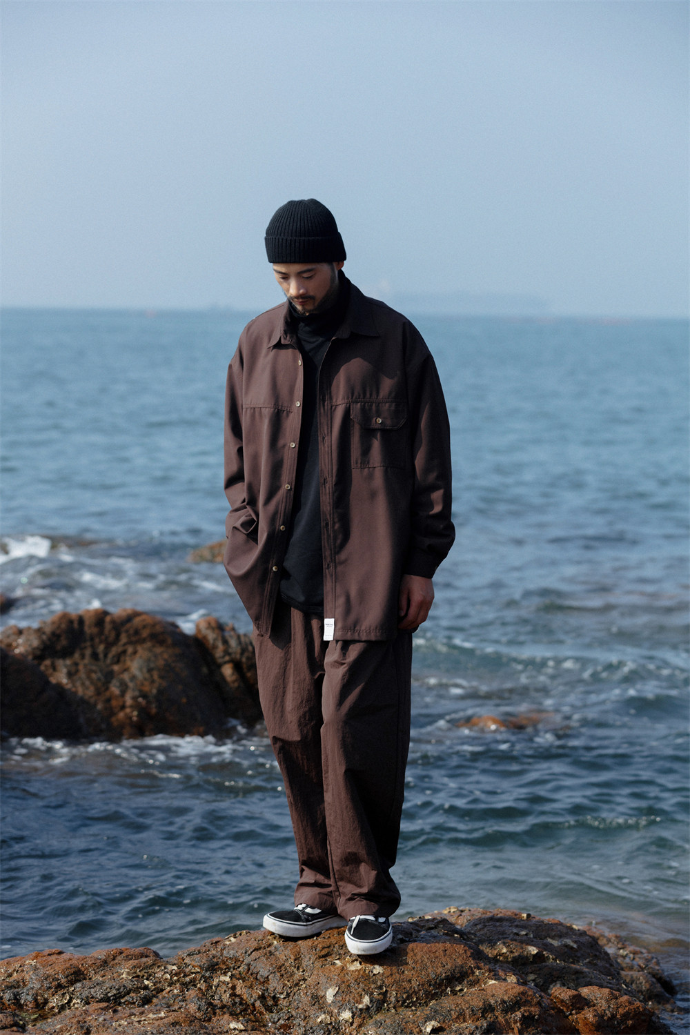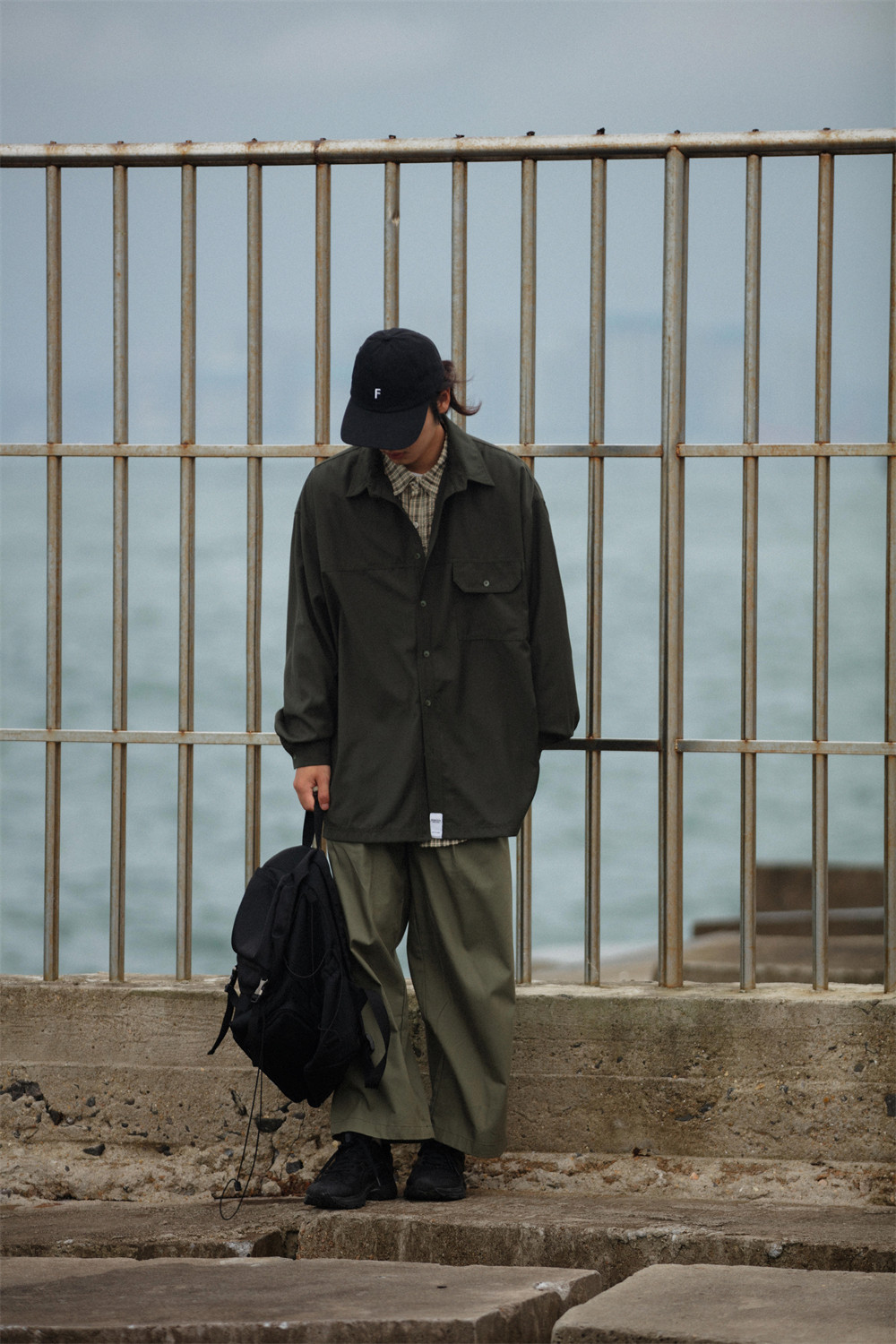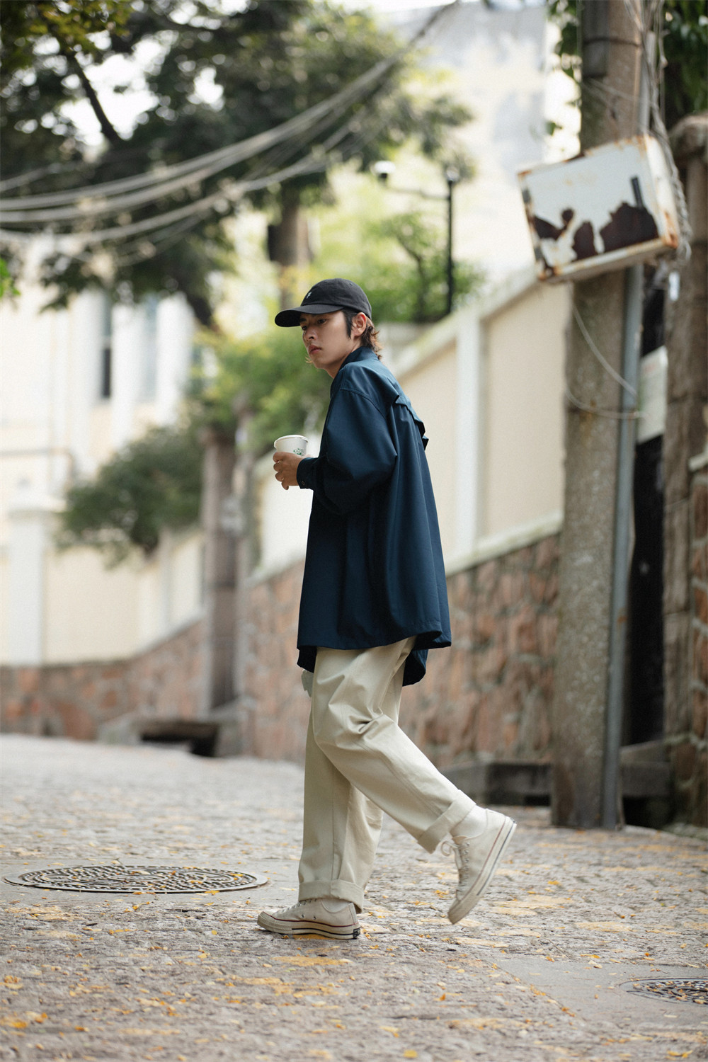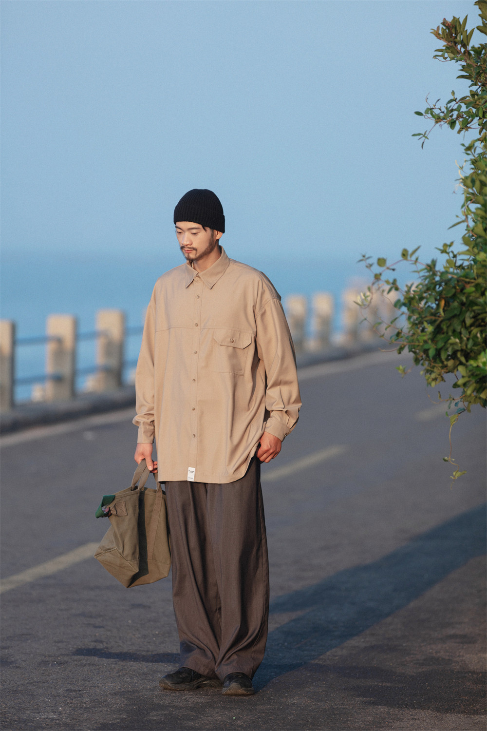 高克重仿毛料面料,具有良好的抗皺性能和垂墜感。版型方面是寬肥的戶外工裝版型,前片做了分割拼接,門襟定制標簽貼標縫制,增加視覺效果。落肩寬闊的版型,滿足戶外穿著的同時,我們在后背設計了風琴鏤空設計,內里采用網眼面料,增加透氣性和視覺效果!