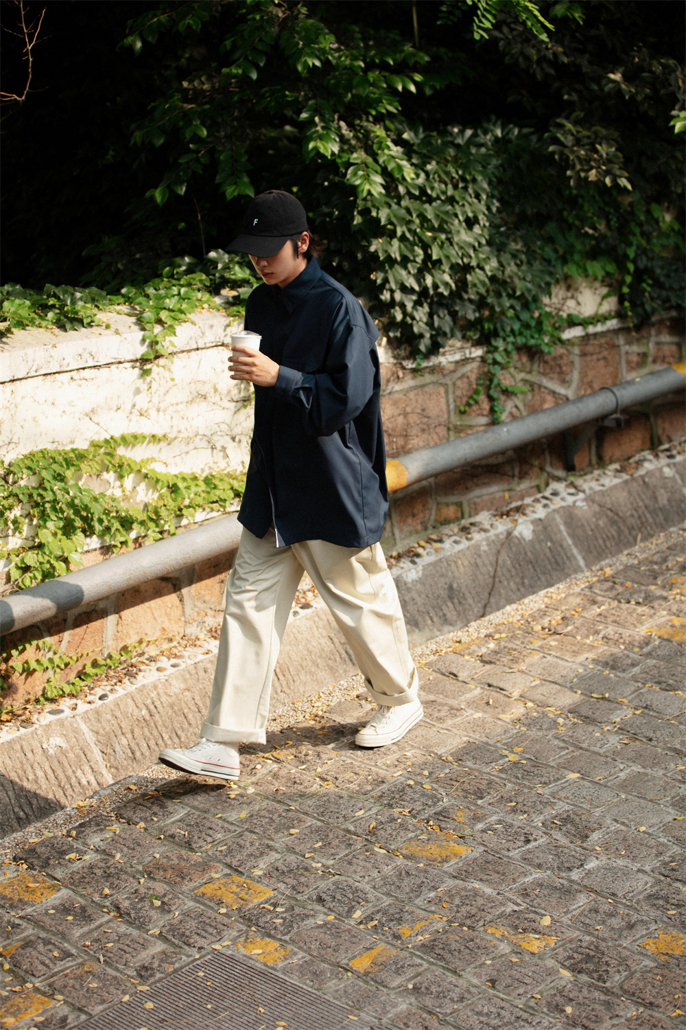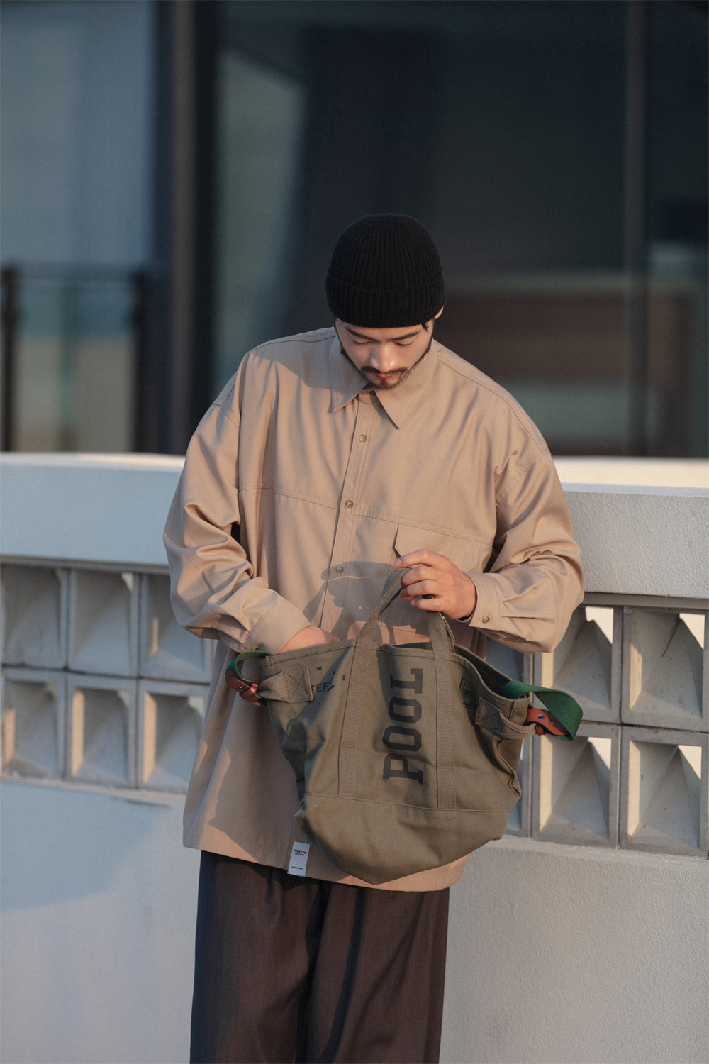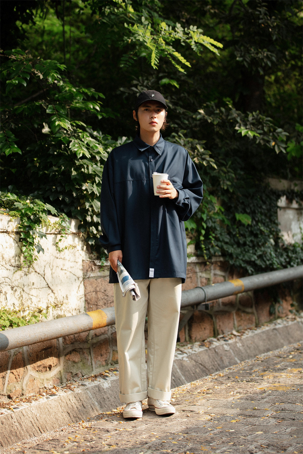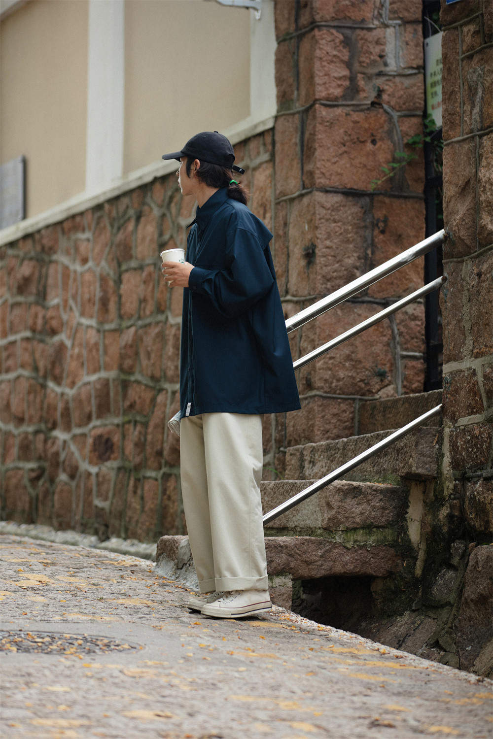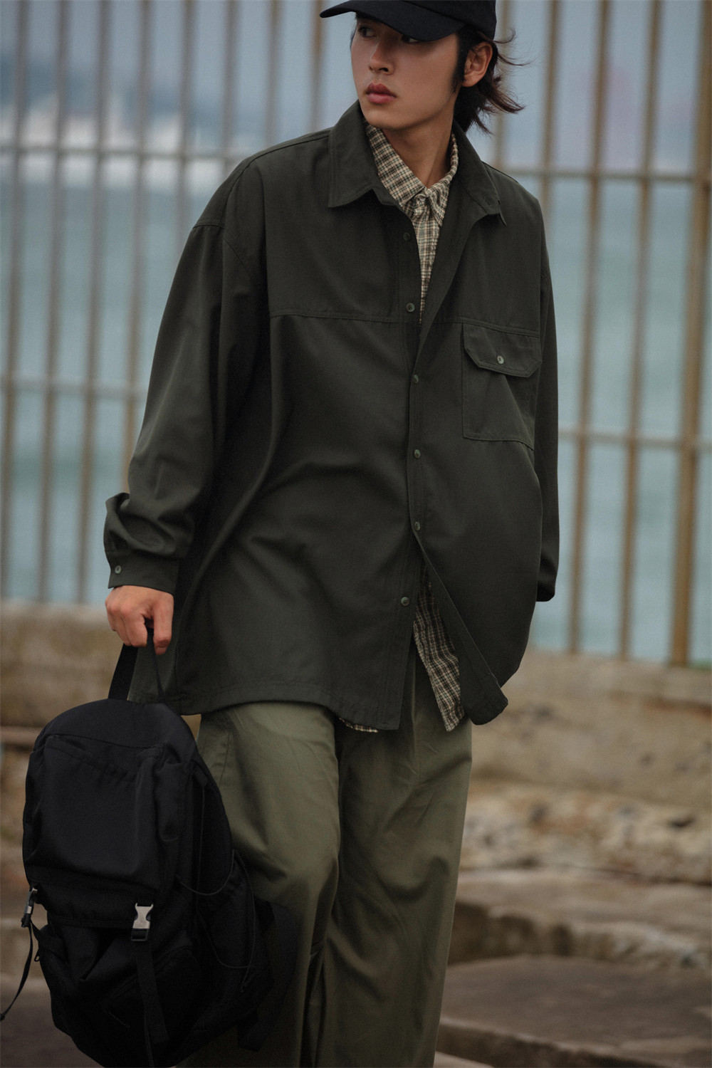 高克重仿毛料面料,具有良好的抗皺性能和垂墜感。版型方面是寬肥的戶外工裝版型,前片做了分割拼接,門襟定制標簽貼標縫制,增加視覺效果。落肩寬闊的版型,滿足戶外穿著的同時,我們在后背設計了風琴鏤空設計,內里采用網眼面料,增加透氣性和視覺效果!