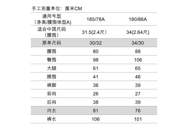 如圖所示其他尺碼以此類推:34/30=腰圍/內長
