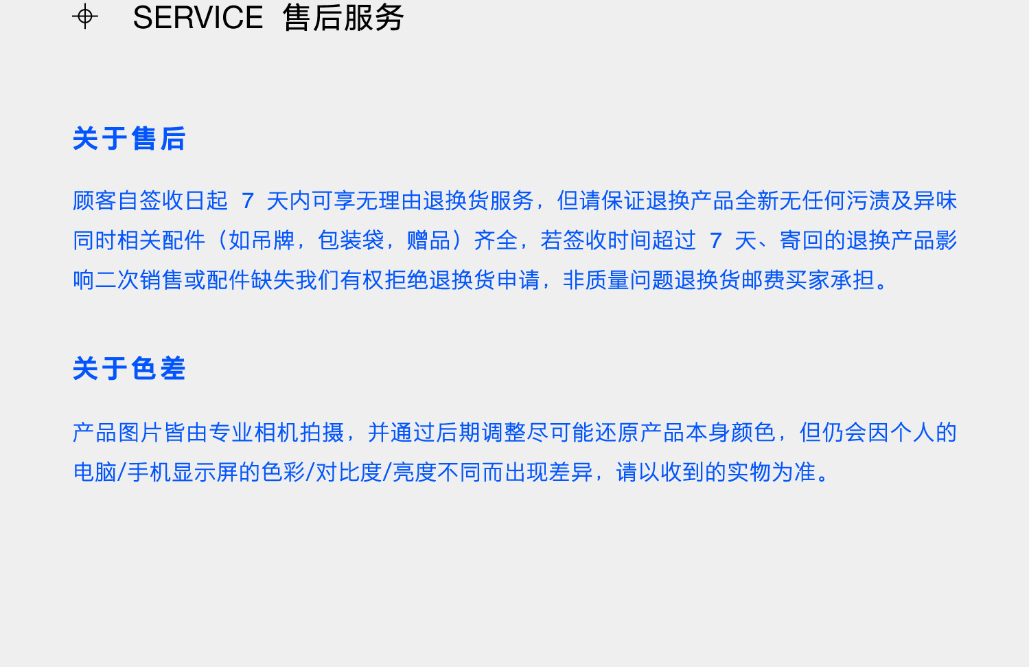 海外代購是依照消費者要求而提供協助購買商品之服務,係屬於「客製化給付」,依據《通訊交易解除權合理例外情事適用準則》規定不適用《消費者保護法第19條》鑑賞期規定。一旦訂單進入「已出貨」狀態,即無法取消訂單。收到商品後,若與預期不符,亦無法申請退貨或退款。 - 瑕疵商品退換貨規定