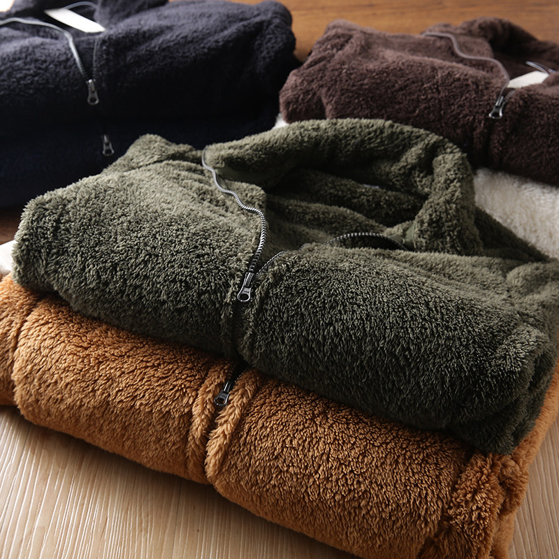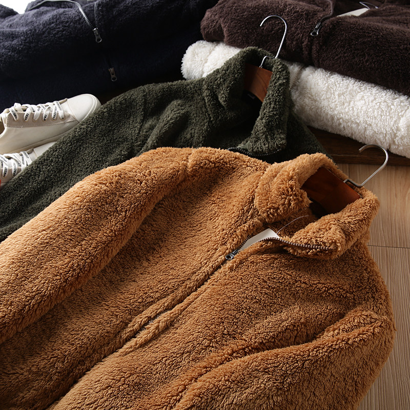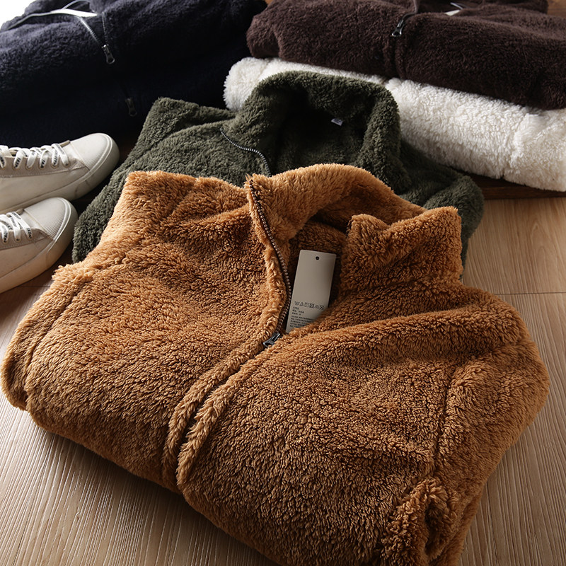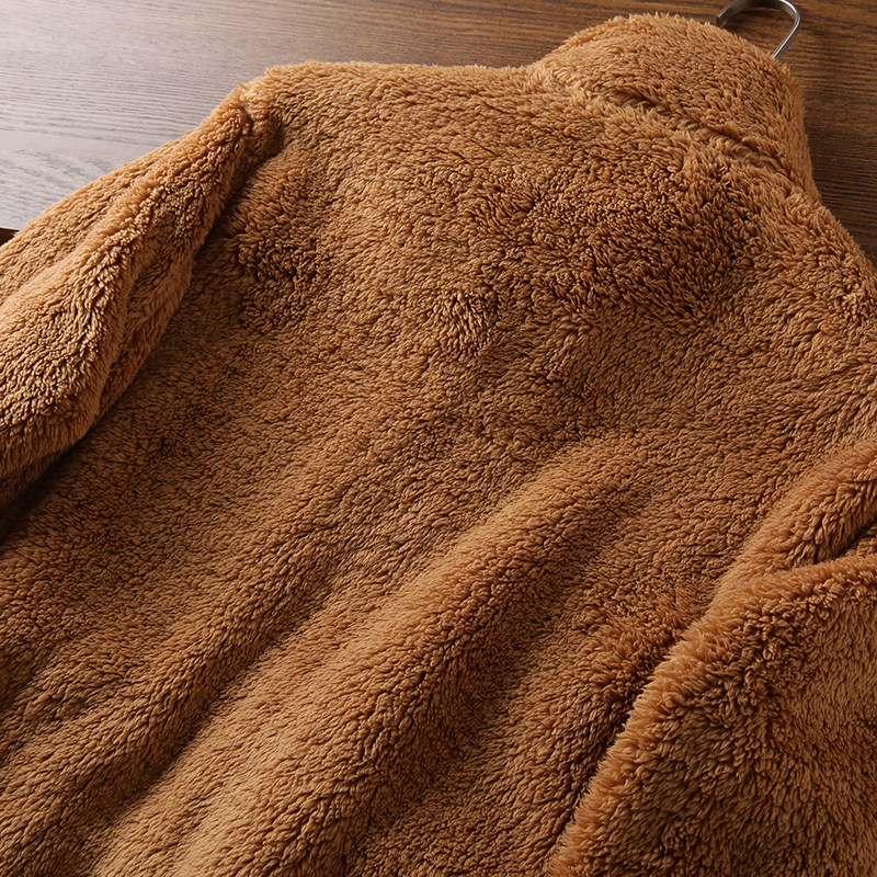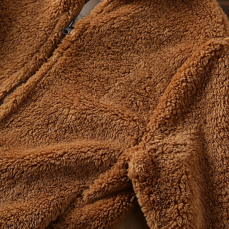 人造羊羔絨面料,非常輕柔,非常細膩,上身舒適感強,保暖性好