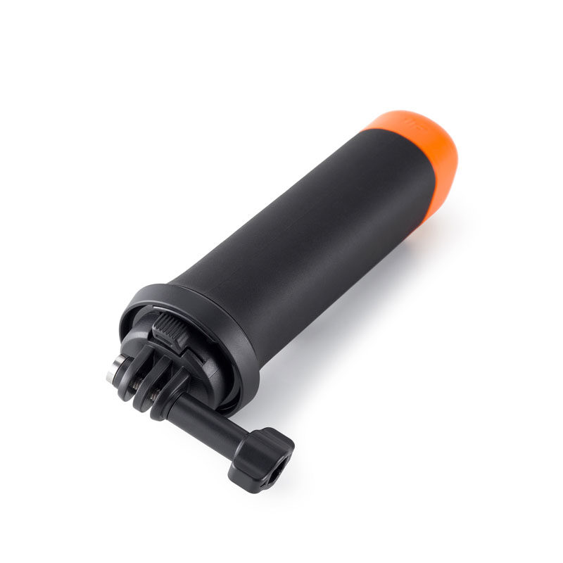 防滑握把,手感舒適。中空設計,讓相機在水中保持漂浮狀態。通用接口,拆卸簡易,可快速與防水殼牢固連接。底部 1/4" 螺紋孔可轉接三腳架等配件。