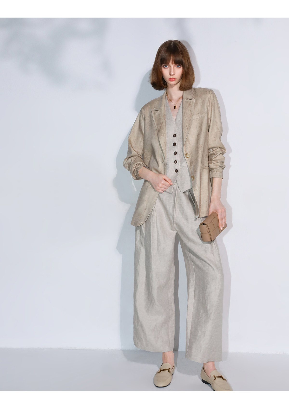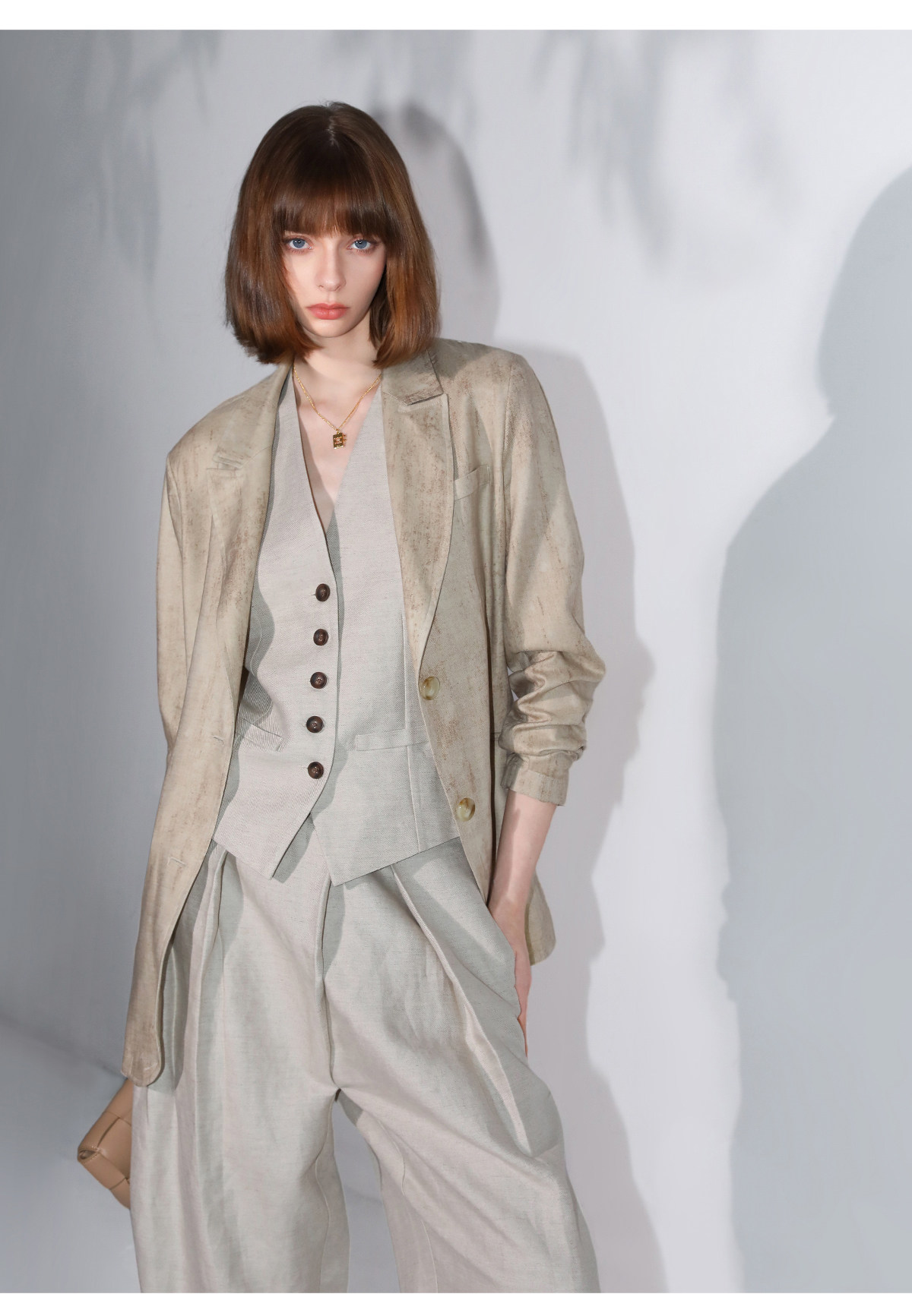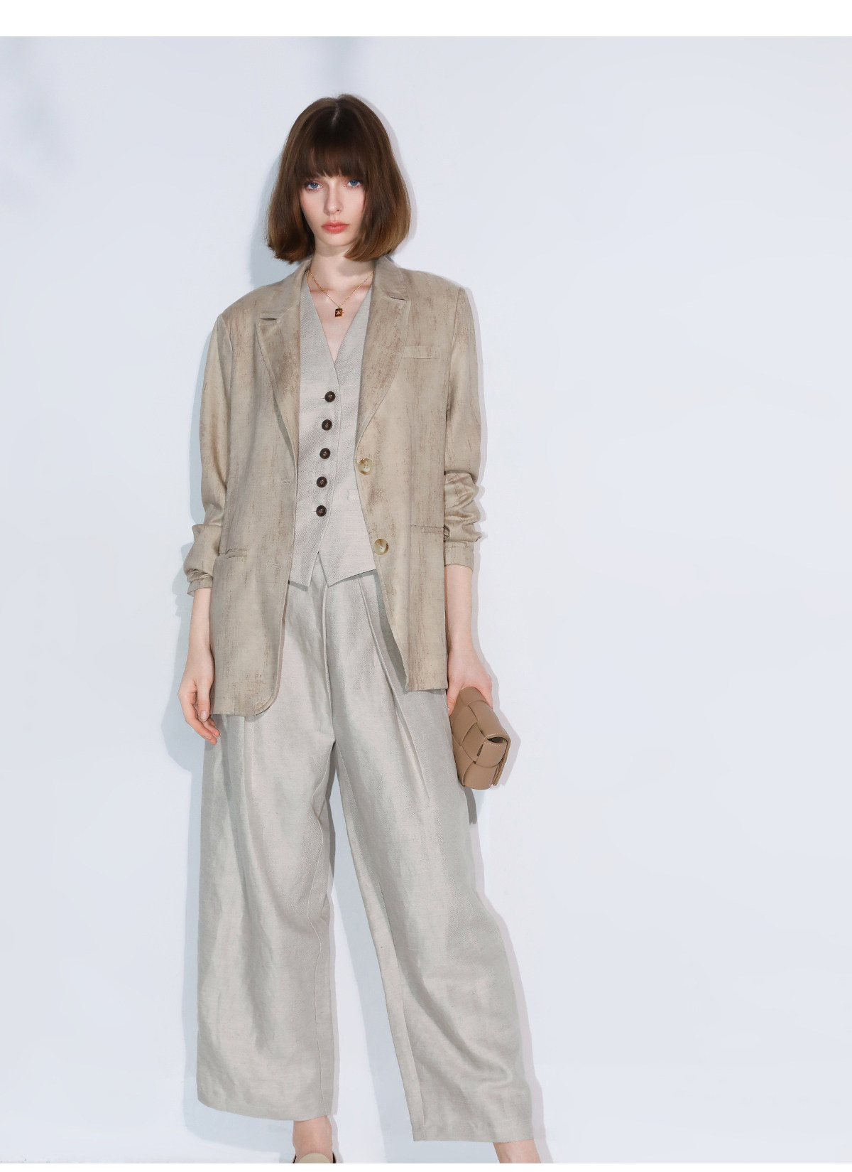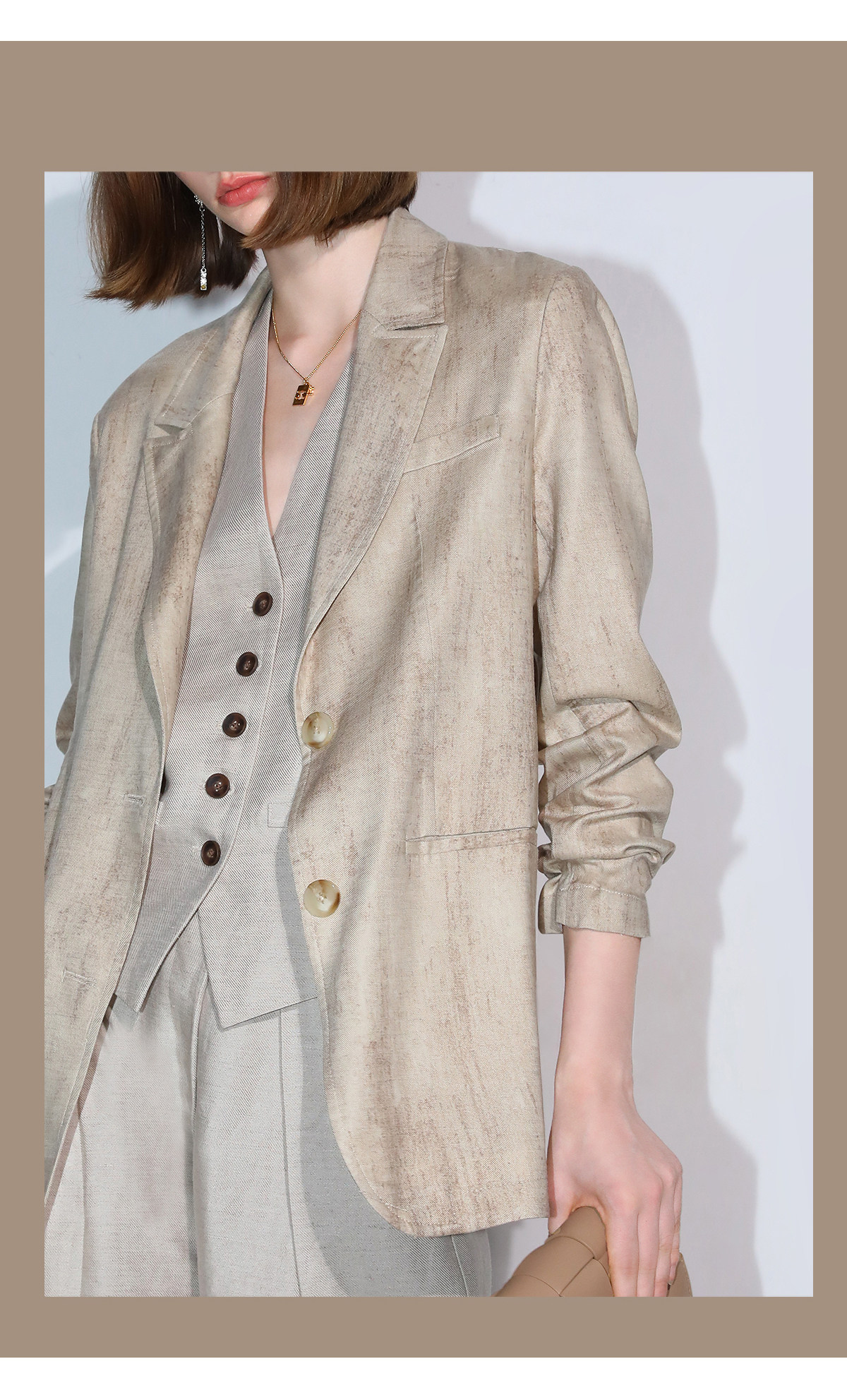 西裝:首批:面料:亞麻50% 粘纖50% 里料:聚酯纖維100%
