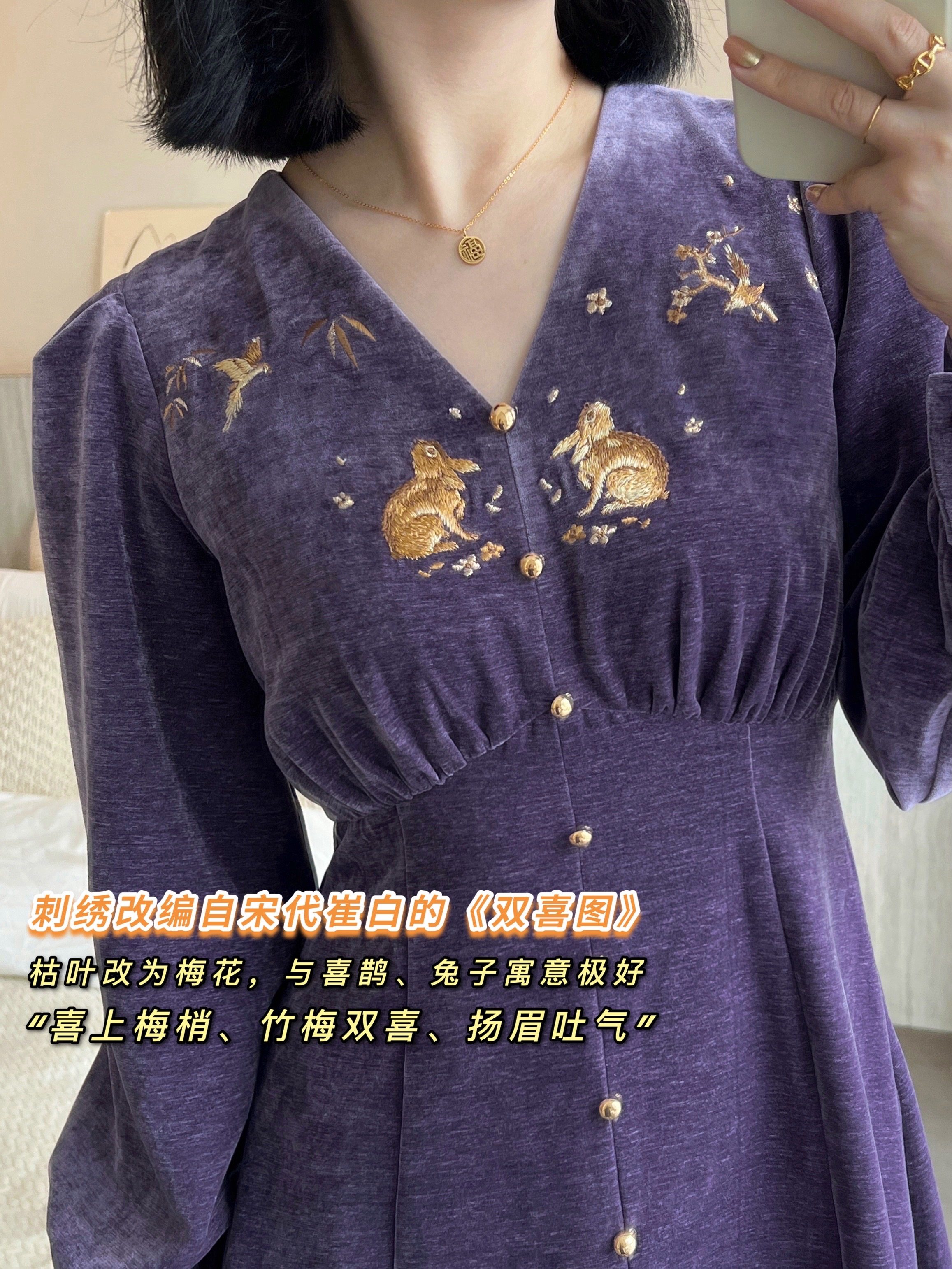 在大V領的襯托下,配上金絲線的繡花