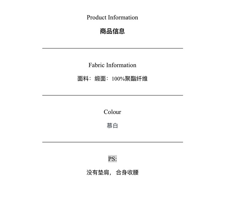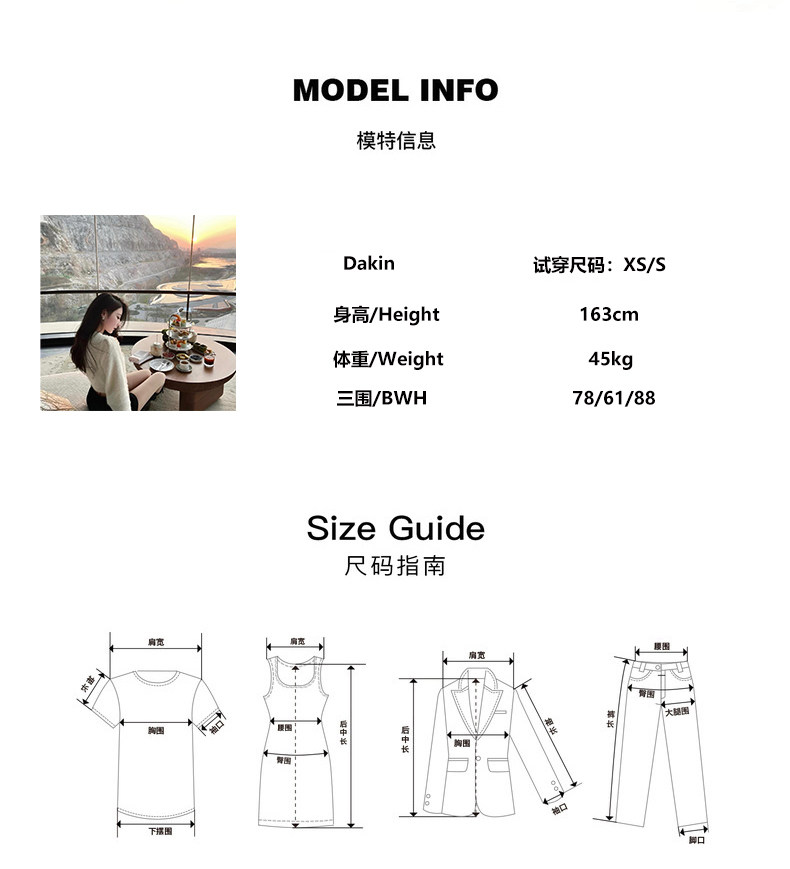 | 試穿者 | 身高/體重/肩寬 | 體型特征 | 三圍 | 常穿尺碼 | 試穿尺碼 | |