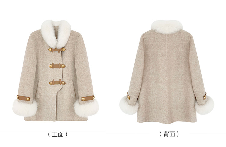 袖口拼接狐貍毛 搭配扣袢 與門襟相呼應