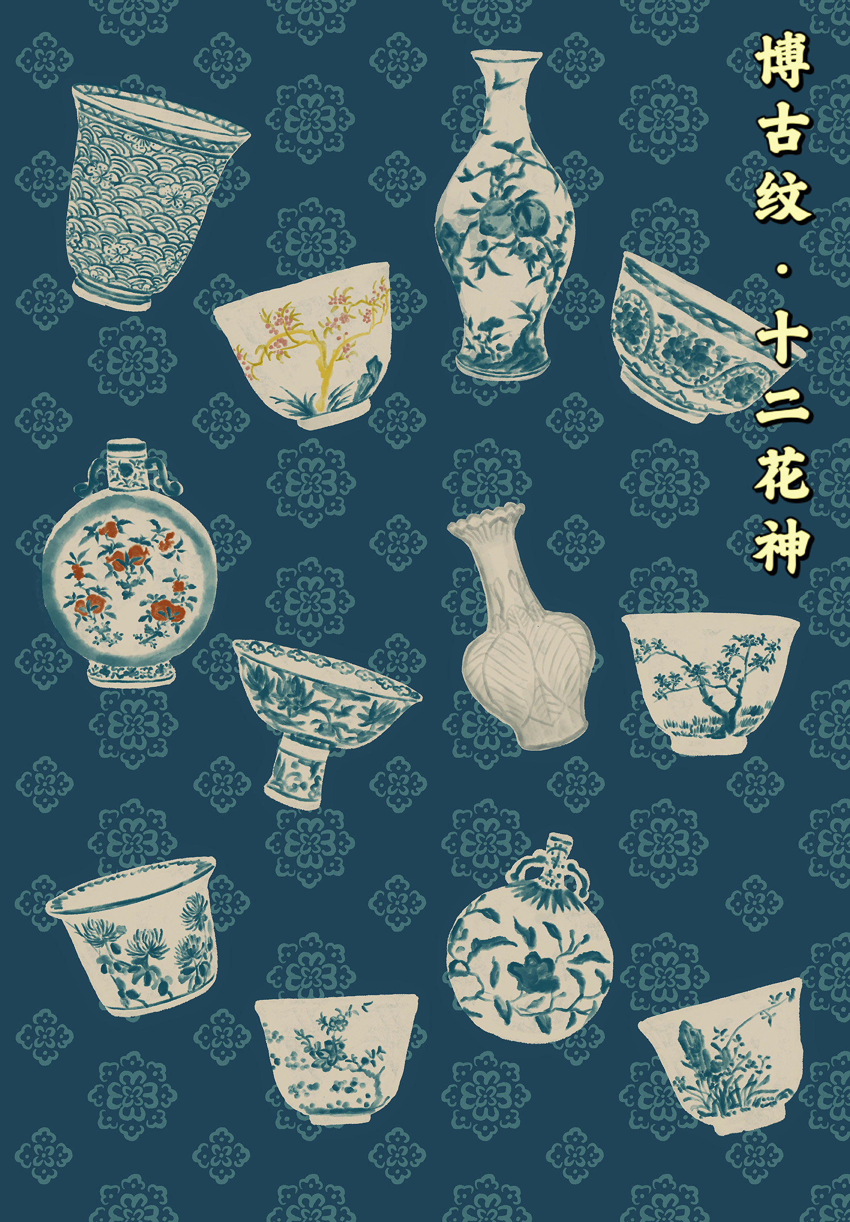 原創 中國傳統博古紋·十二花神瓷器印花
