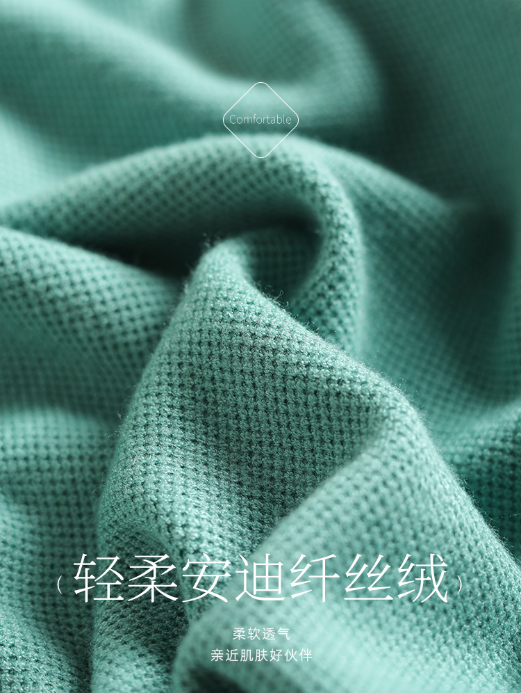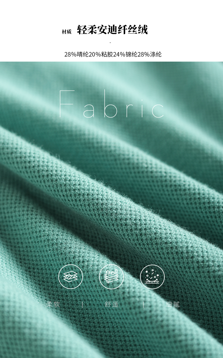 | 輕柔安迪纖絲絨面料 紗線條感均勻、細致,細度和強度都高于材質 不易起球、不易褶皺,打理起來很方便 紋理平實細密,親膚的質感保持在線 擁有著優越的吸濕性和透氣性 穿在身上不會有絲毫的負擔 在給予你柔軟舒服的穿著體驗感這一范疇上 它的表現力一直是專業&優越的~ 是非常經典的篙階手感,帶著有底蘊的自信張力! | |||||||||||||||