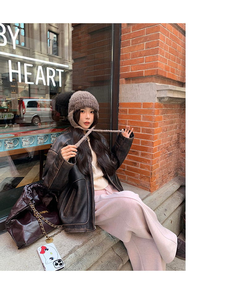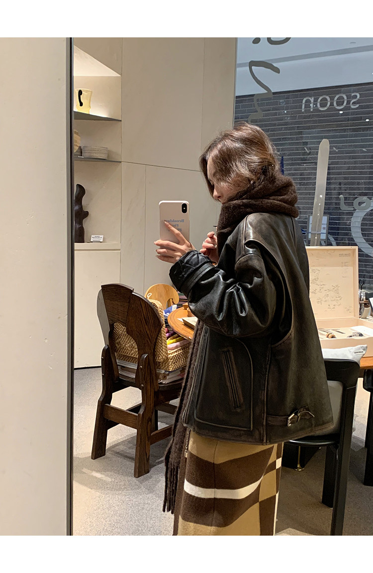 時髦古著風復古擦色蠟感羊皮夾克,演繹新一季的