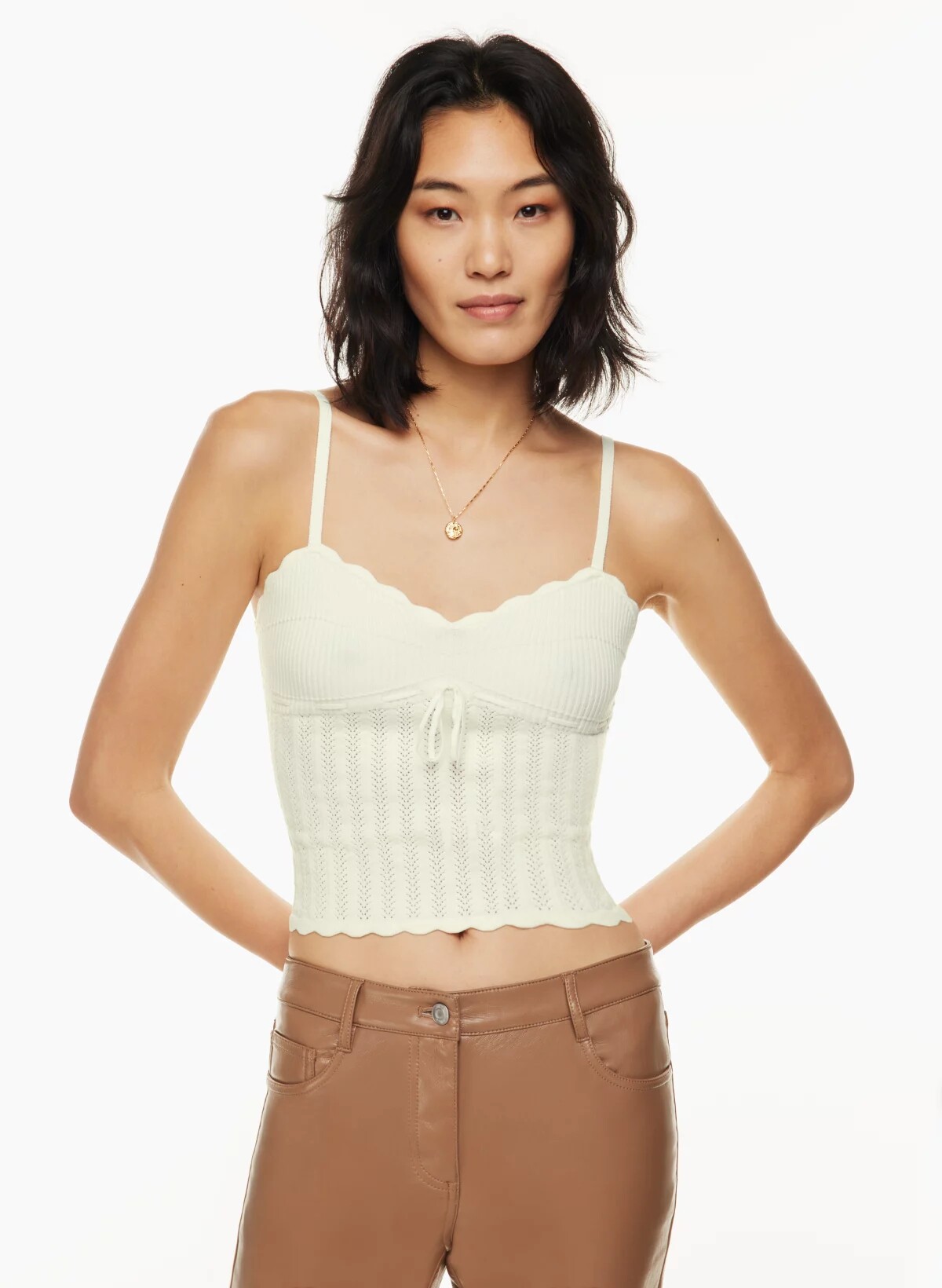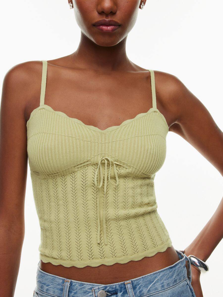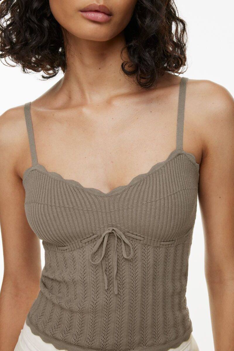 帶有扇形邊緣、可調節肩帶和胸前系帶細節。