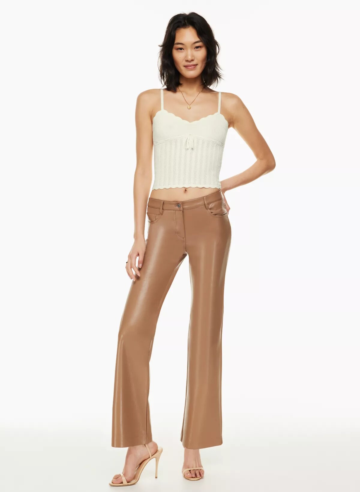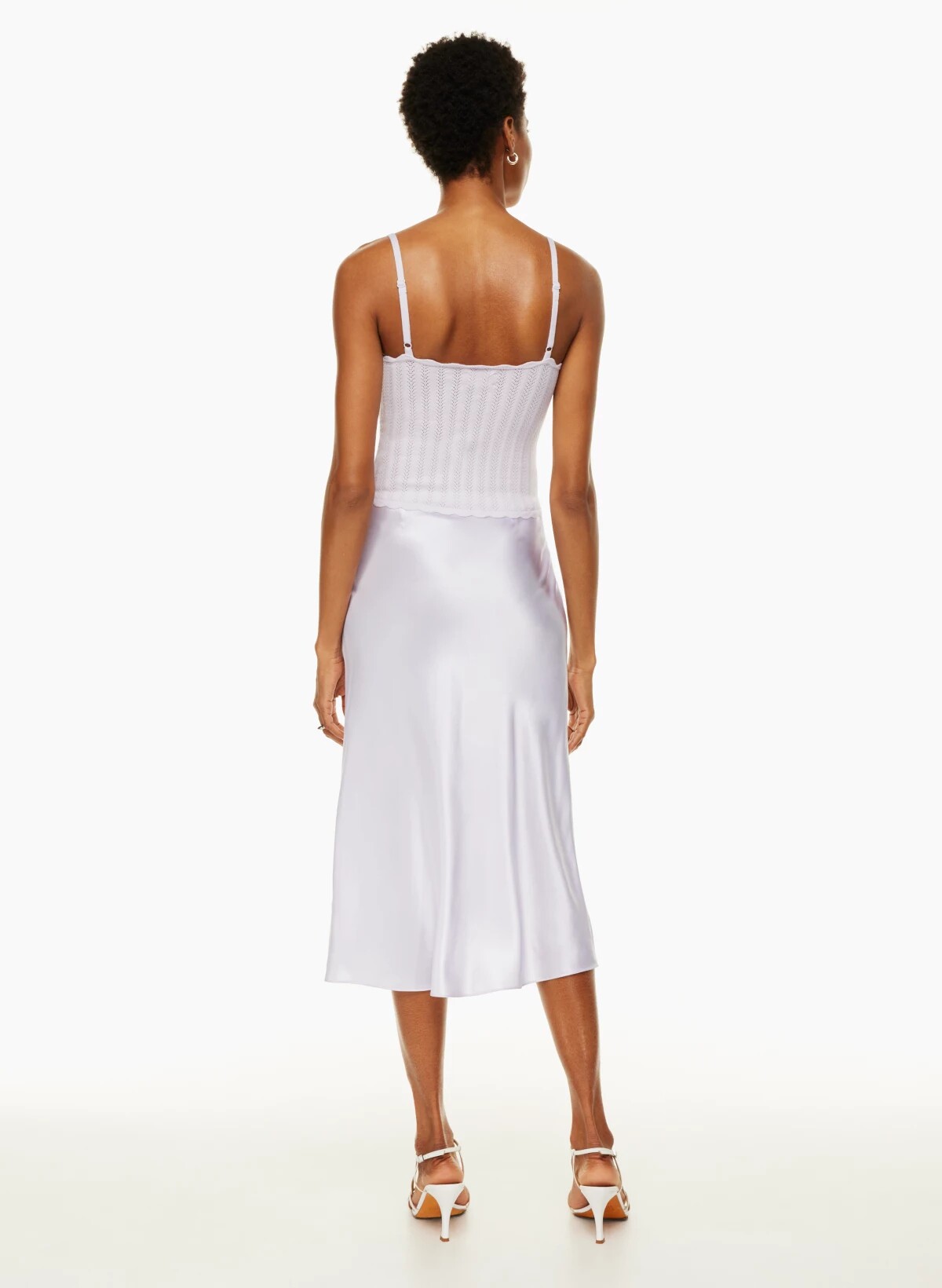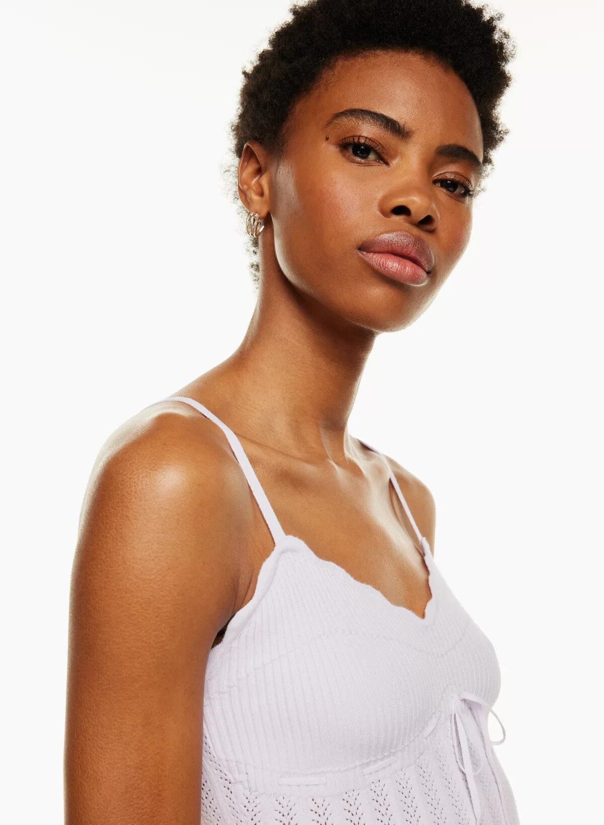 帶有扇形邊緣、可調節肩帶和胸前系帶細節。