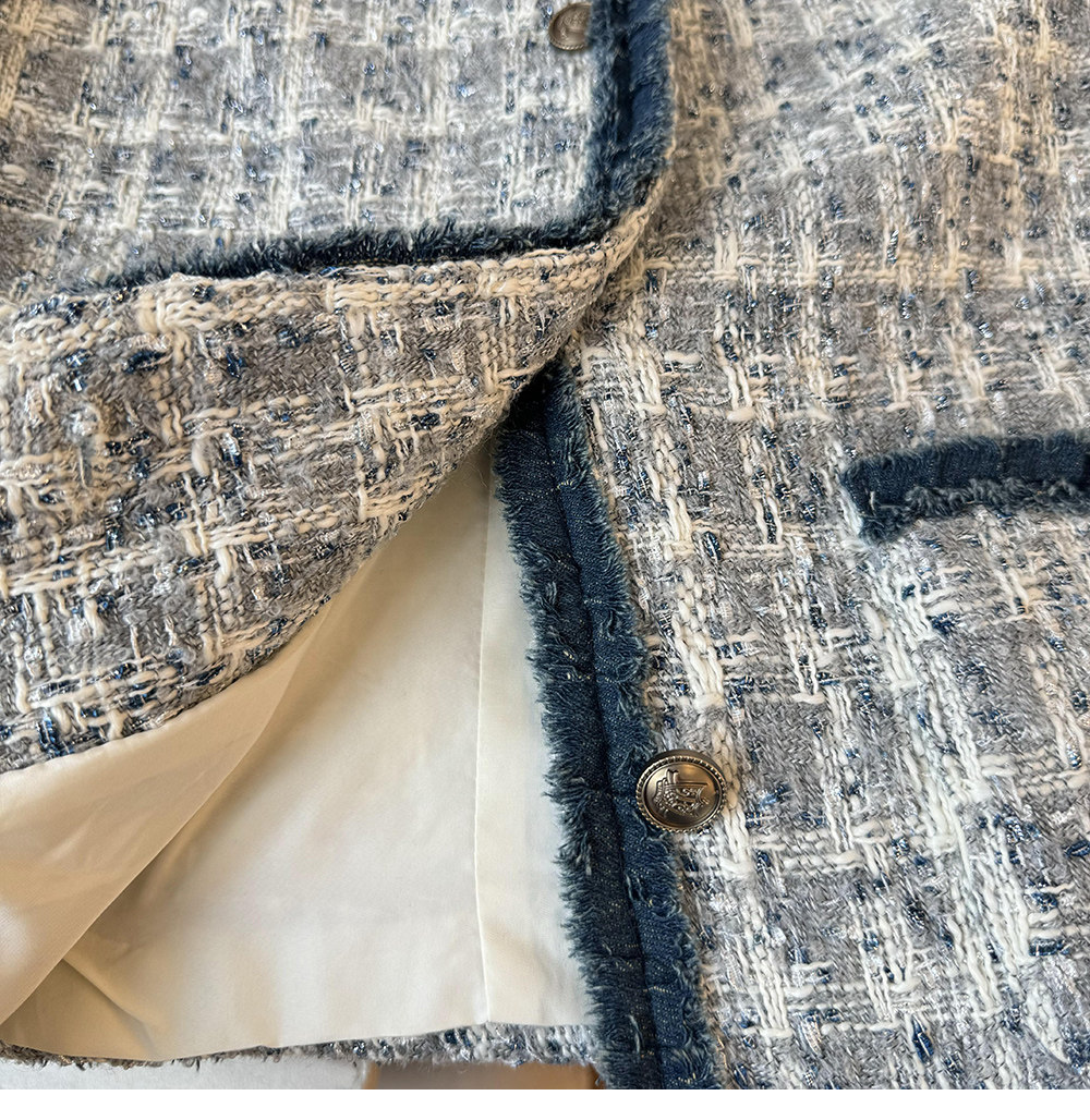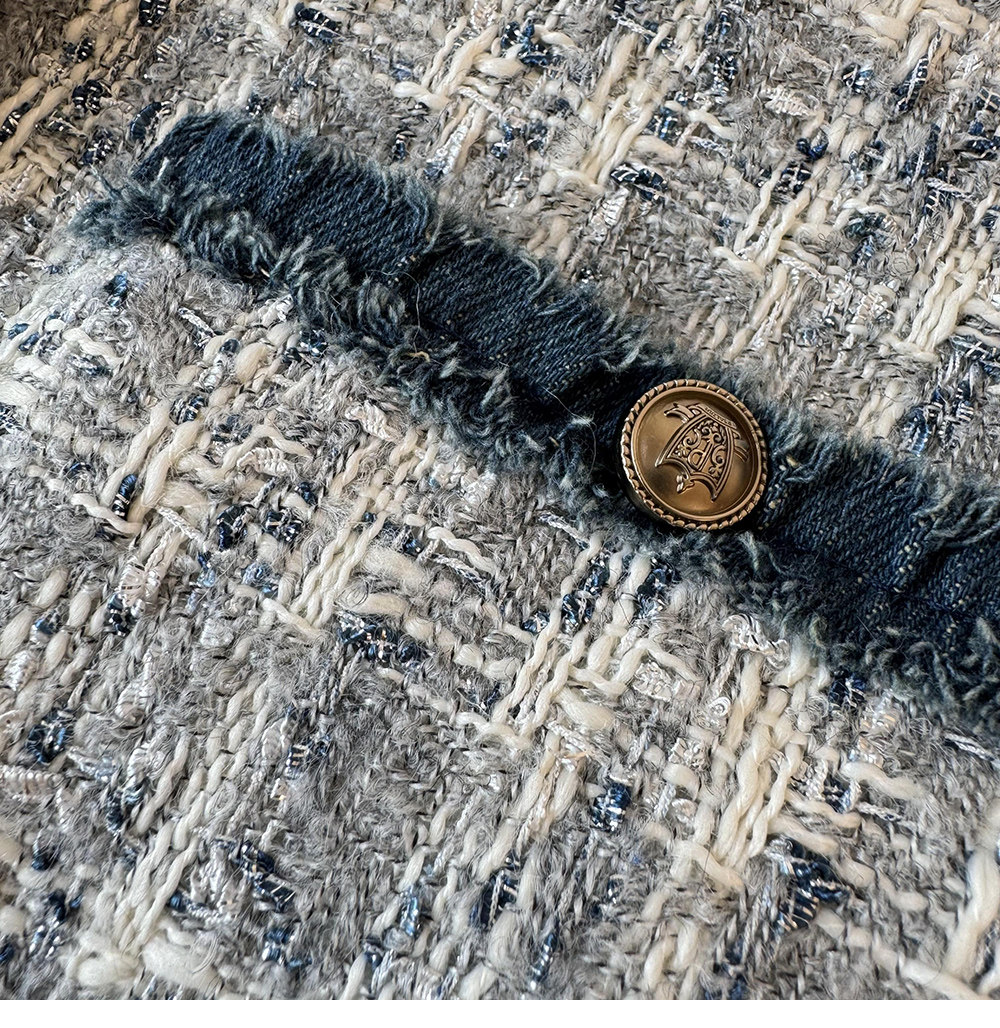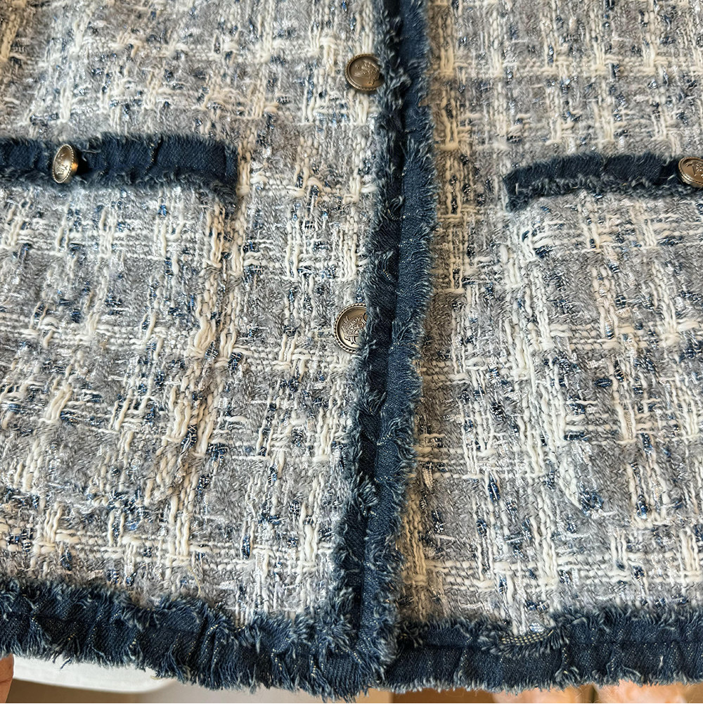 面料:亮絲編織羊毛粗花呢面料【20%羊毛 80%聚酯纖維】有里襯 透氣親服 【牛仔拼邊撞色 高級毛邊設計】 | 厚度:適中 |