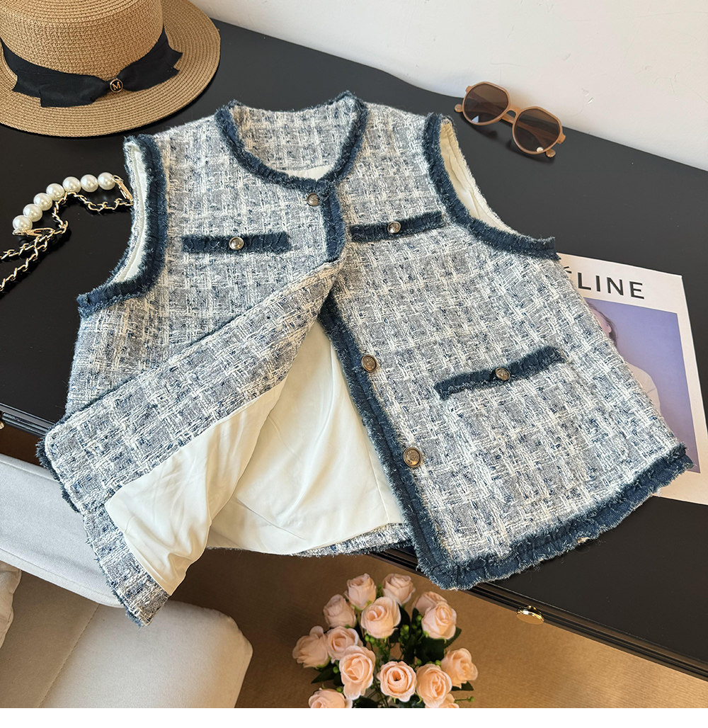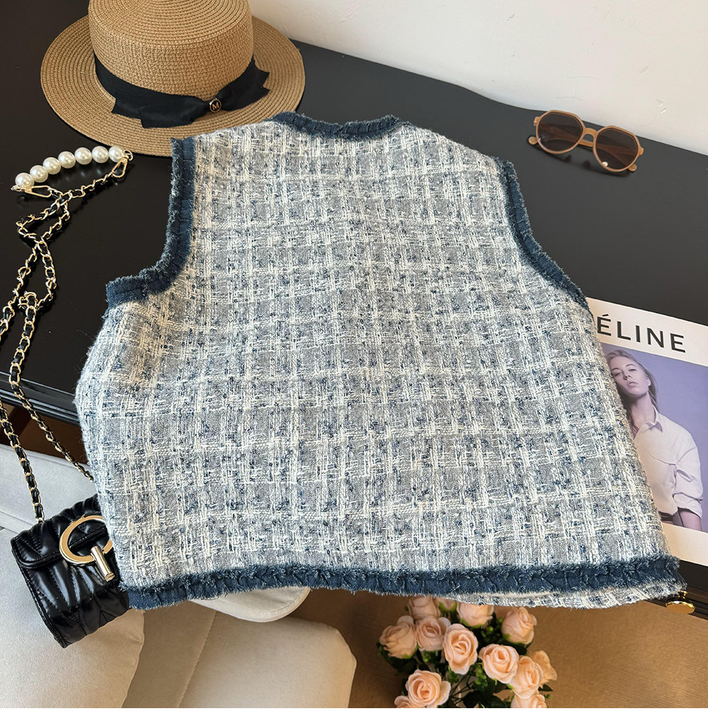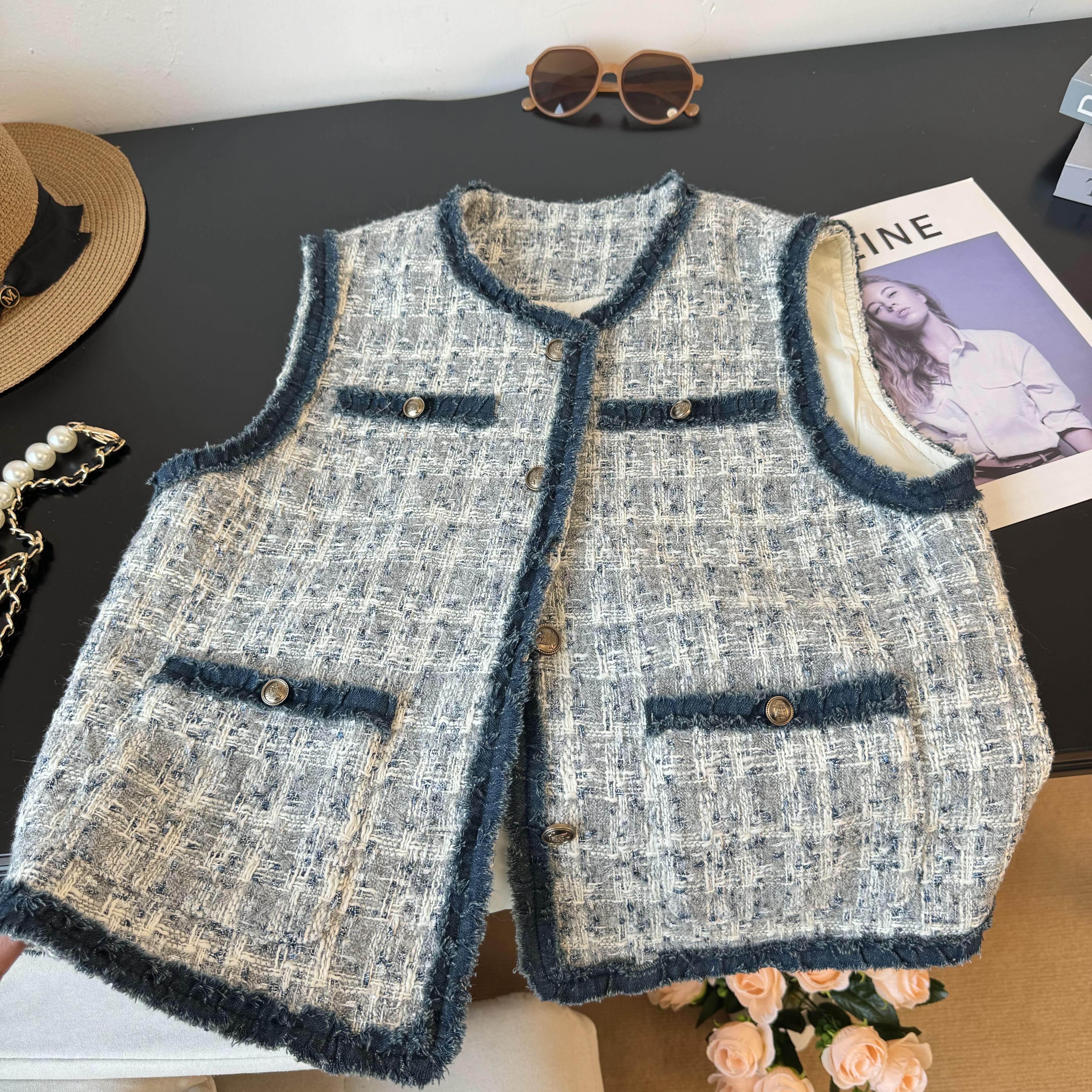 品名:牛仔鑲邊撞色毛邊亮絲小香風單排扣 馬甲 | 版型:寬松 |