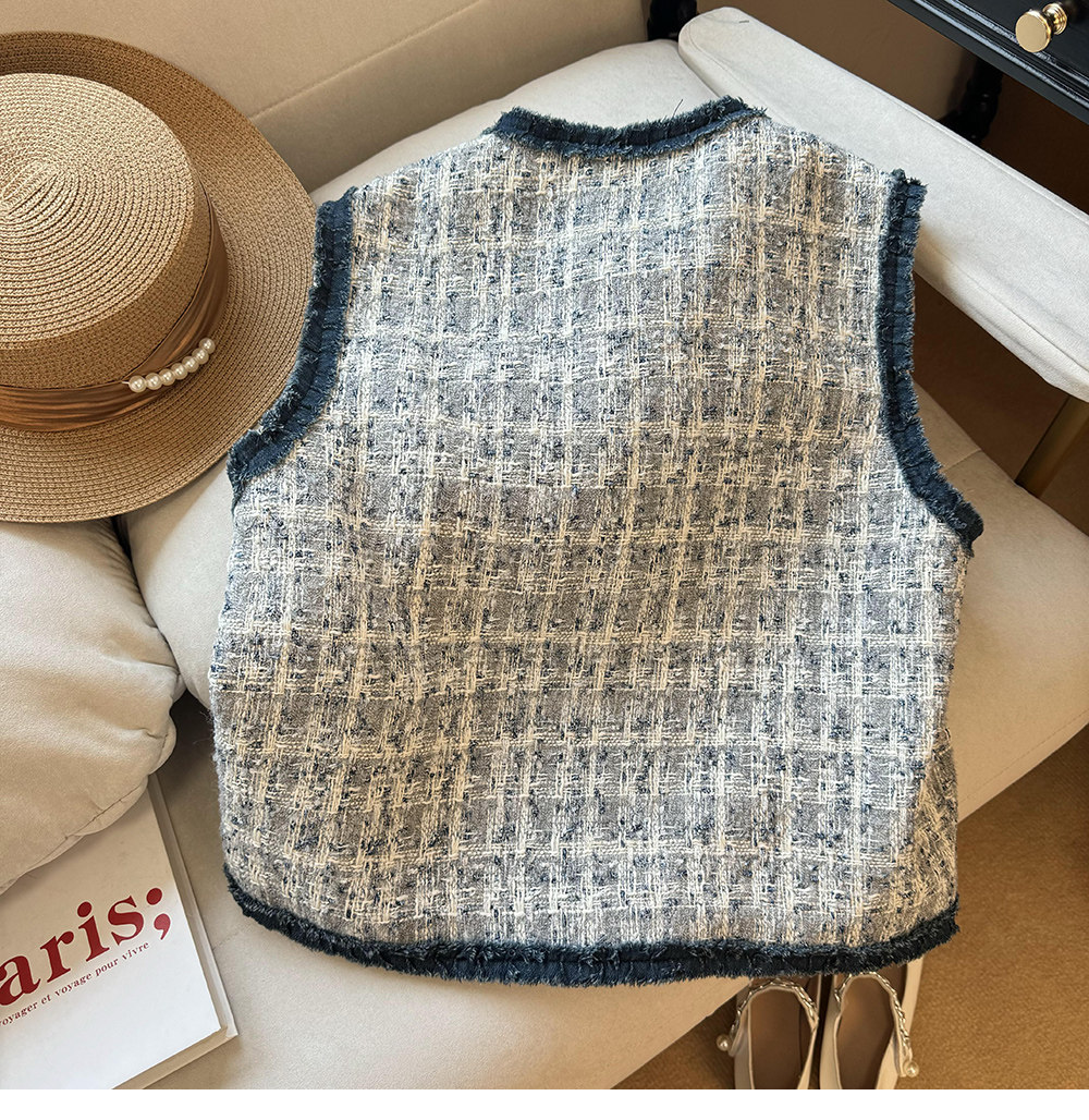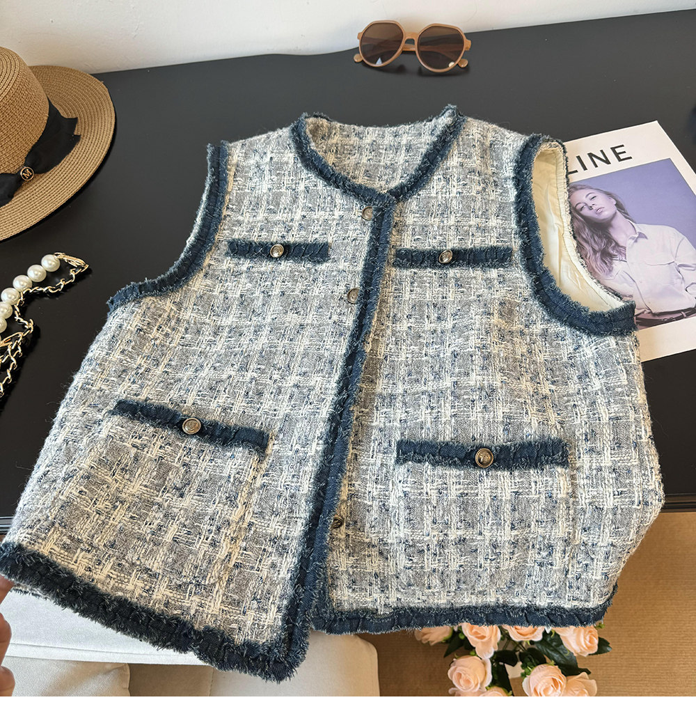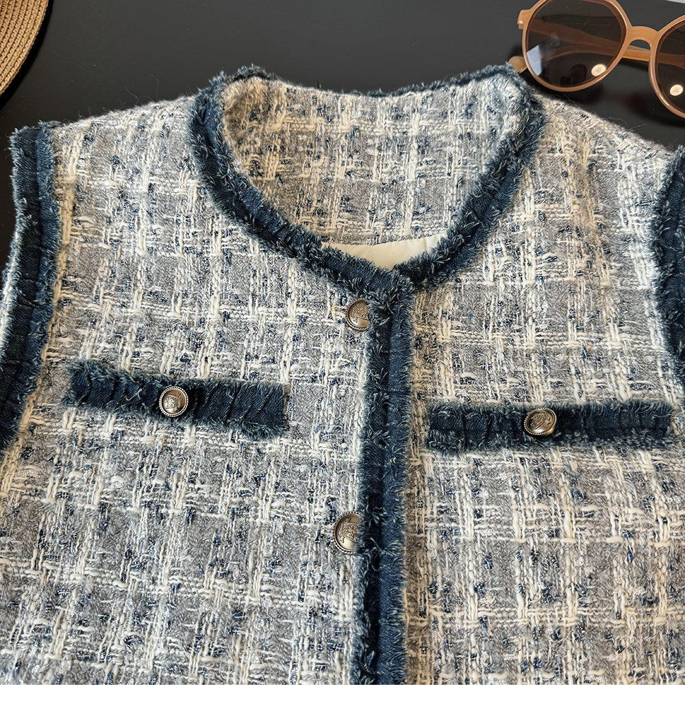 品名:牛仔鑲邊撞色毛邊亮絲小香風單排扣 馬甲 | 版型:寬松 |