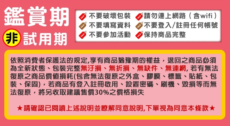 .退貨限制:完整配件及贈品完整包裝,產品完整無刮傷或分解,包材完整無遺失