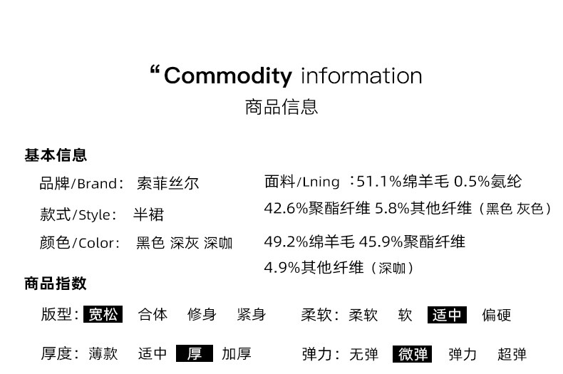 黑色面料一:51.1%綿羊毛42.6%聚酯纖維5.8%其他纖維0.5%氨綸