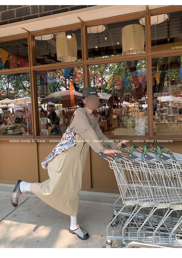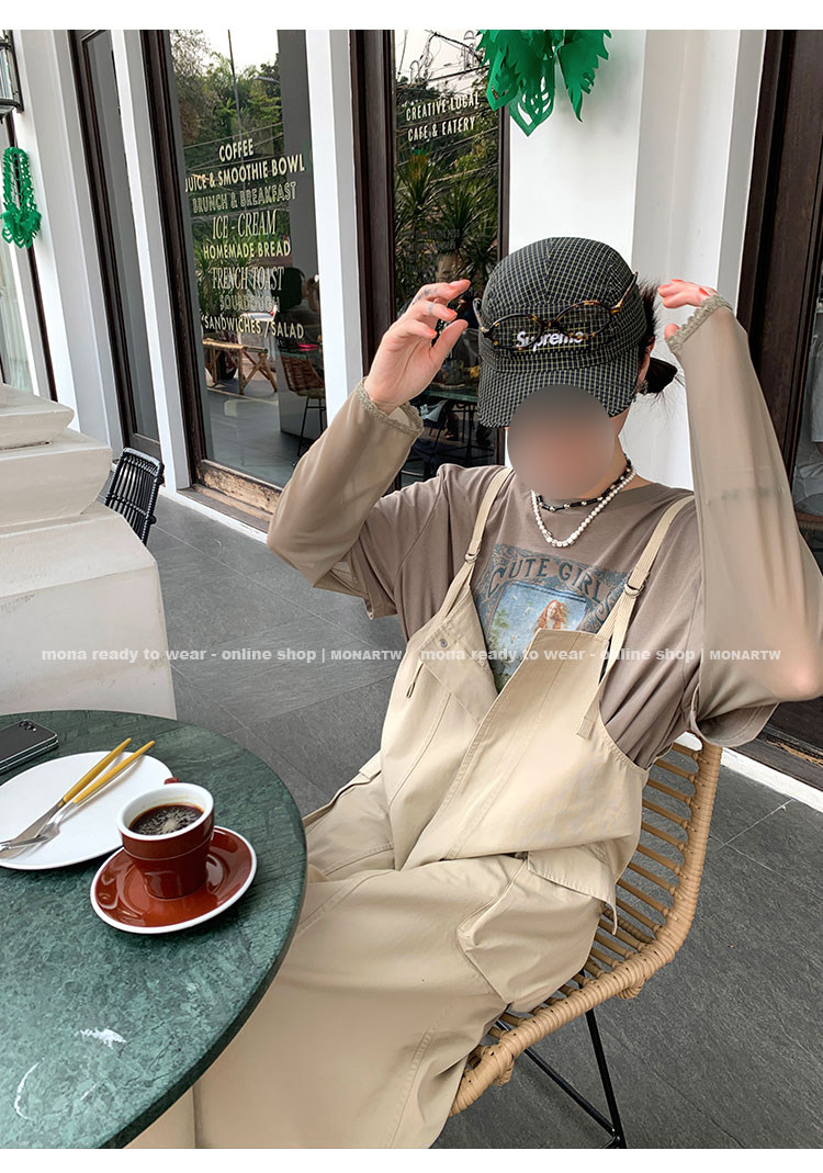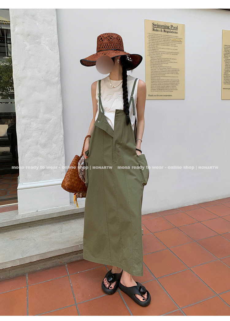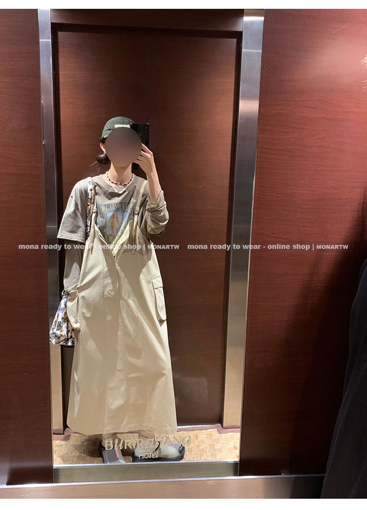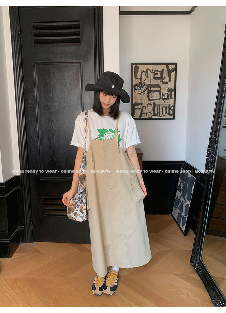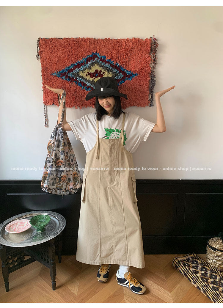 大口袋直筒型背帶褲,裙身呈H型輪廓,遮肉顯瘦