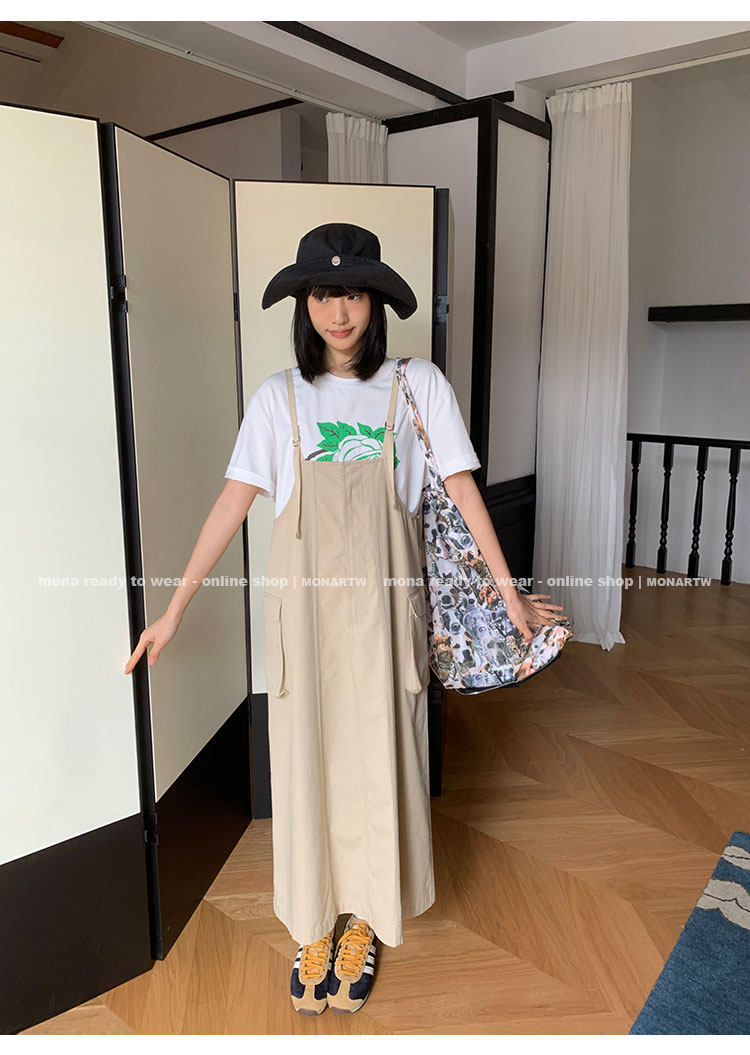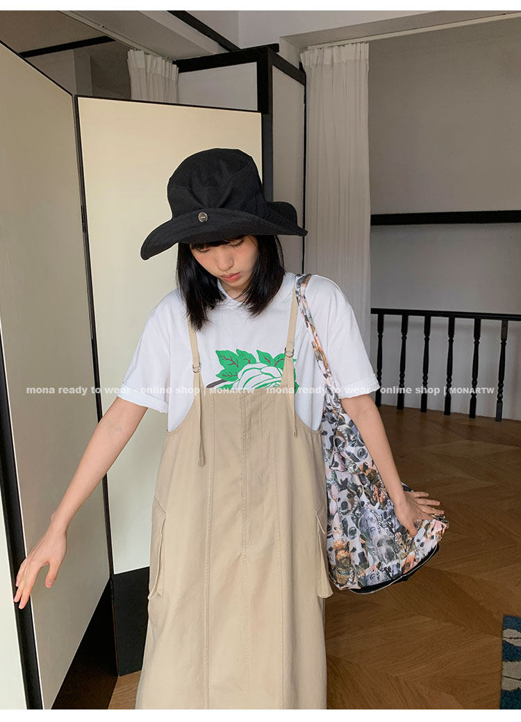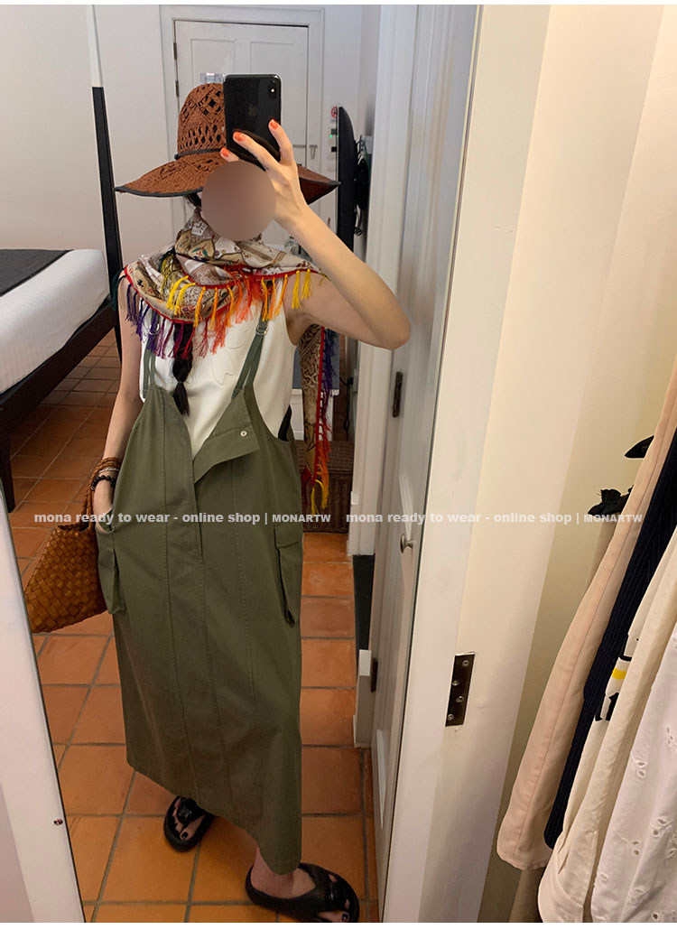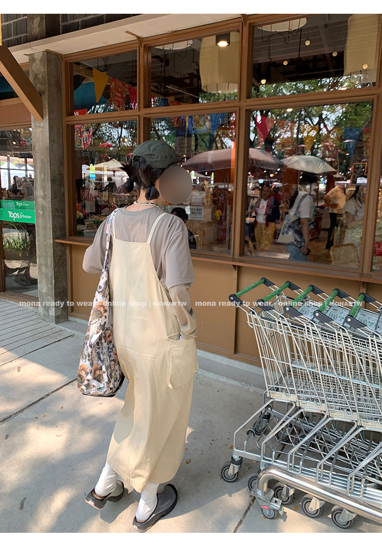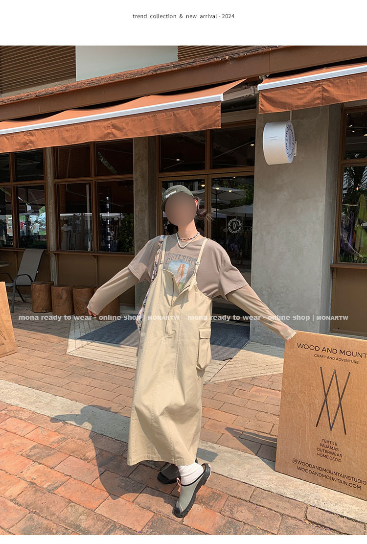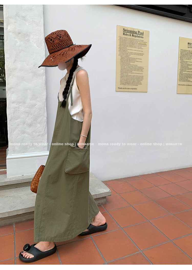 大口袋直筒型背帶褲,裙身呈H型輪廓,遮肉顯瘦