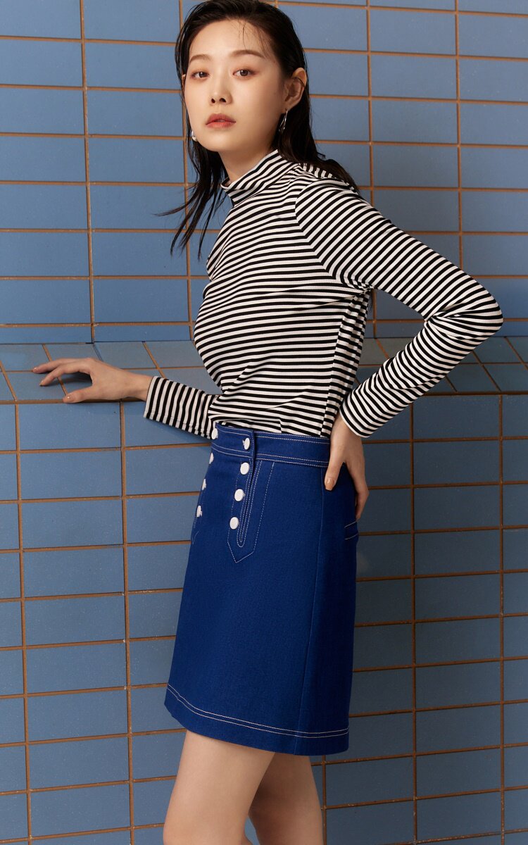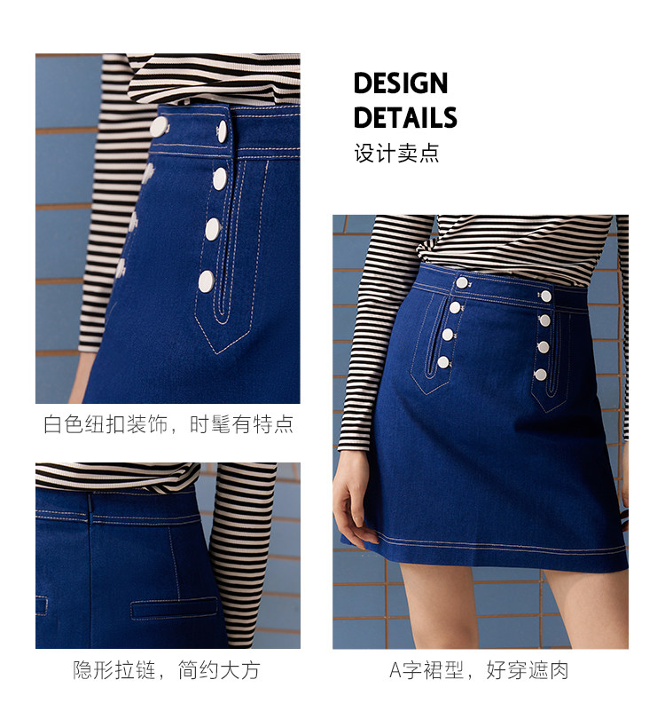設計賣點:高腰腰型,視覺拉長比例;A字裙型,好穿遮肉;白色紐扣裝飾,時髦有特點;隱形拉鏈,簡約大方