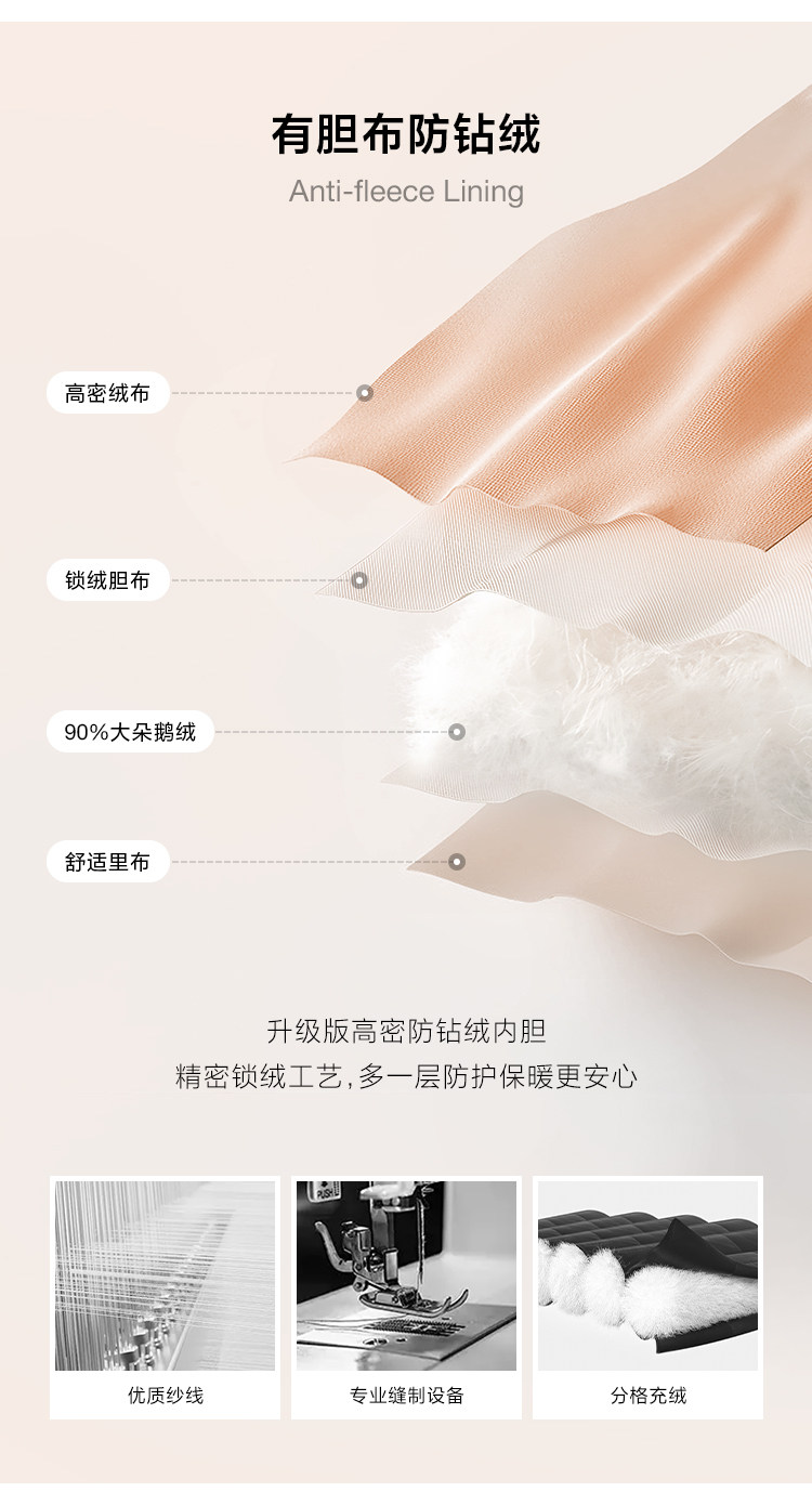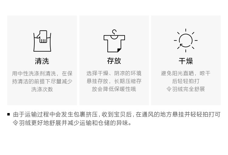 | 洗滌建議 | 及時洗滌,及時晾干。羽絨服盡量不要經常洗滌,次數過于頻繁是會影響到保暖性的。 |