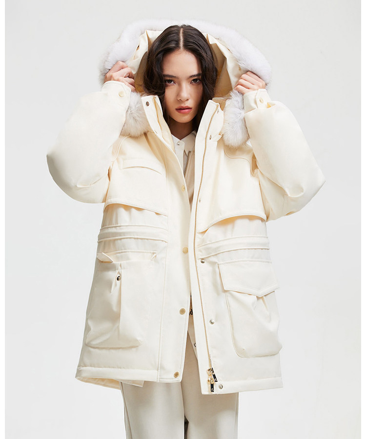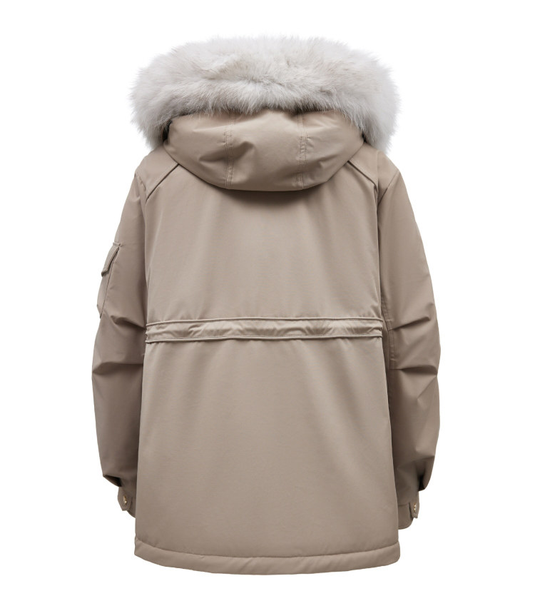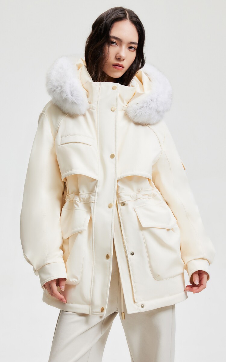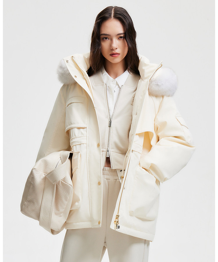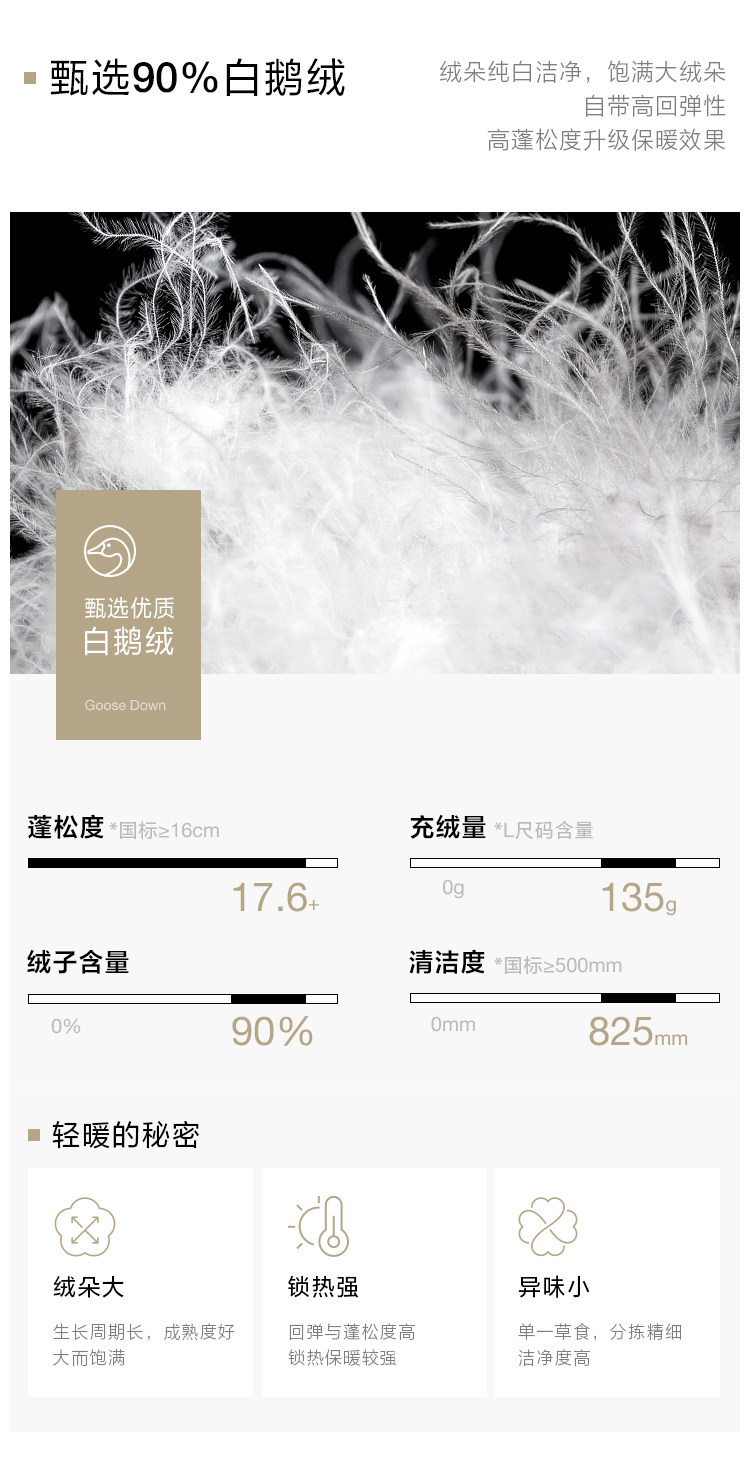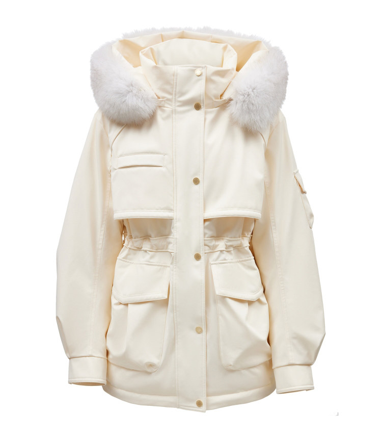 | 面 料 | 外層:錦綸86% 氨綸14%, 內層:聚酯纖維100%,里料:錦綸100%,膽料:聚酯纖維100%,填充物:白鵝絨 絨子含量:90%,充絨量:XS:117g S:121g M:130g L:135g,其他填充物:聚酯纖維100%,帽毛:狐貍毛皮 |