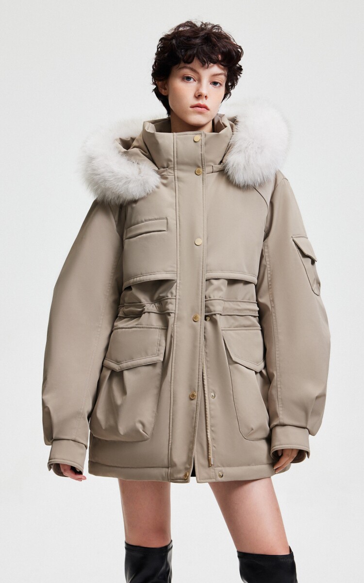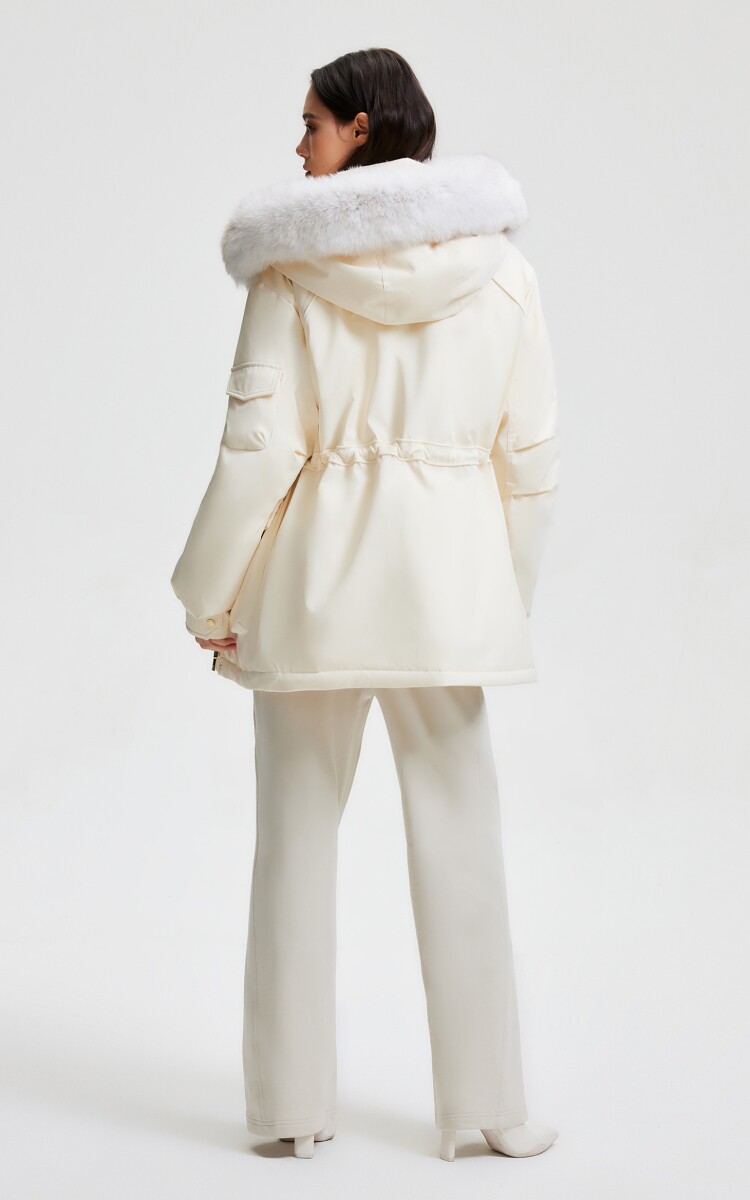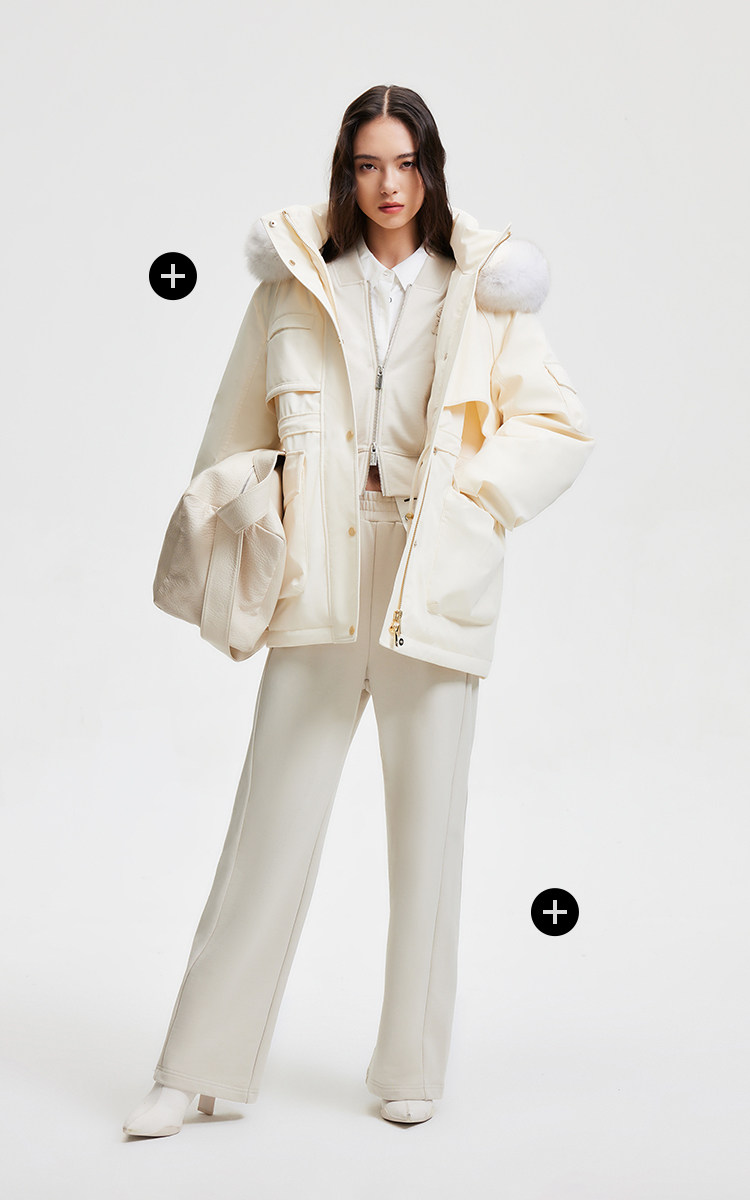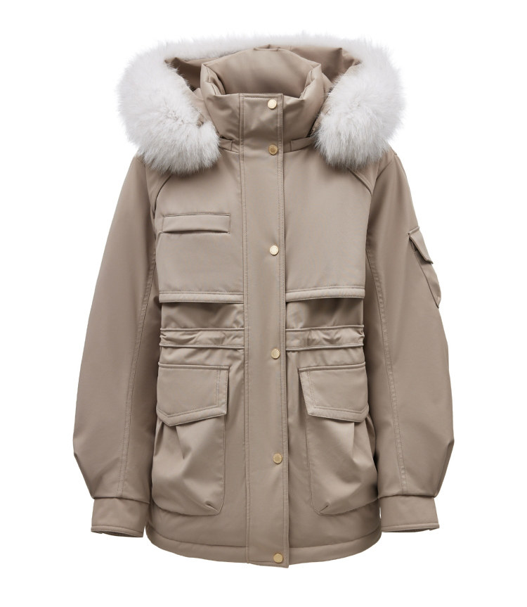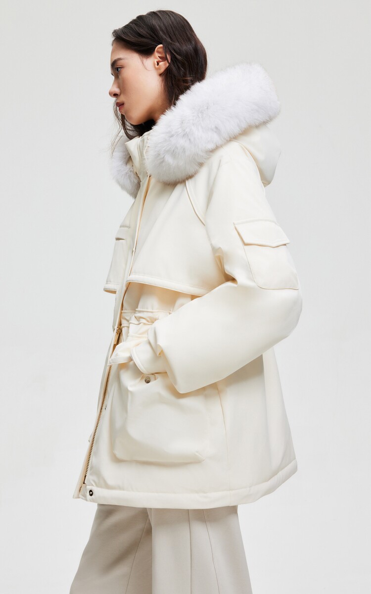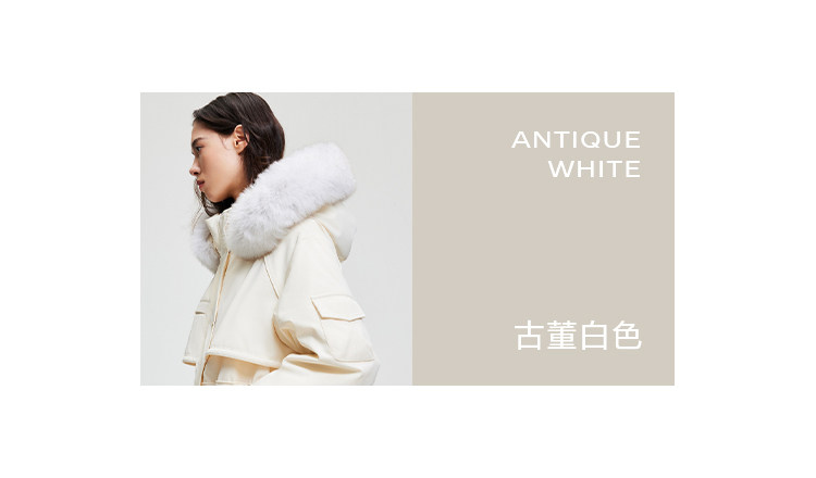 | 面 料 | 外層:錦綸86% 氨綸14%, 內層:聚酯纖維100%,里料:錦綸100%,膽料:聚酯纖維100%,填充物:白鵝絨 絨子含量:90%,充絨量:XS:117g S:121g M:130g L:135g,其他填充物:聚酯纖維100%,帽毛:狐貍毛皮 |
