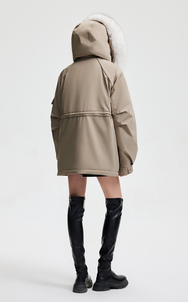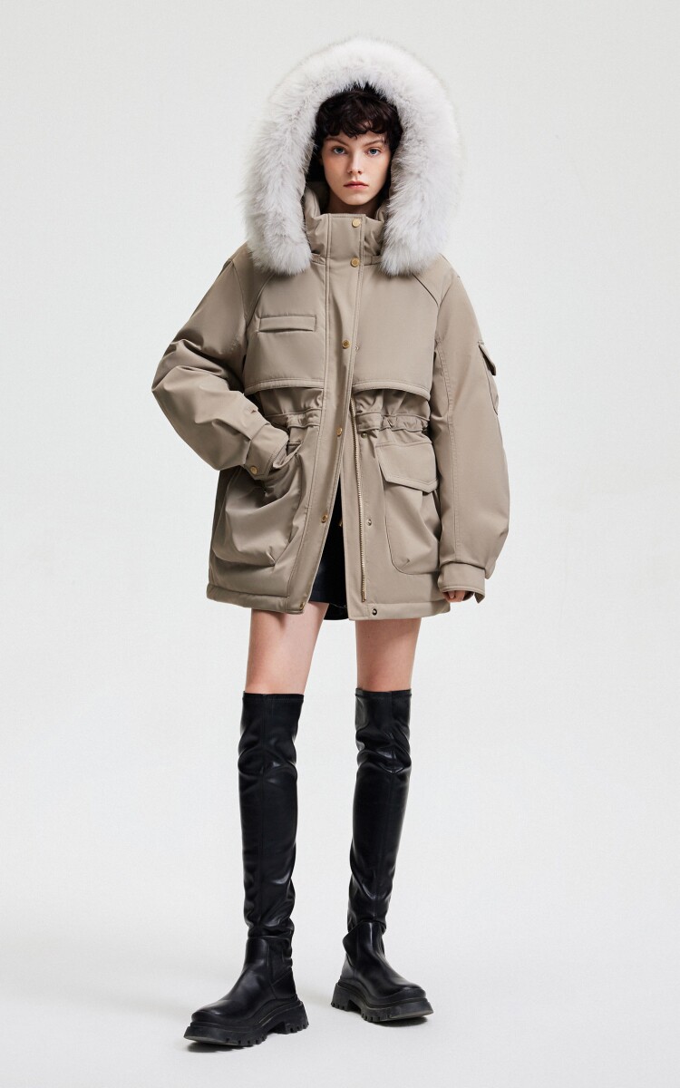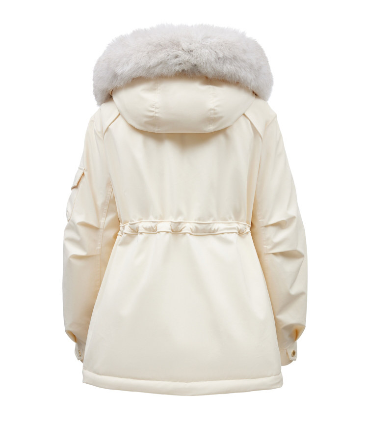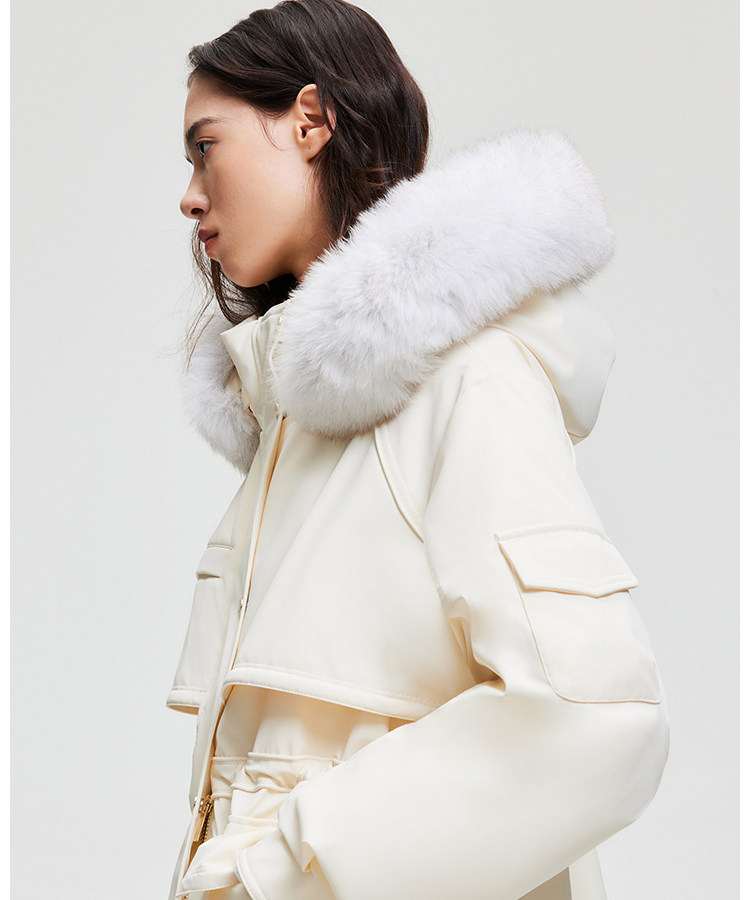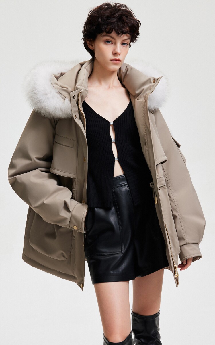 | 面 料 | 外層:錦綸86% 氨綸14%, 內層:聚酯纖維100%,里料:錦綸100%,膽料:聚酯纖維100%,填充物:白鵝絨 絨子含量:90%,充絨量:XS:117g S:121g M:130g L:135g,其他填充物:聚酯纖維100%,帽毛:狐貍毛皮 |