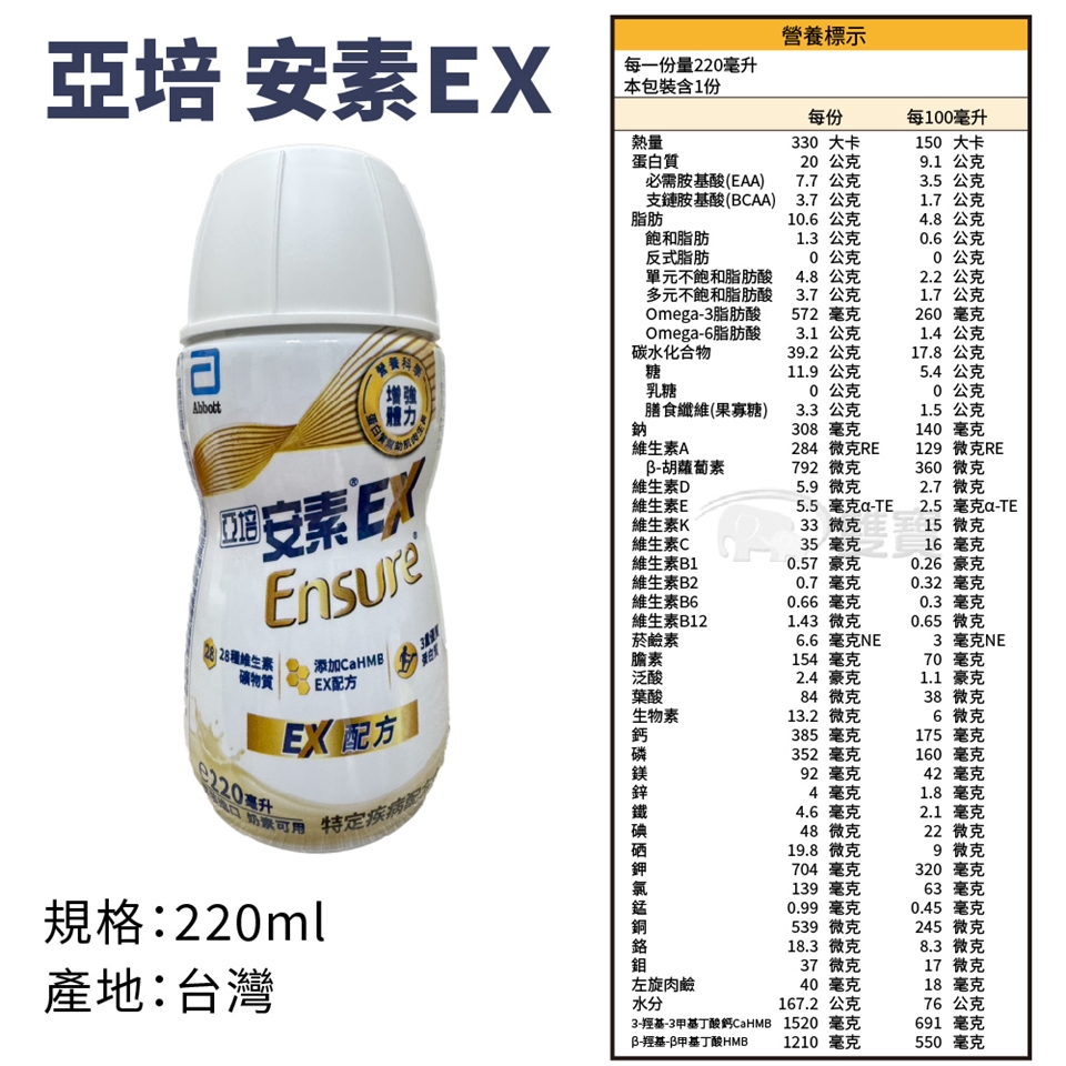 成分:水.水解玉米澱粉.濃縮牛奶蛋白.酪蛋白鈉.糖.芥花油.果寡醣(FOS).玉米油.分離大豆蛋白.3-羥基-3-甲基丁酸鈣.濃縮乳清蛋白.香料(香料.麥芽糊精).檸檬酸鉀.磷酸二氫鉀.大豆卵磷脂.微結晶狀α-纖維素.氫氧化鎂.氯化膽生僉.氫氧化鉀.氯化鉀.磷酸氫二鈉.麥芽糊精.維生素C.碳酸鈣.羧甲基纖維素鈉.葡萄糖.L-肉酸.磷酸鈣.鹿角菜膠.硫酸亞鐵.葵花籽油.維生素E.硫酸鋅.檸檬酸.菸鹼醯胺.本多酸鈣.硫酸錳.維生素B1.硫酸銅.β-胡蘿蔔素.維生素B6.維生素B2.維生素A棕櫚酸酯.葉酸.鉬酸鈉.碘化鉀.三氯化鉻.硒酸鈉.維生素K1.生物素.維生素D3.維生素B12