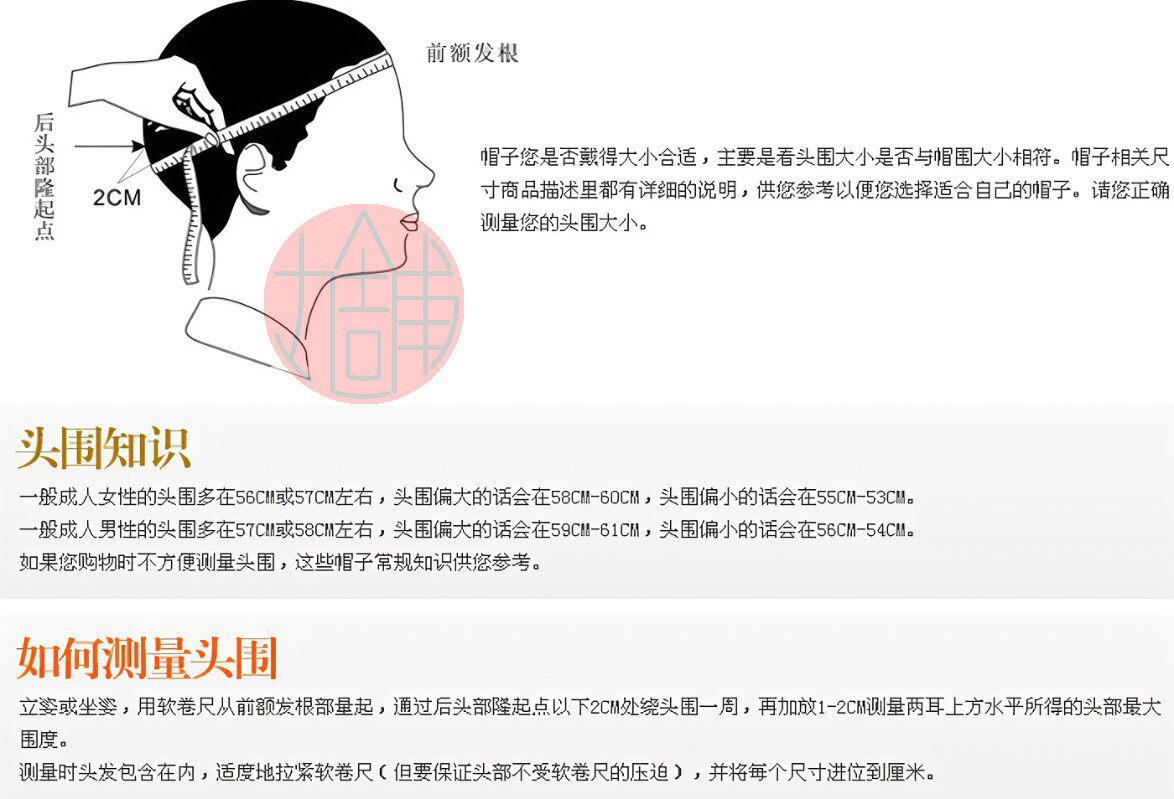 *因為頭發有一定厚度體積,個體差異也很大。例:女模特拉到最緊頭圍55cm,很松地貼著頭發周邊能量出頭圍60cm.完全不壓頭發能量出頭圍62cm。實際適合S碼帽子。