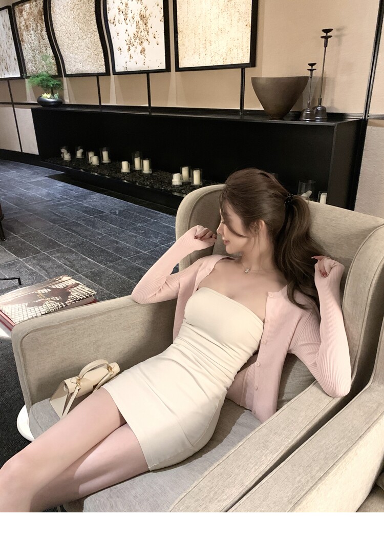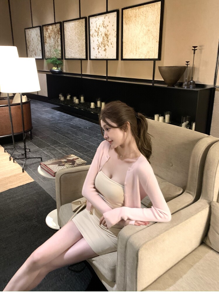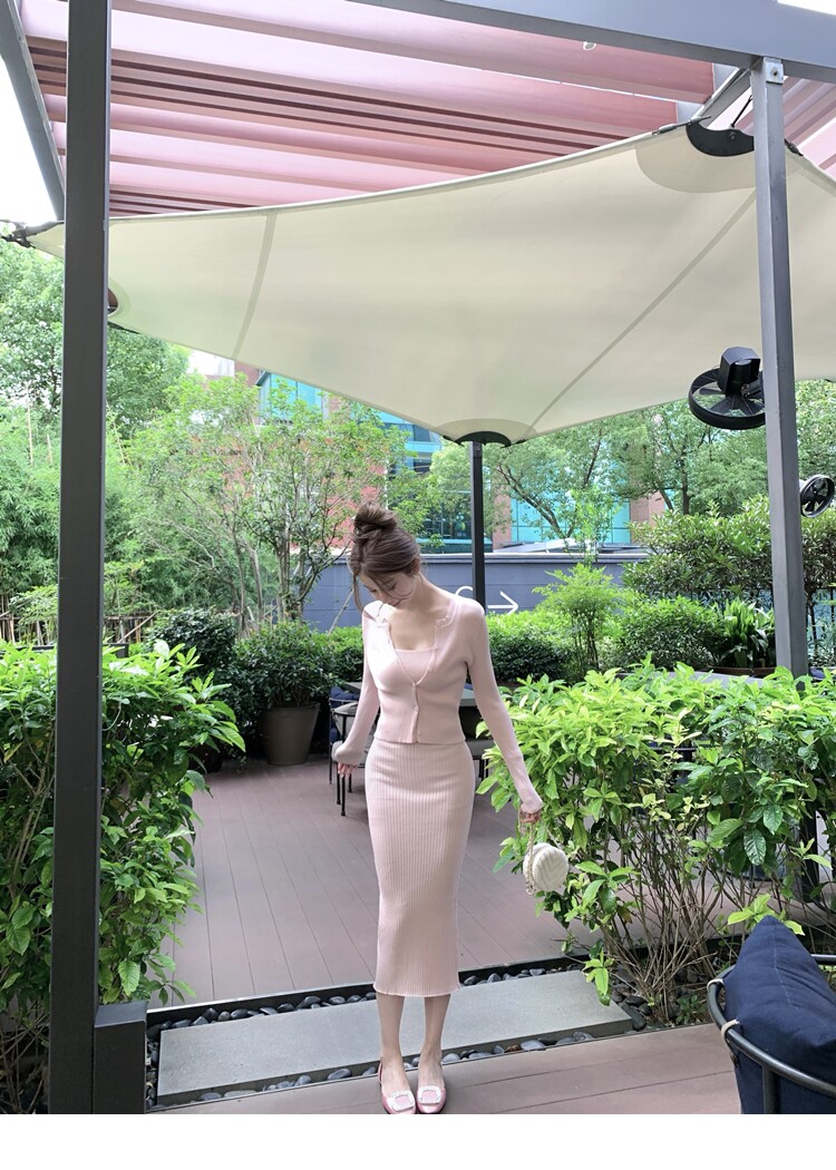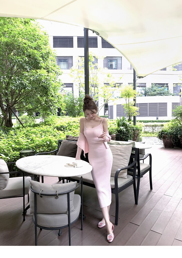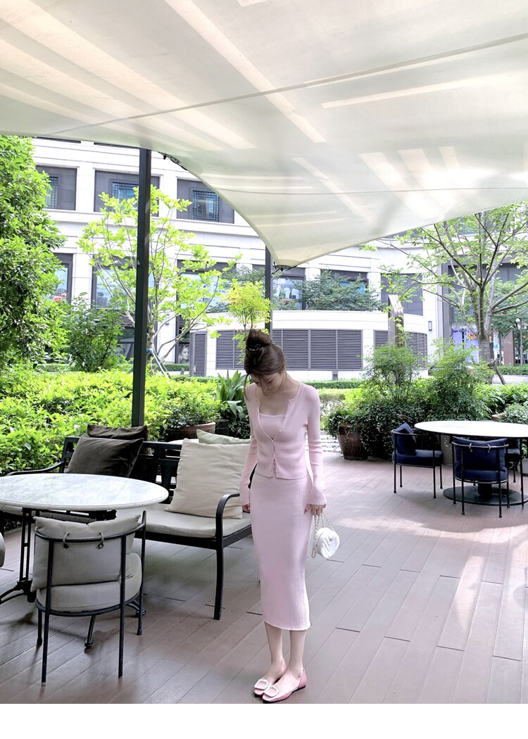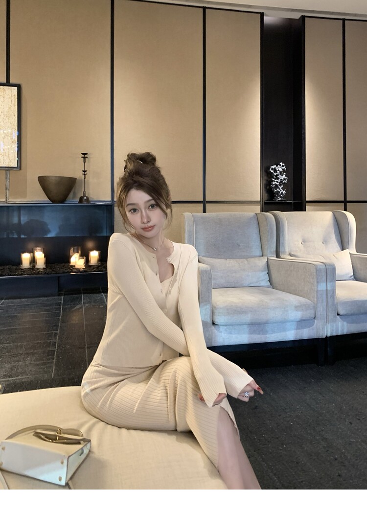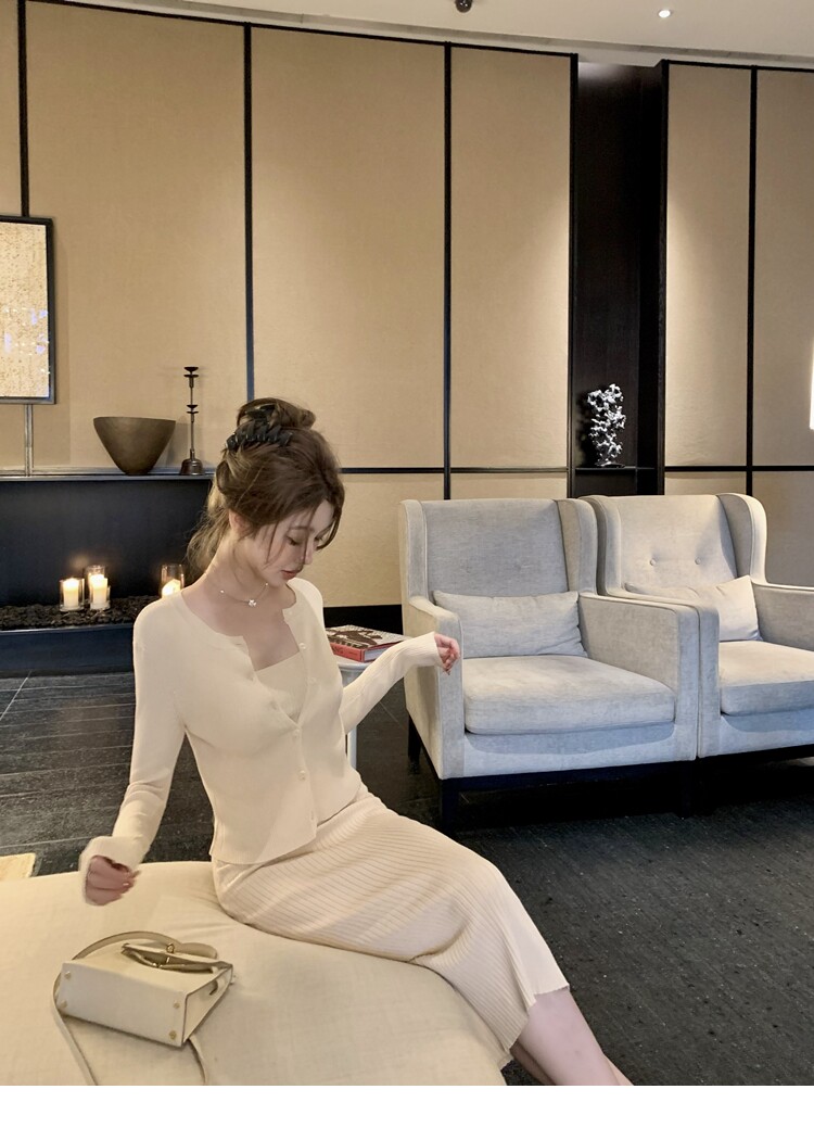 【溫香軟玉】柔軟紗線圓領開衫吊帶針織長裙套裝
