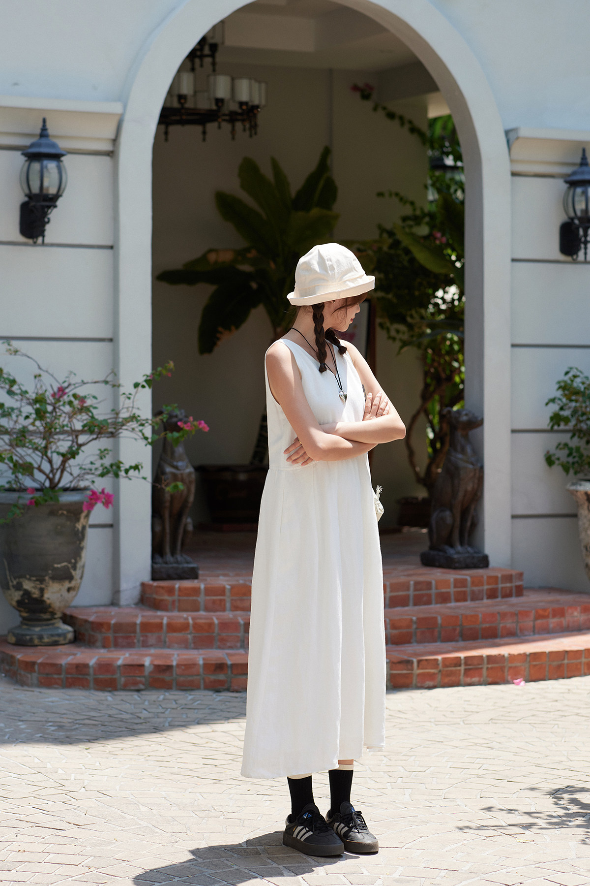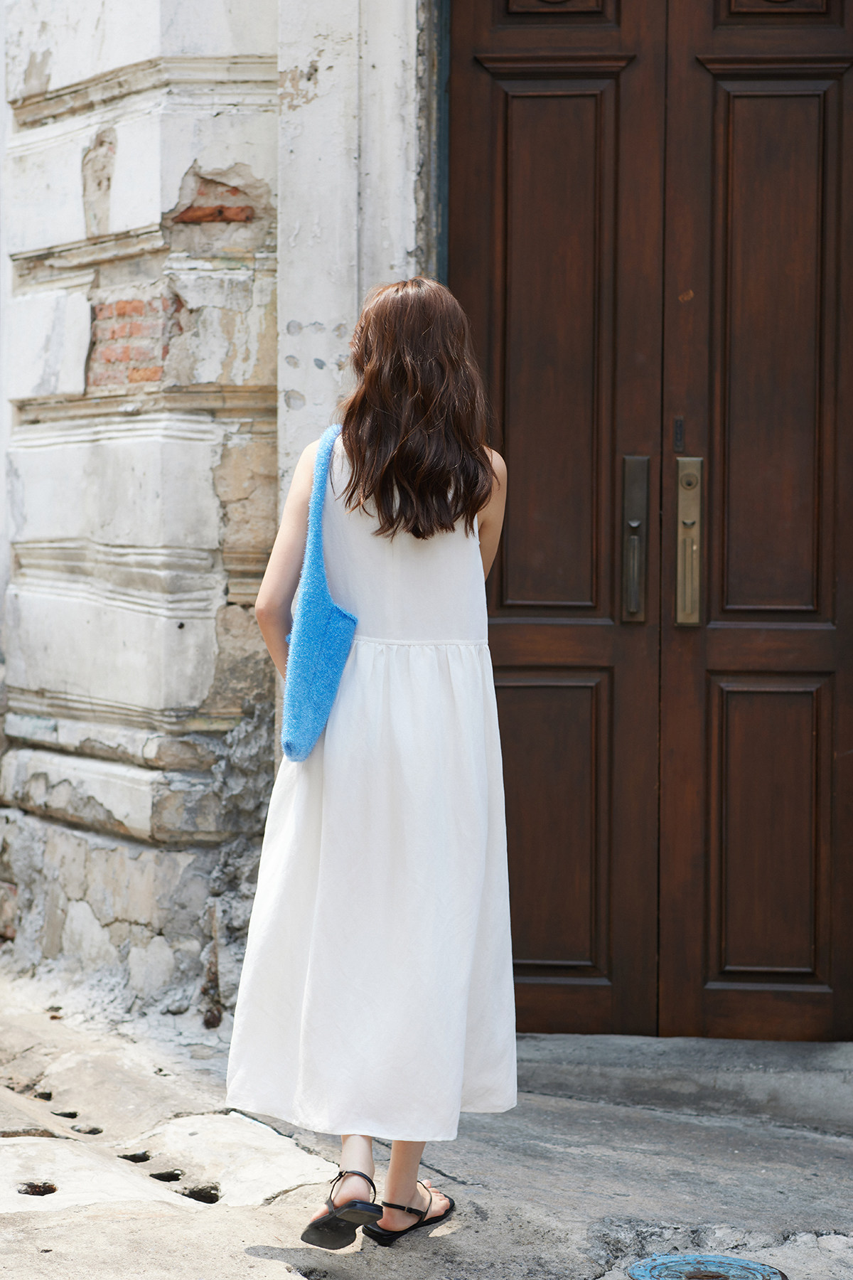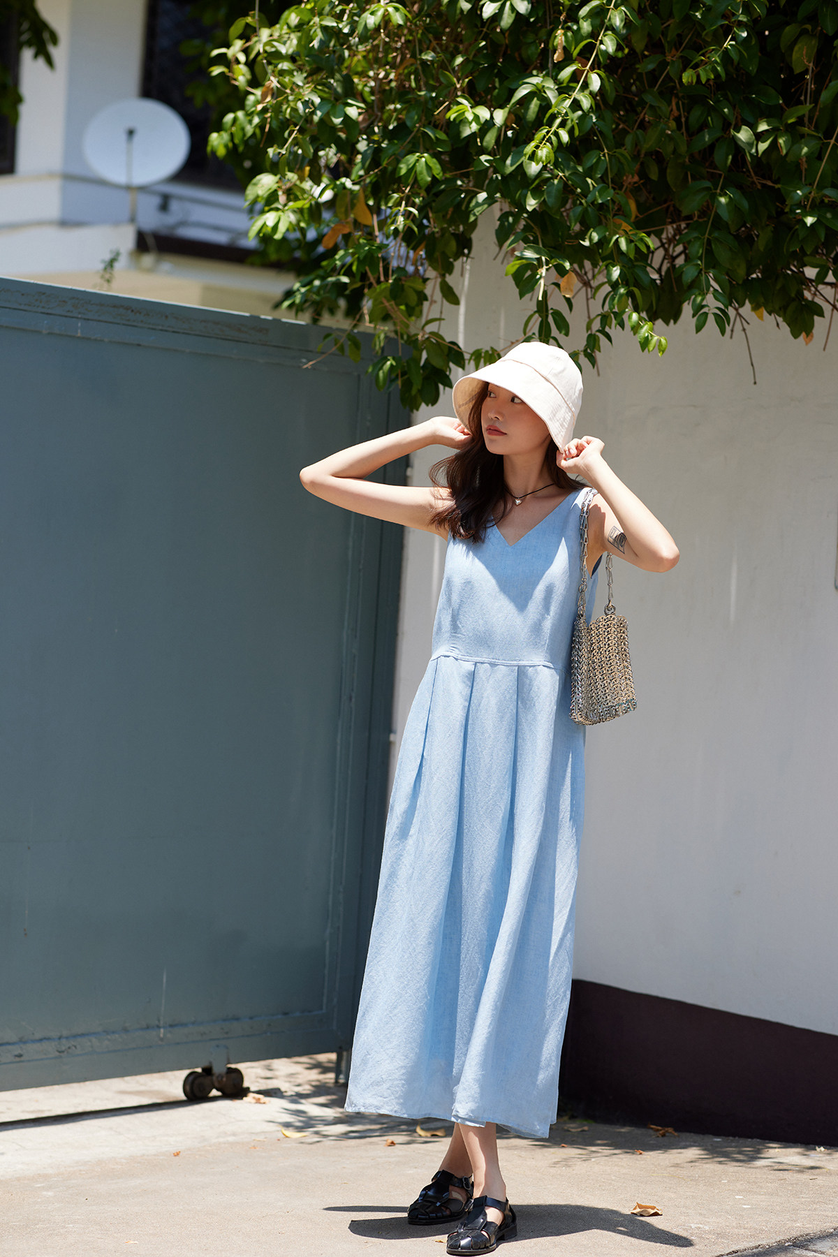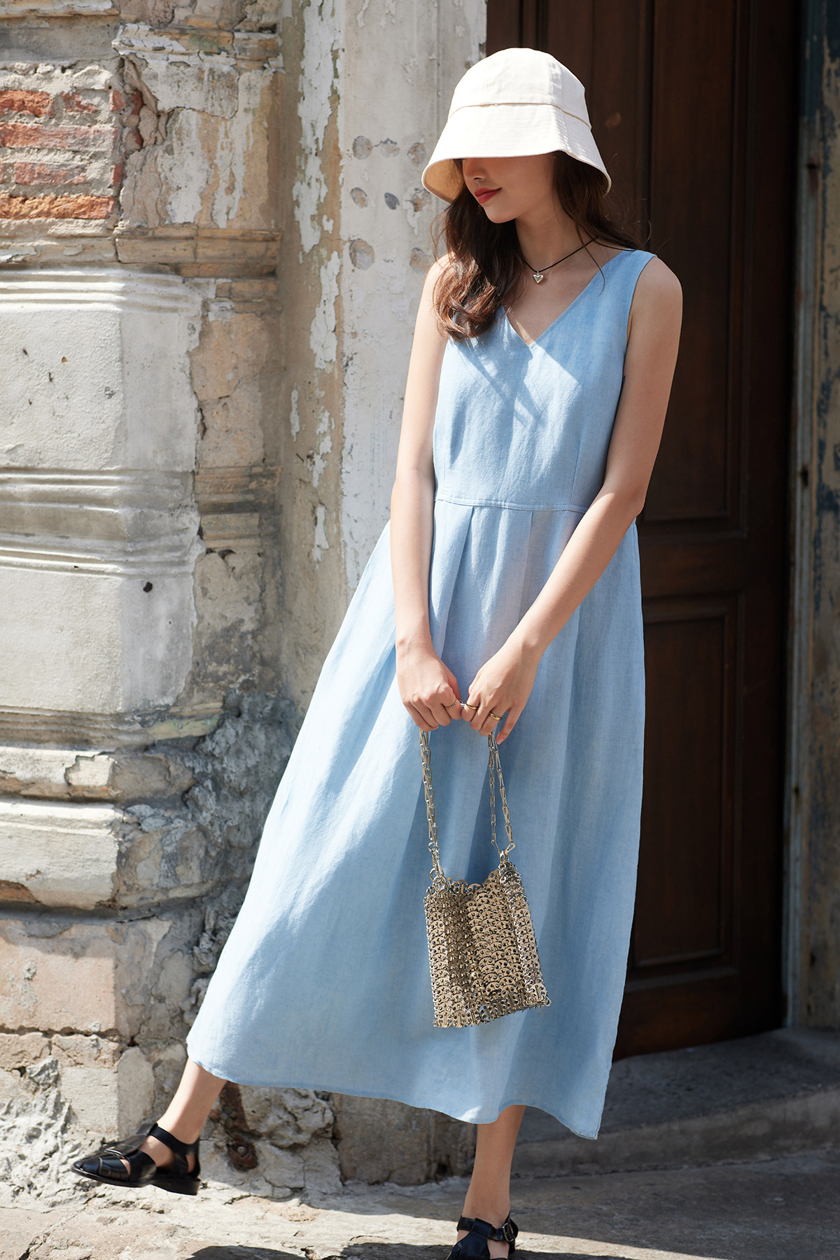 - 混紡棉麻 v領壓褶背心裙 -