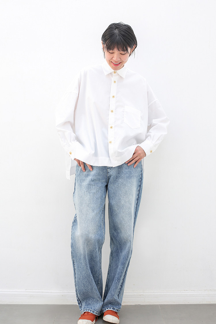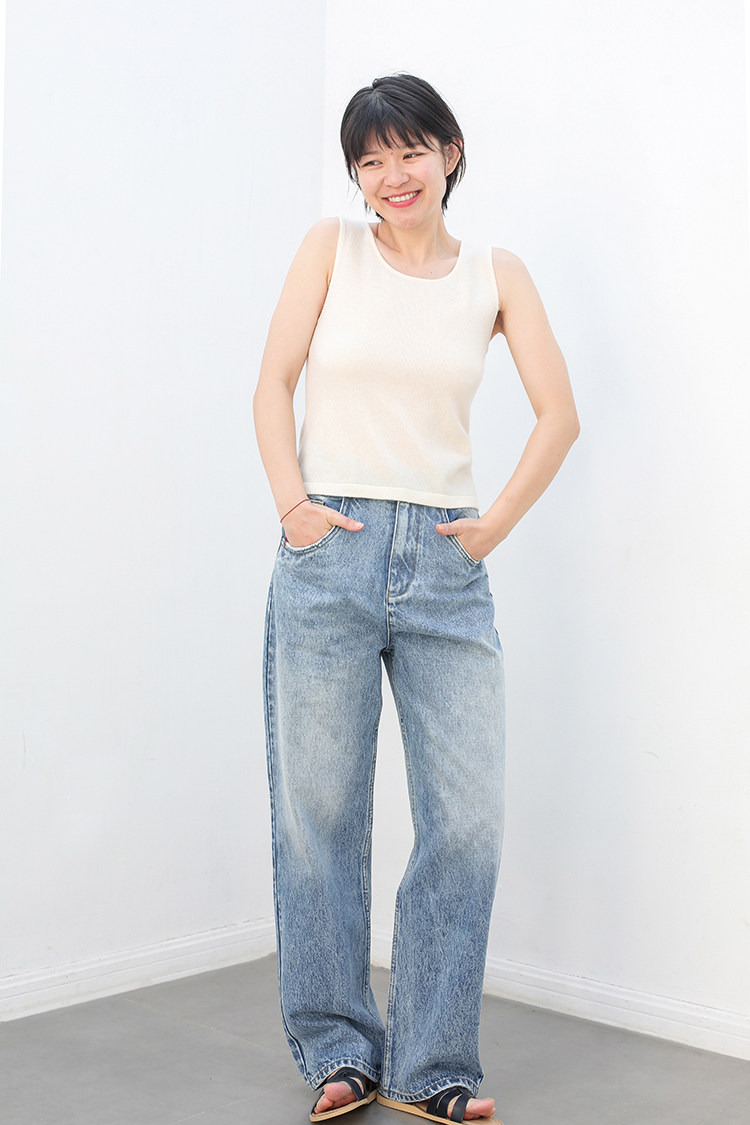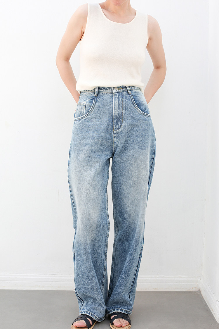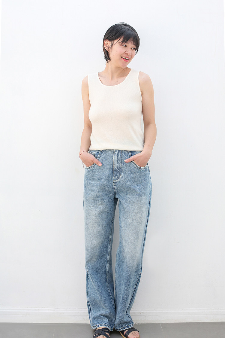 微微弧形剪裁的寬腿直筒褲型,從臀部延著大腿適度放量,再順著雙腿往下收窄,剛好是松身有度的褲型,上身包容性強。