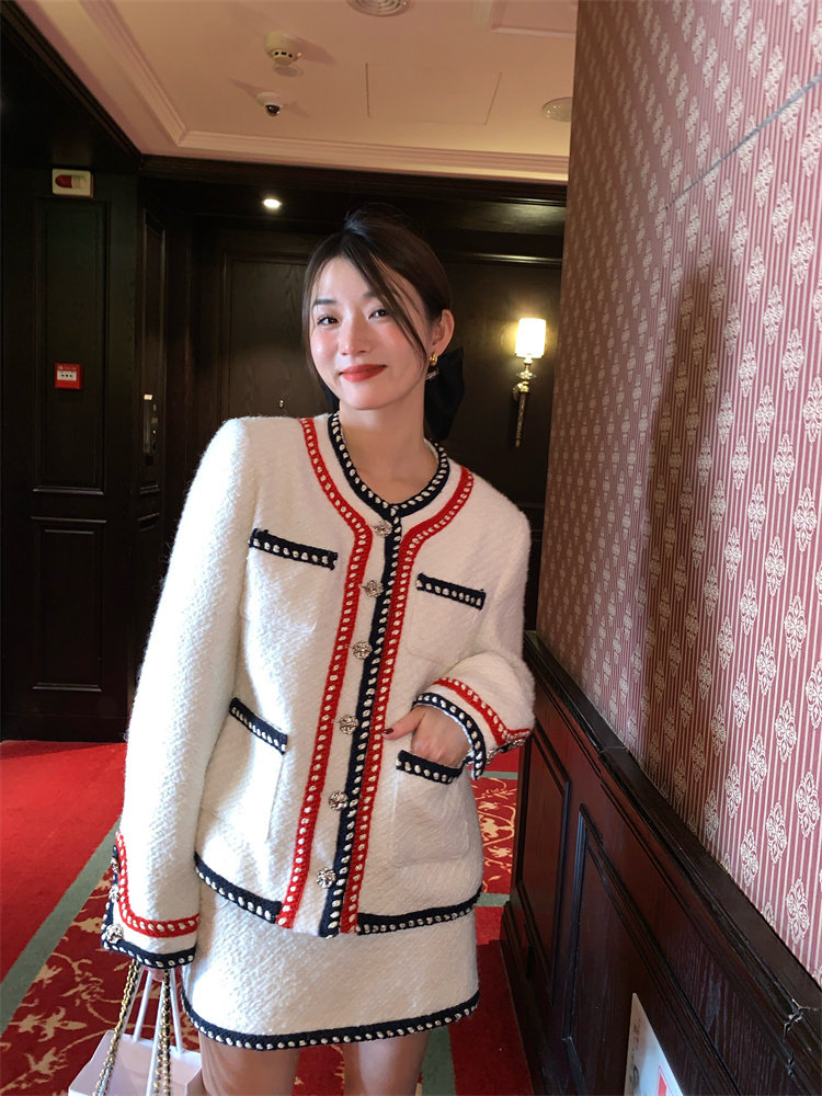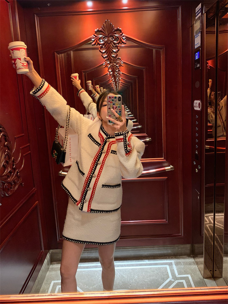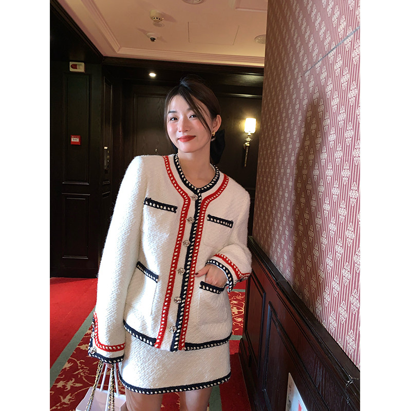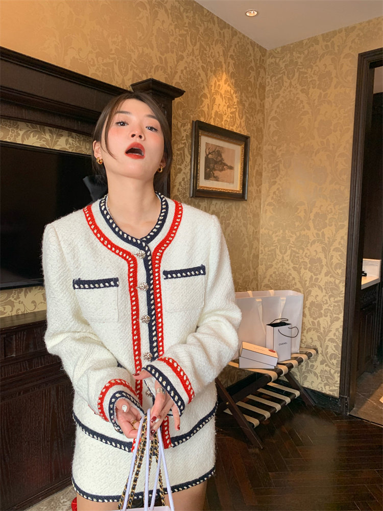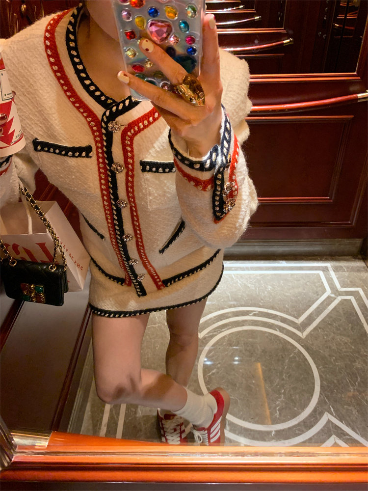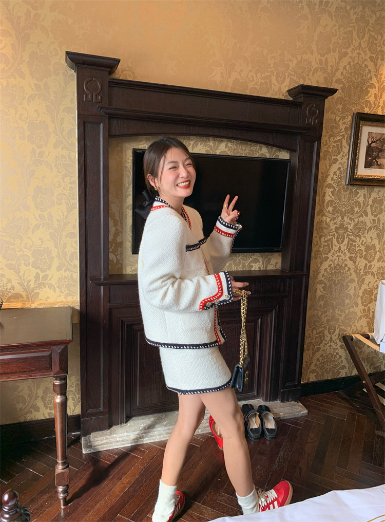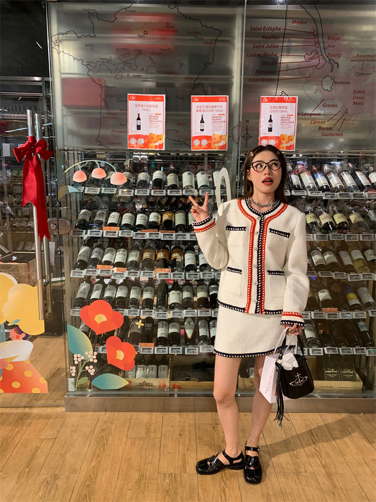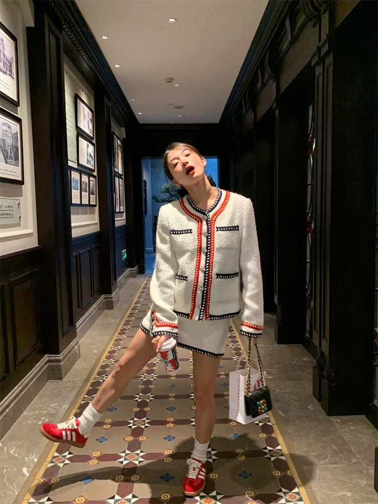 小香風外套的+包臀短裙的組合套裝,穿搭巨省心~