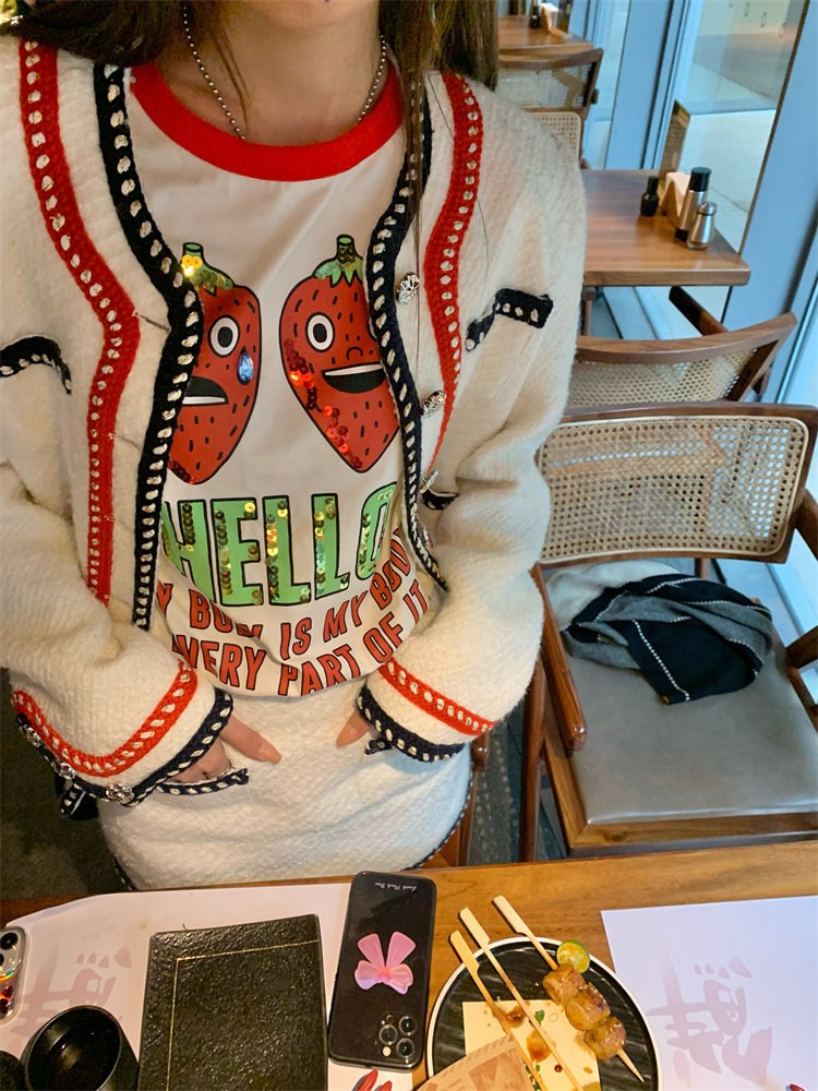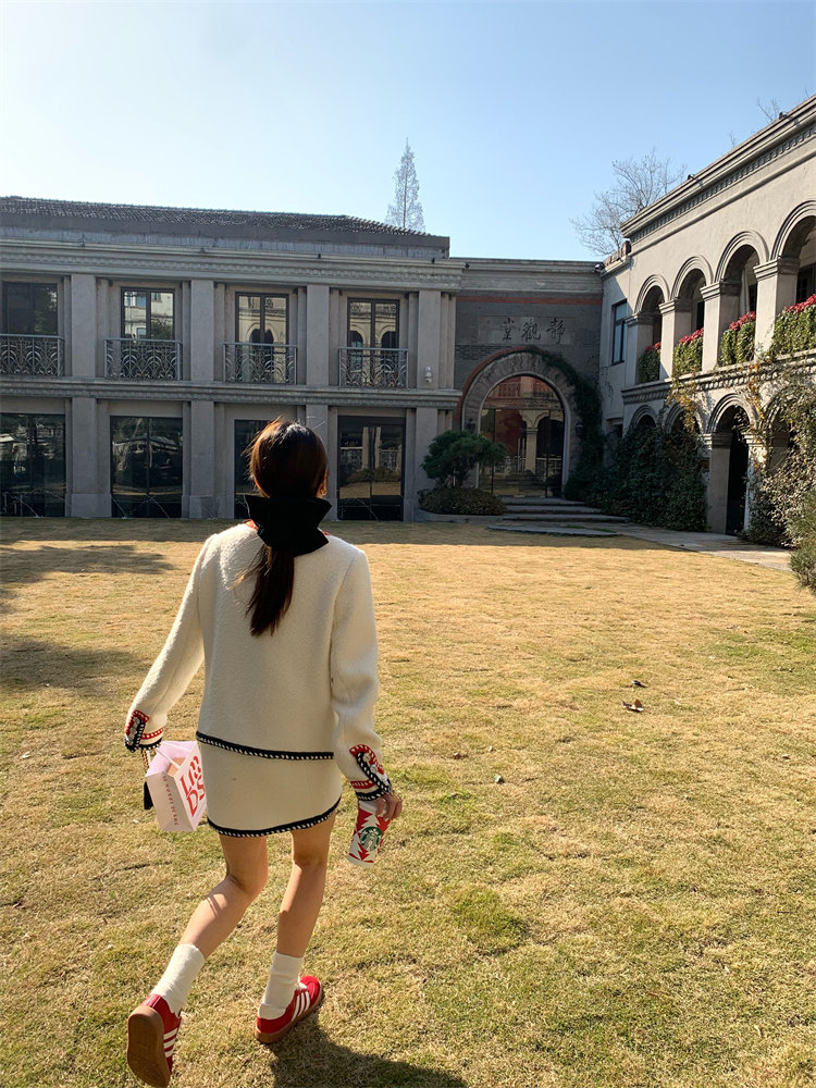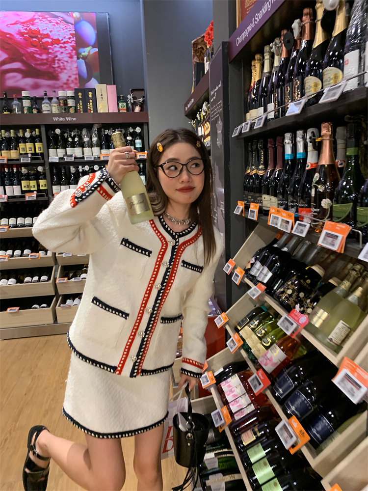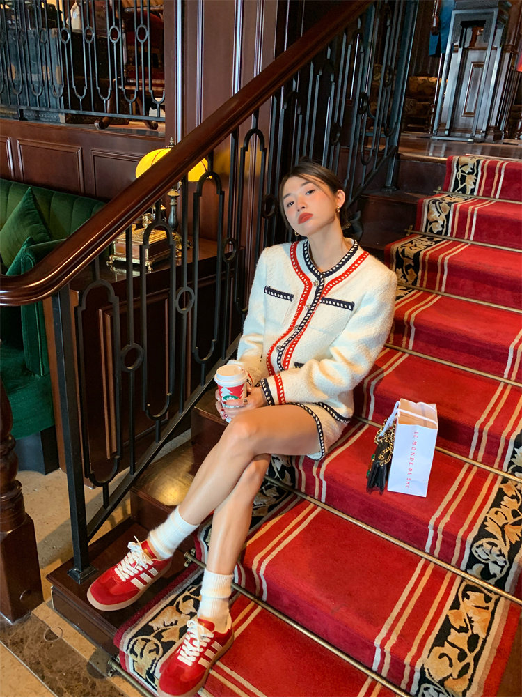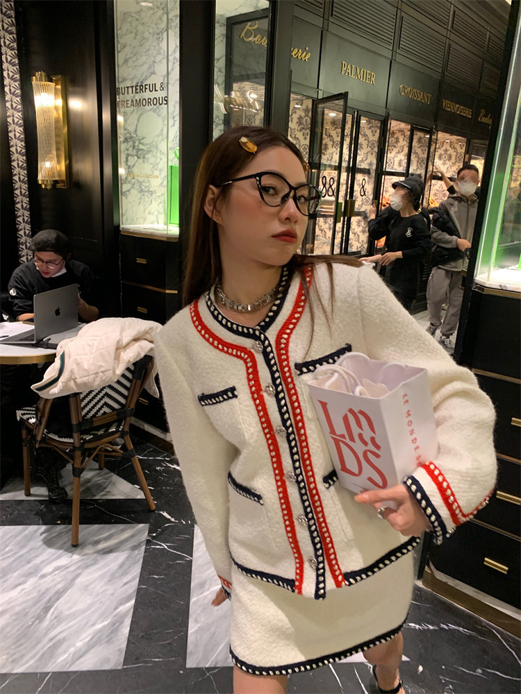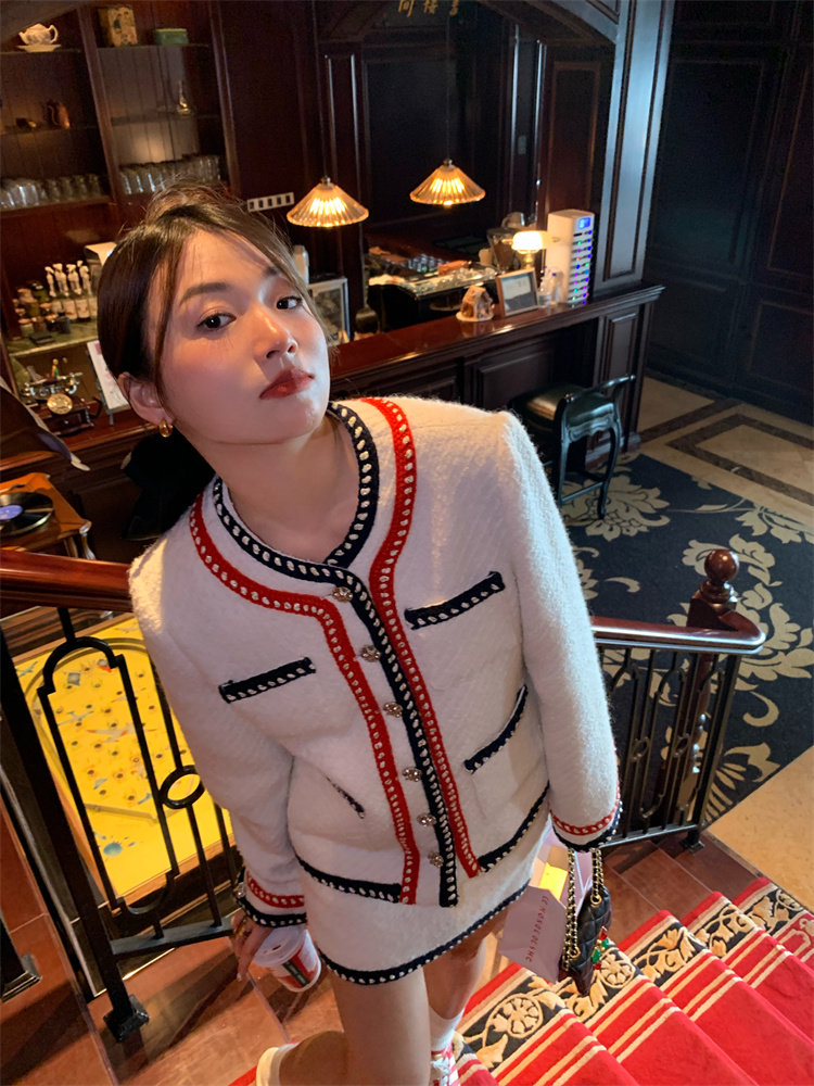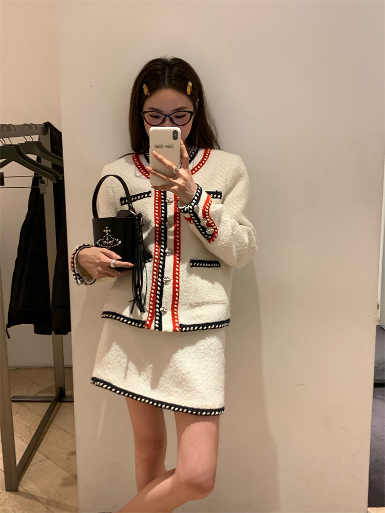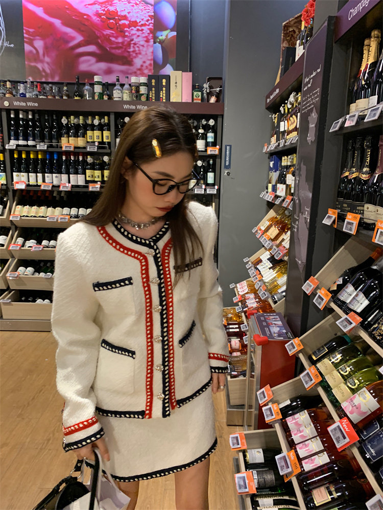 小香風外套的+包臀短裙的組合套裝,穿搭巨省心~