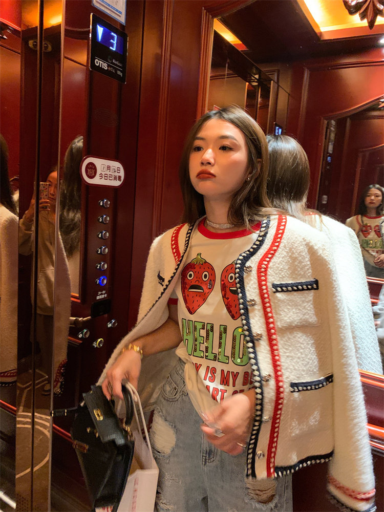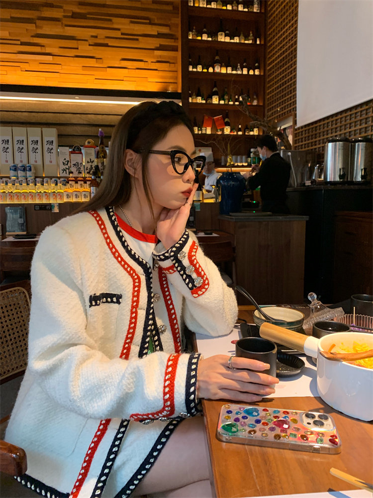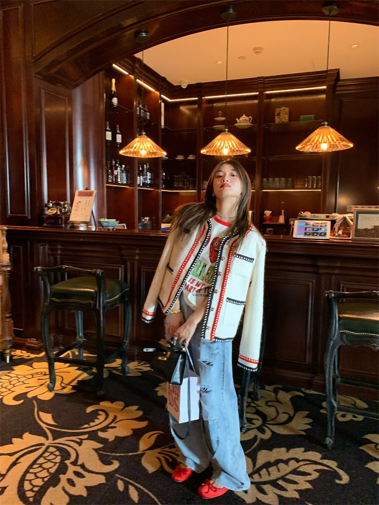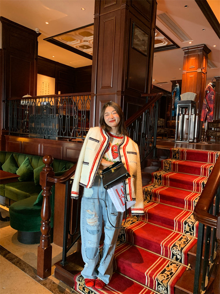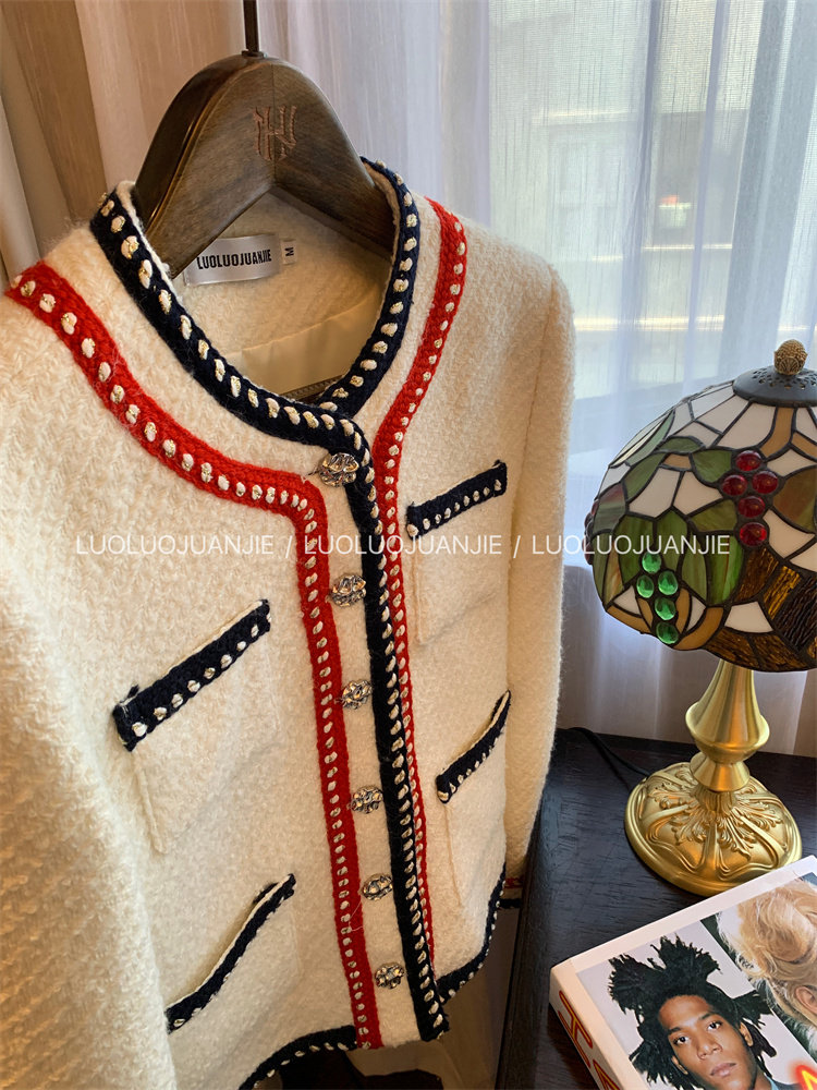 門襟、領口、袖口和下擺處,黑紅編織帶點綴,透著小心機的別致!