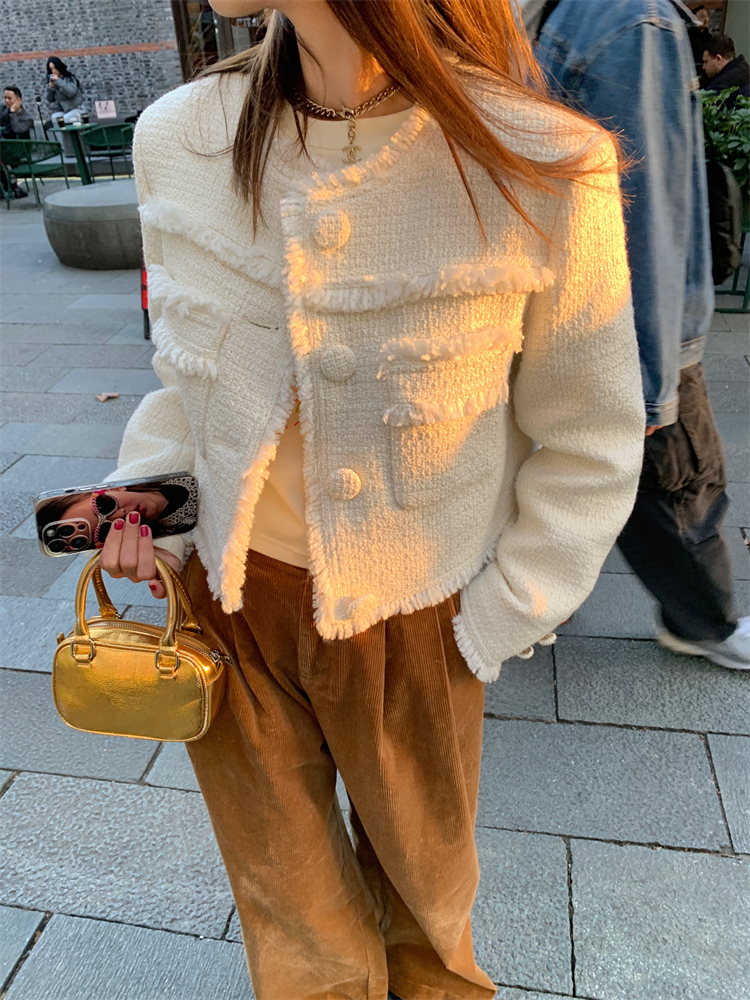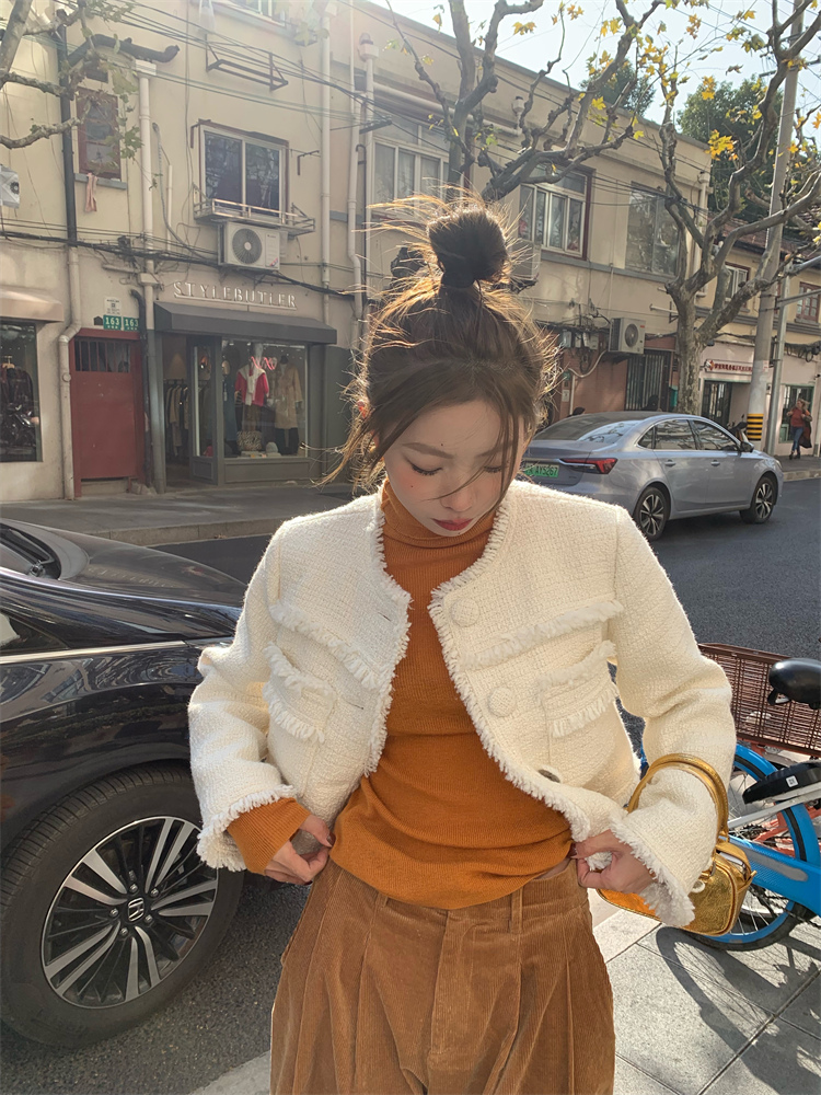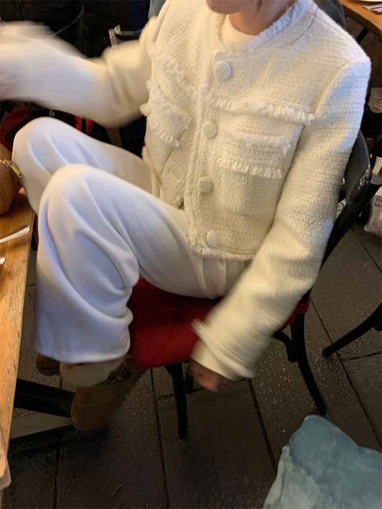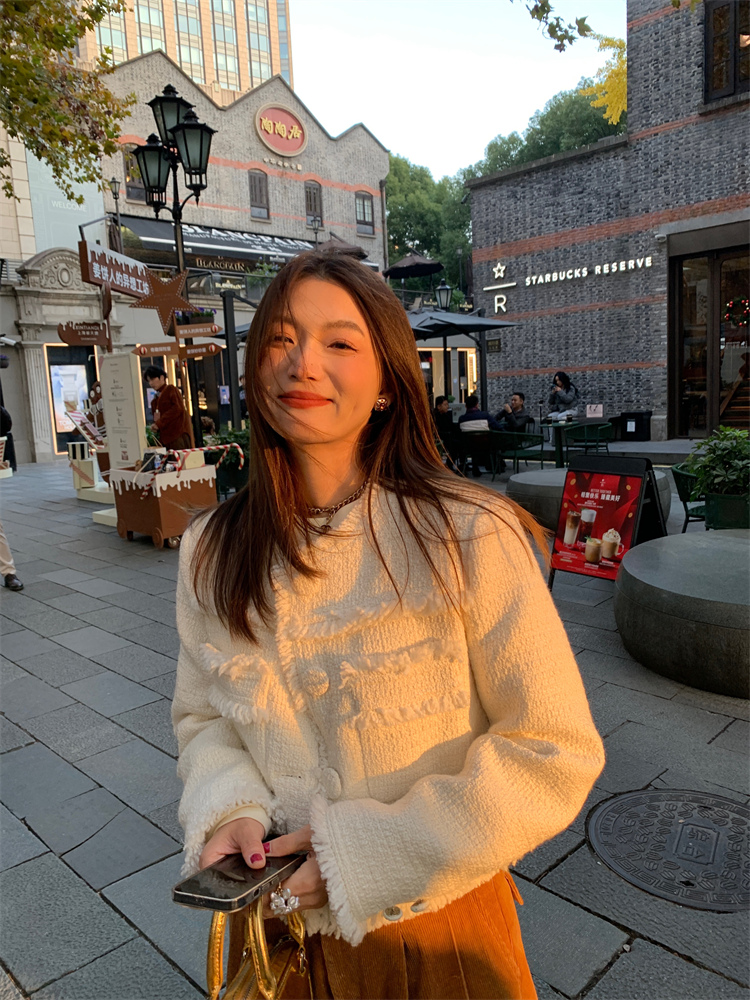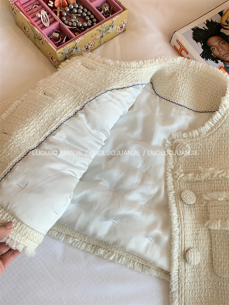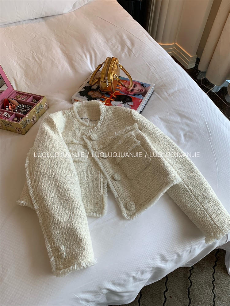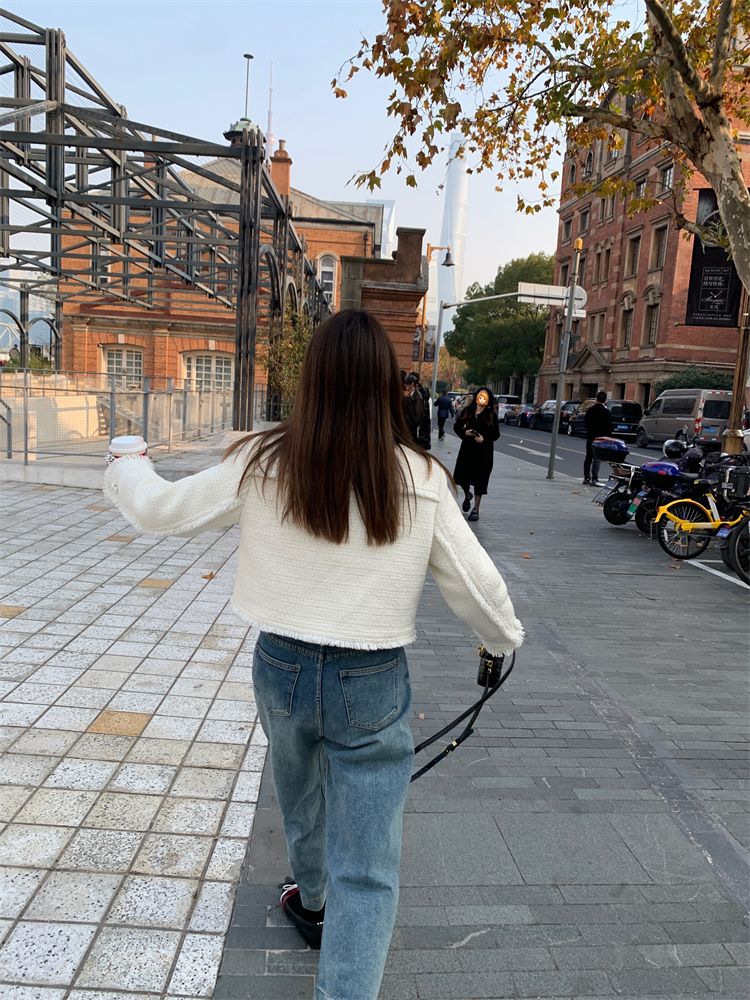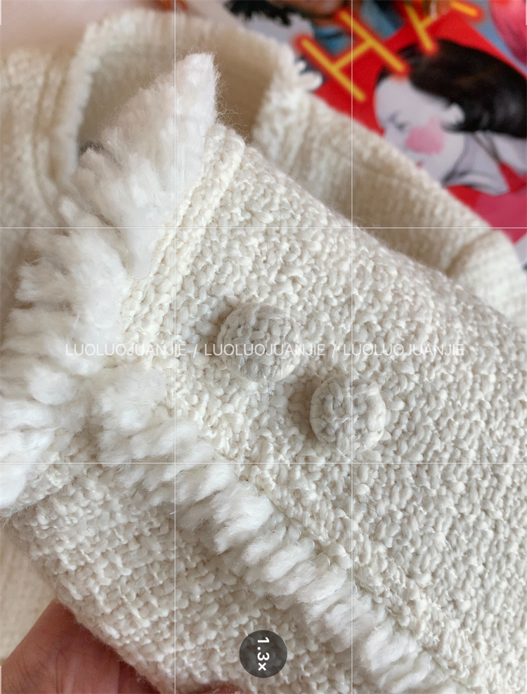 面料是粗織小香編織呢料,表面有編織肌理感,整體的細節遠看近看都很好看~