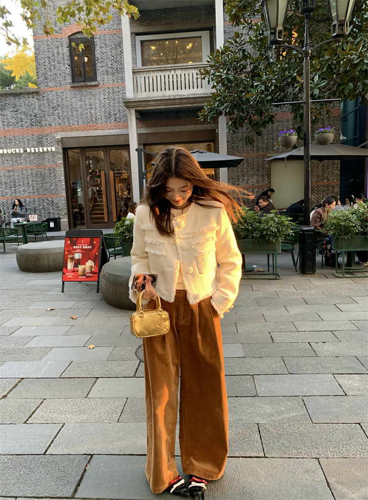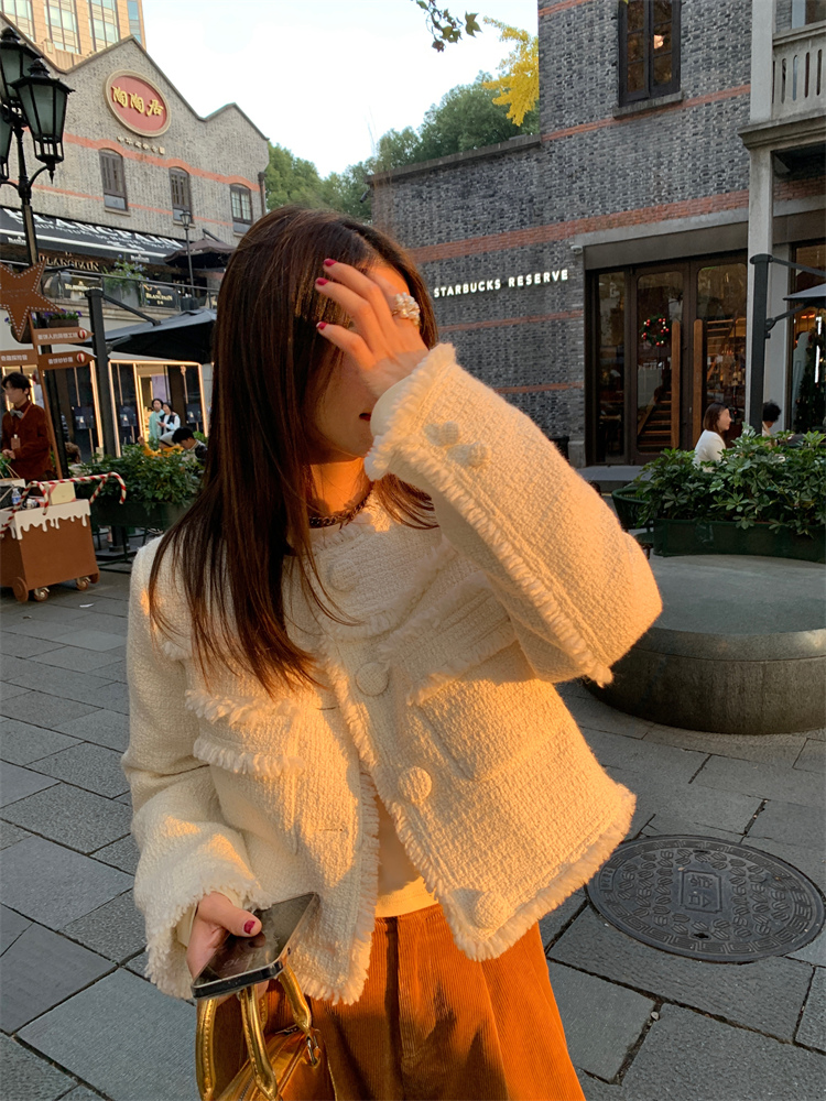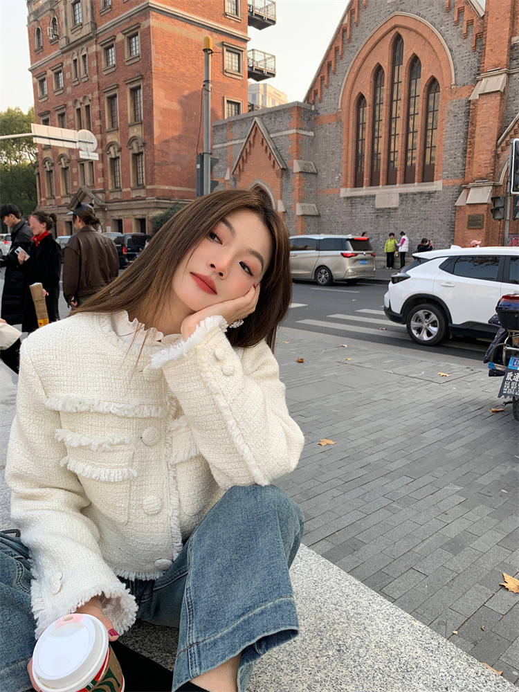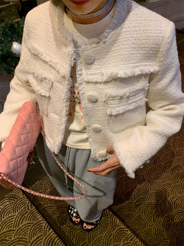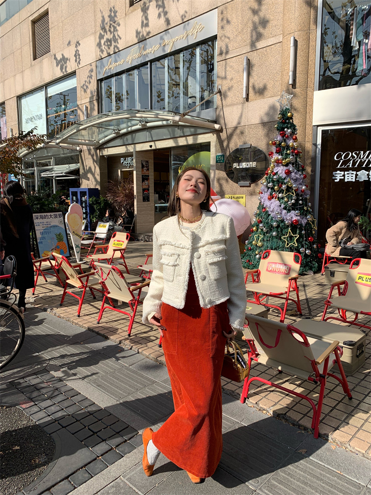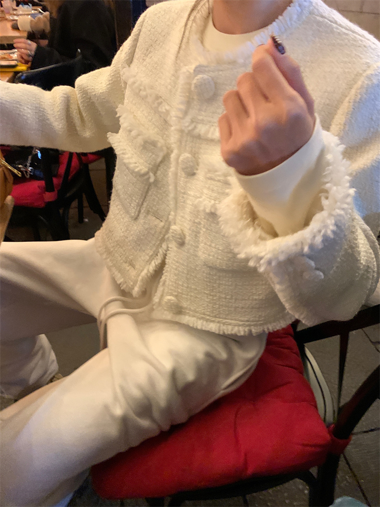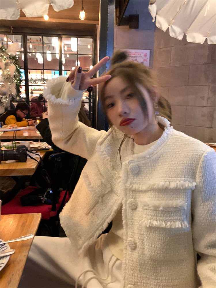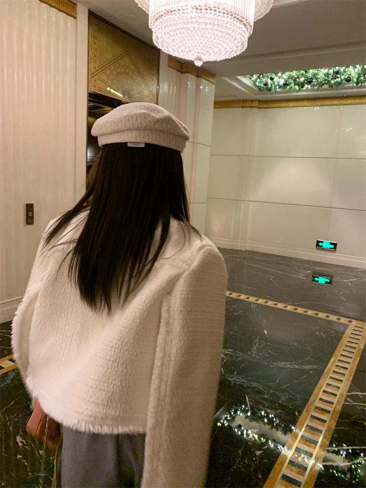 面料是粗織小香編織呢料,表面有編織肌理感,整體的細節遠看近看都很好看~
