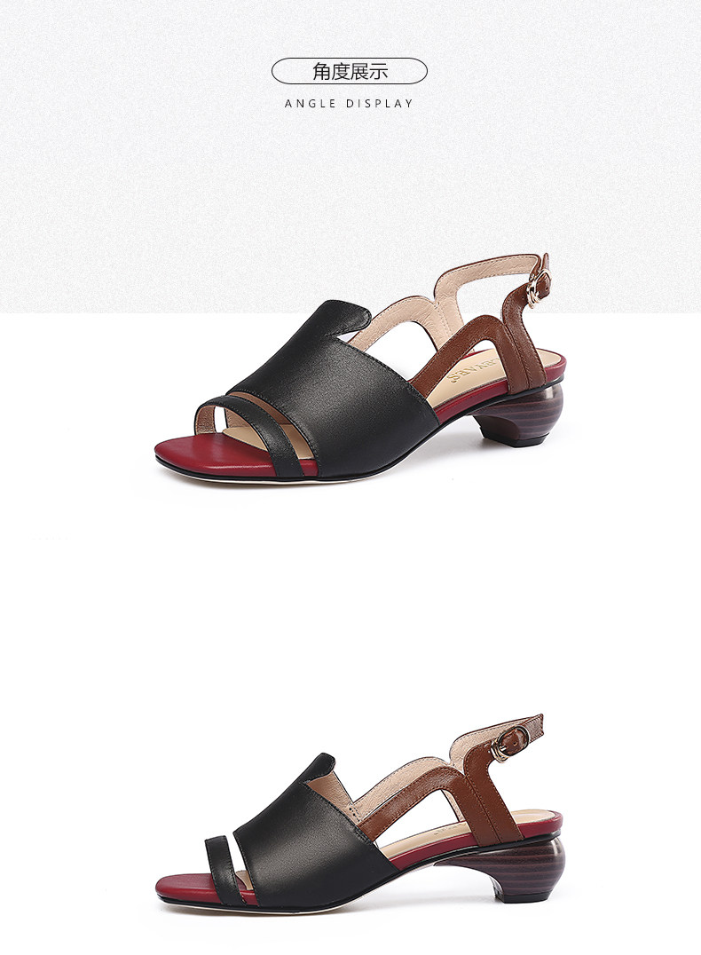 中跟涼鞋女2020夏季新款粗跟方頭真皮后空涼鞋大碼一字帶魚嘴涼鞋