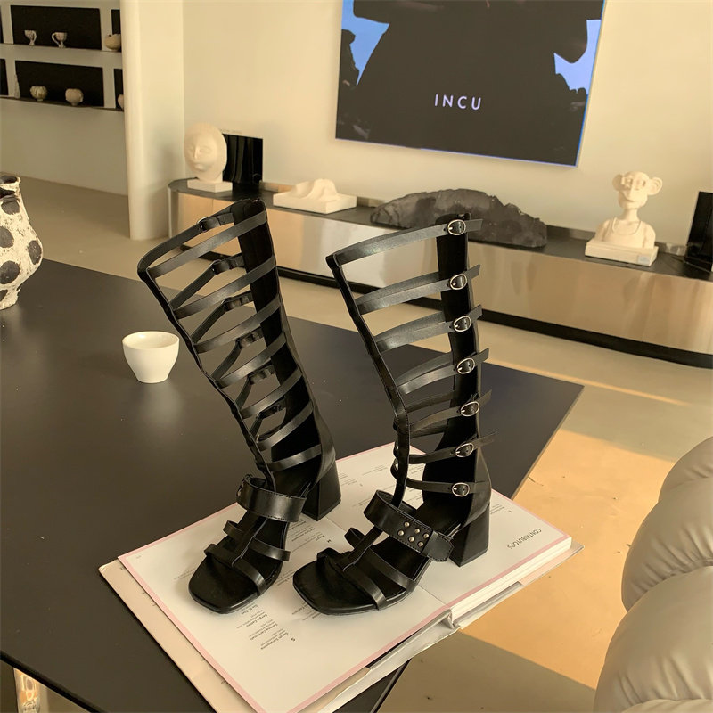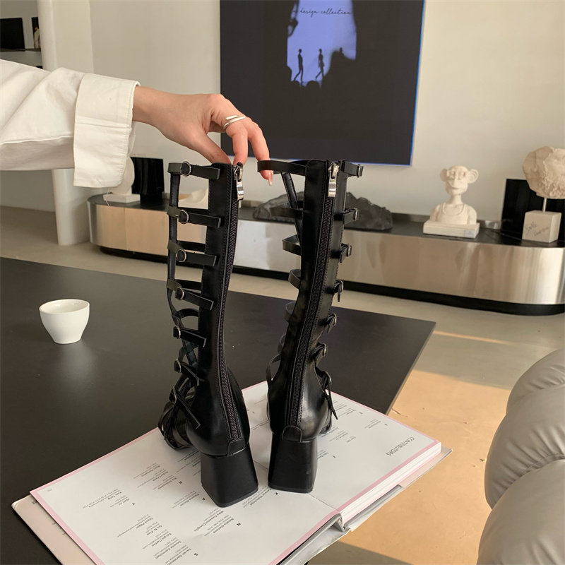 高幫長筒涼鞋女時尚炸街鏤空露趾個性羅馬鞋2023夏季新款黑色涼靴搭扣后拉鏈粗跟潮酷小眾少女