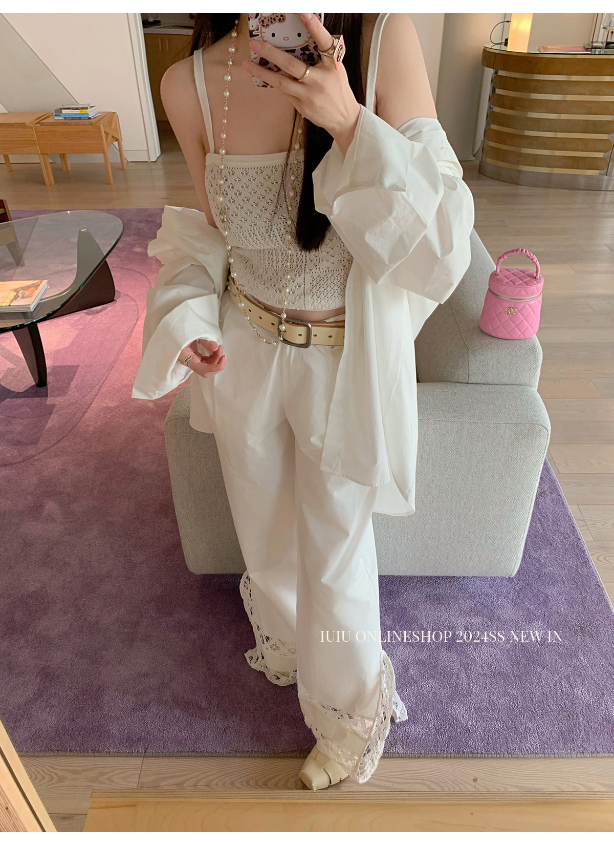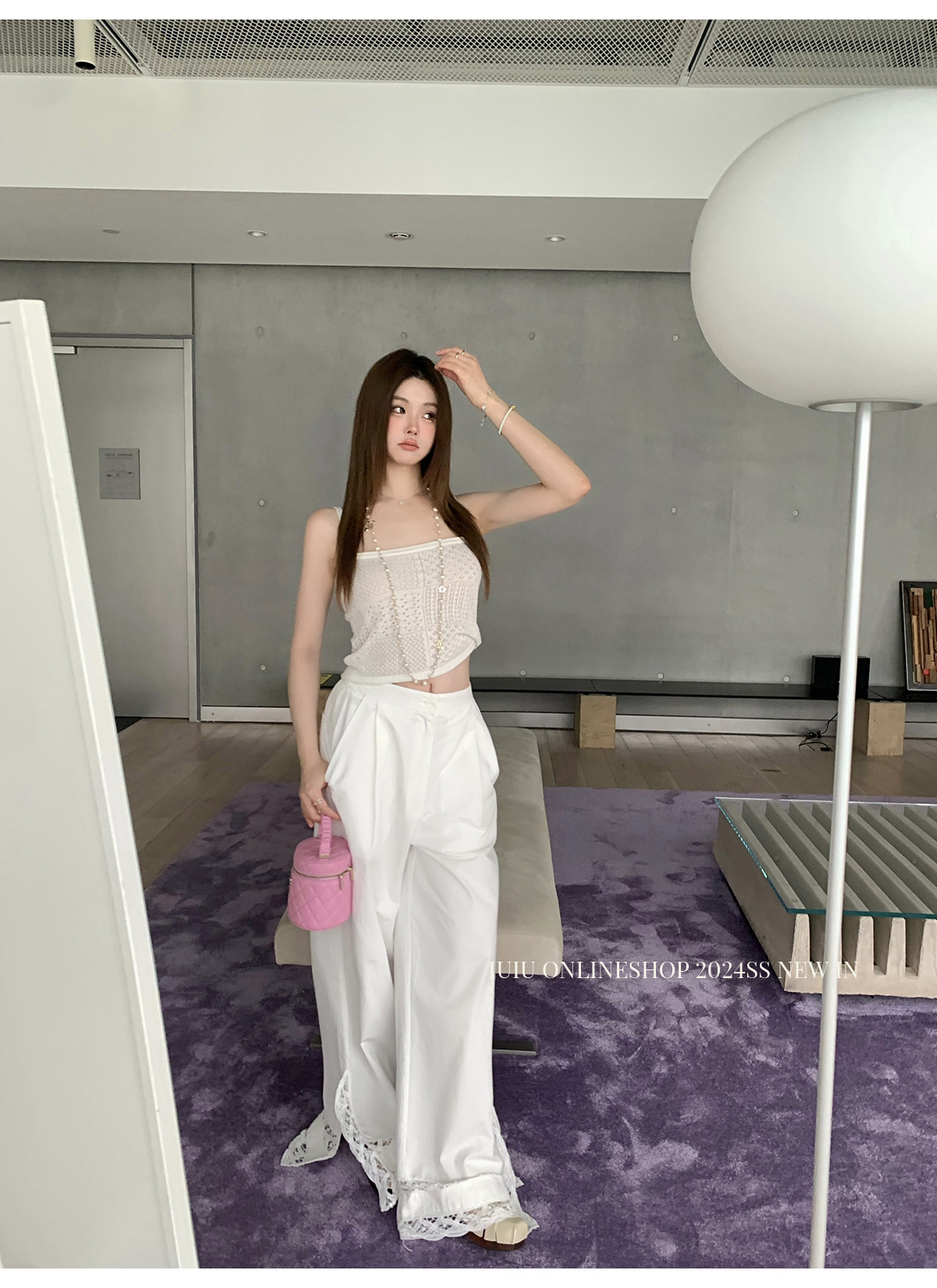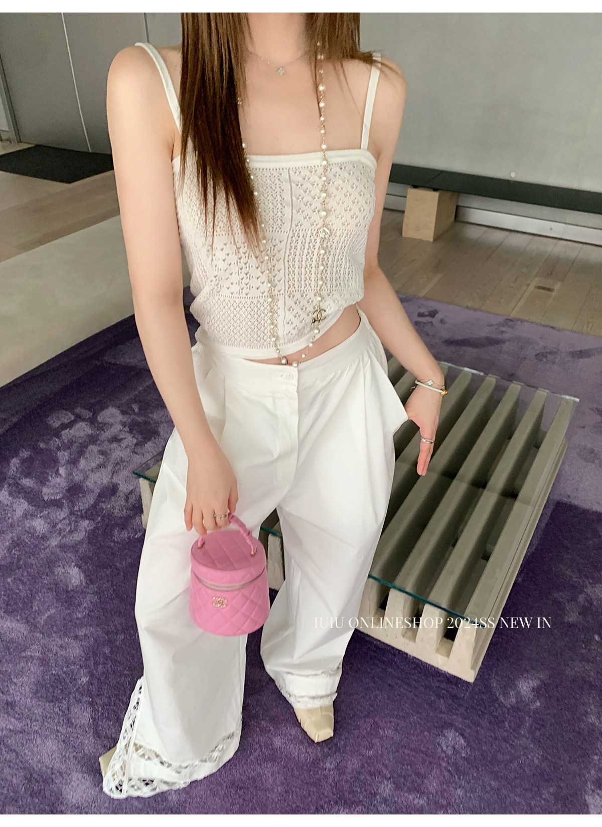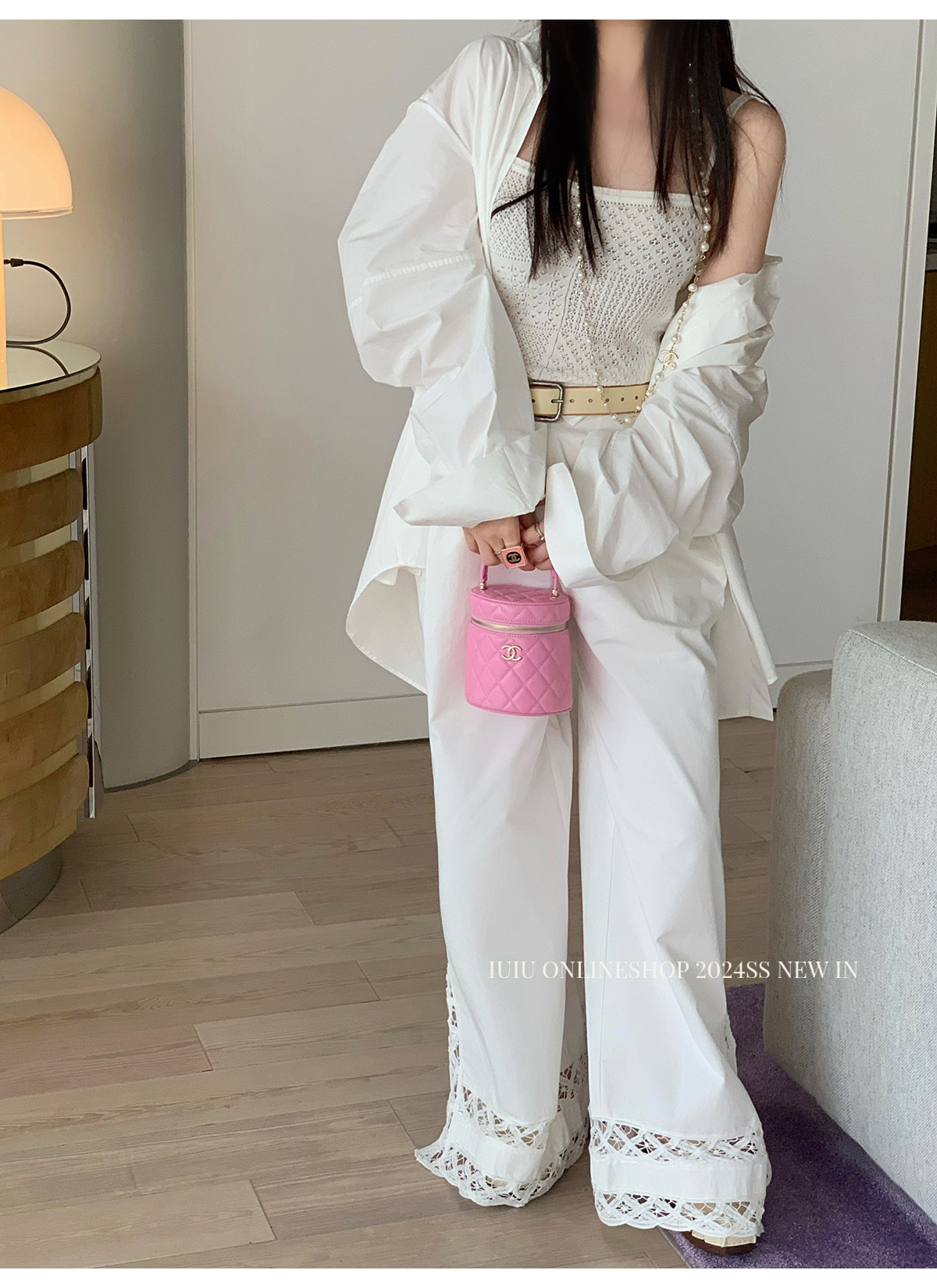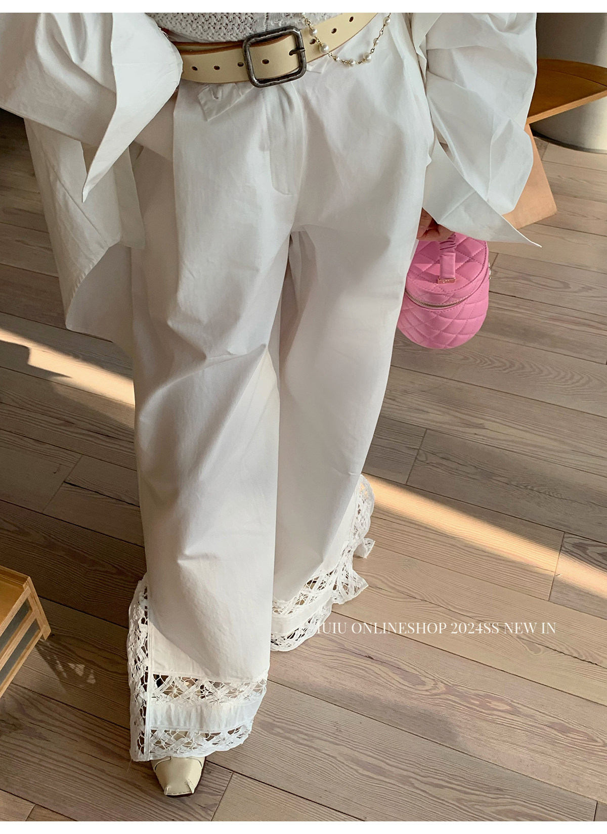 下裝是蕾絲花邊拼接的休閑褲