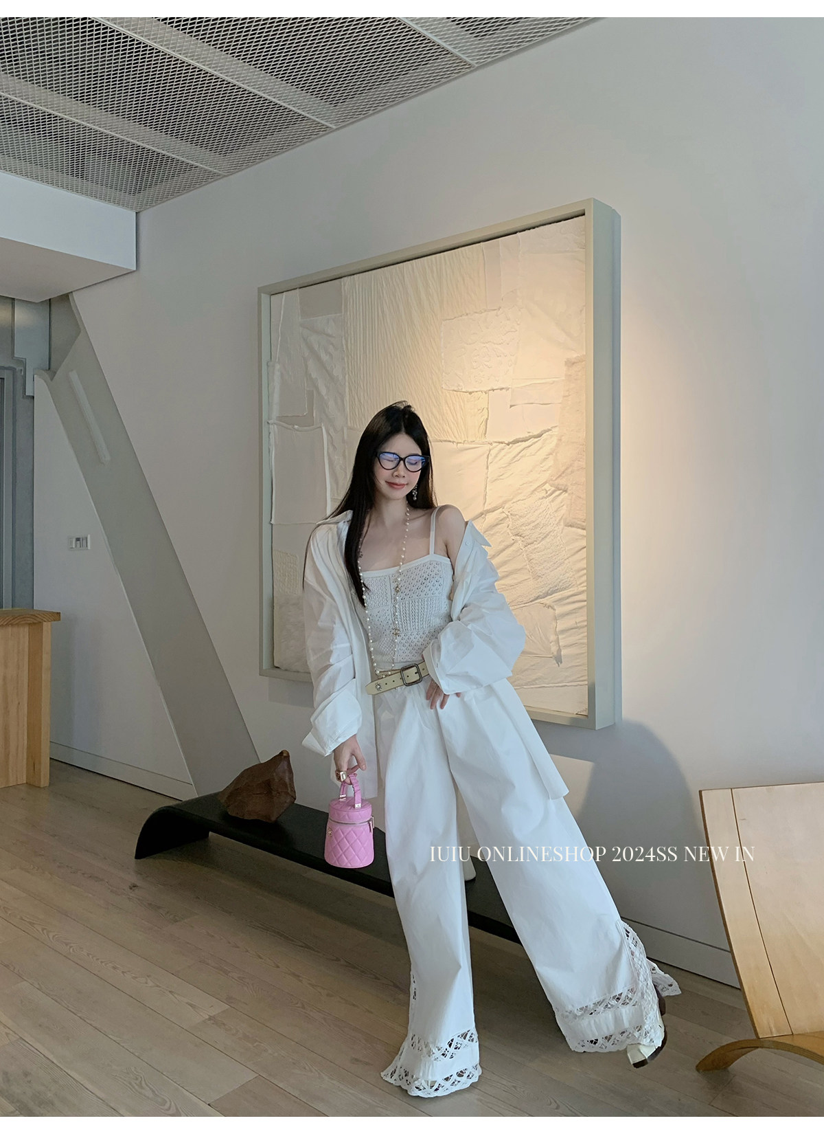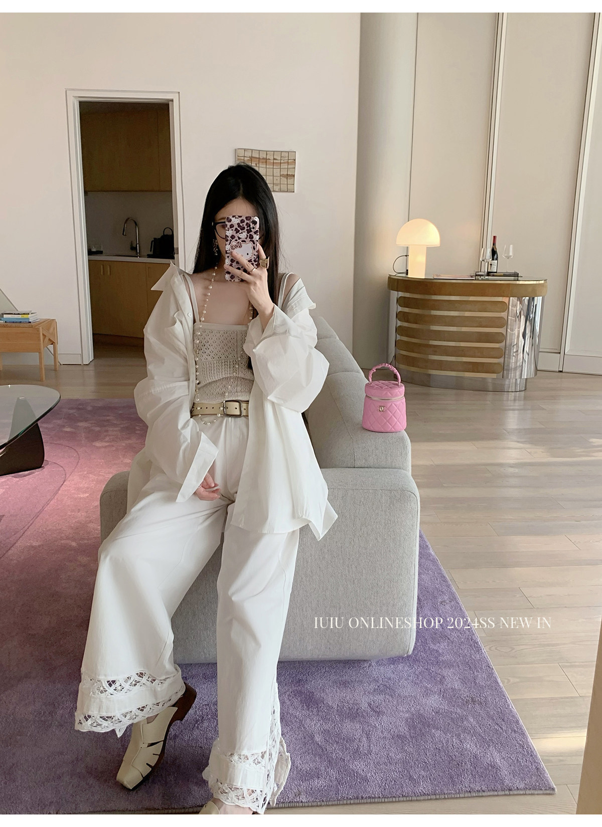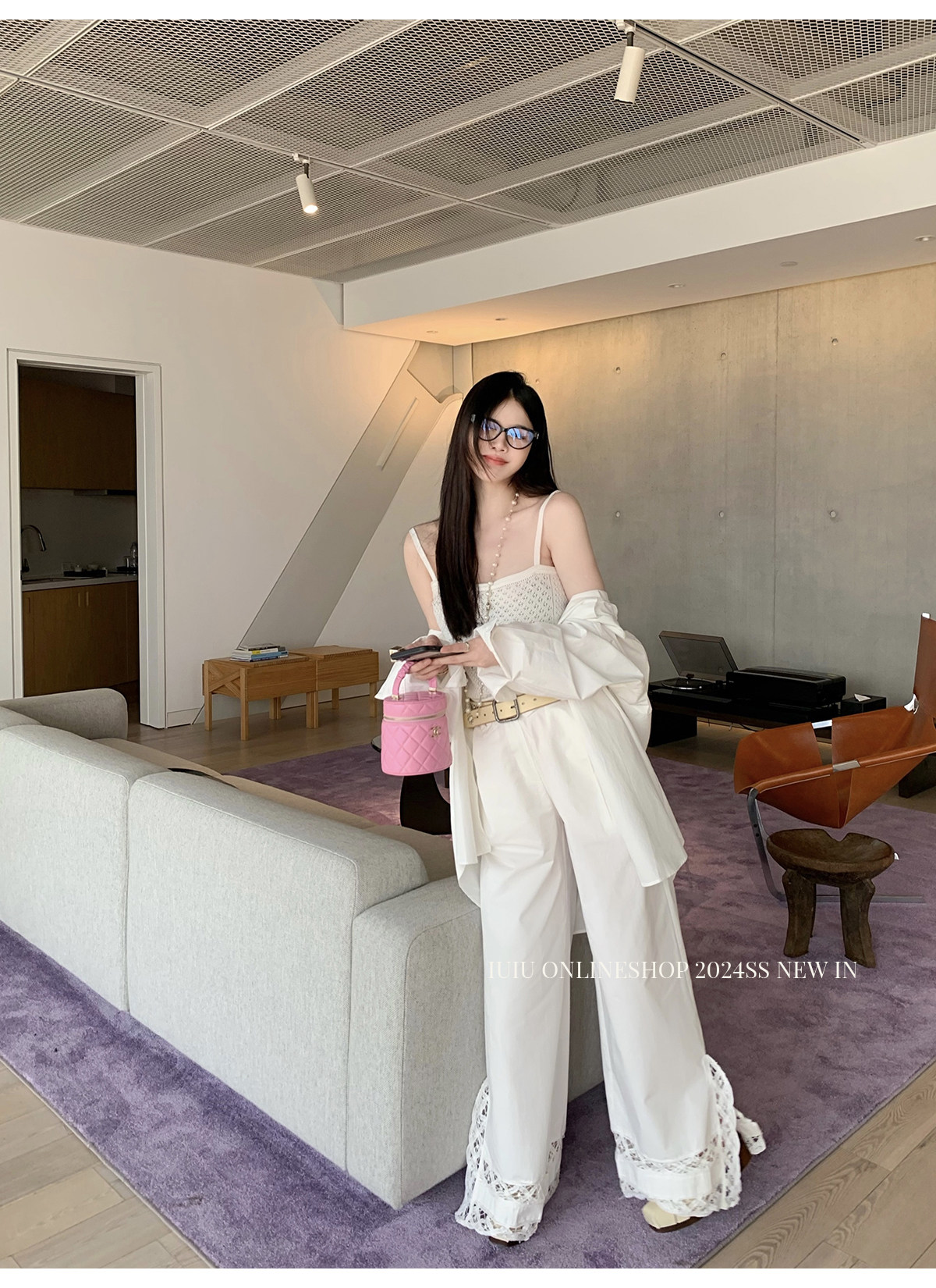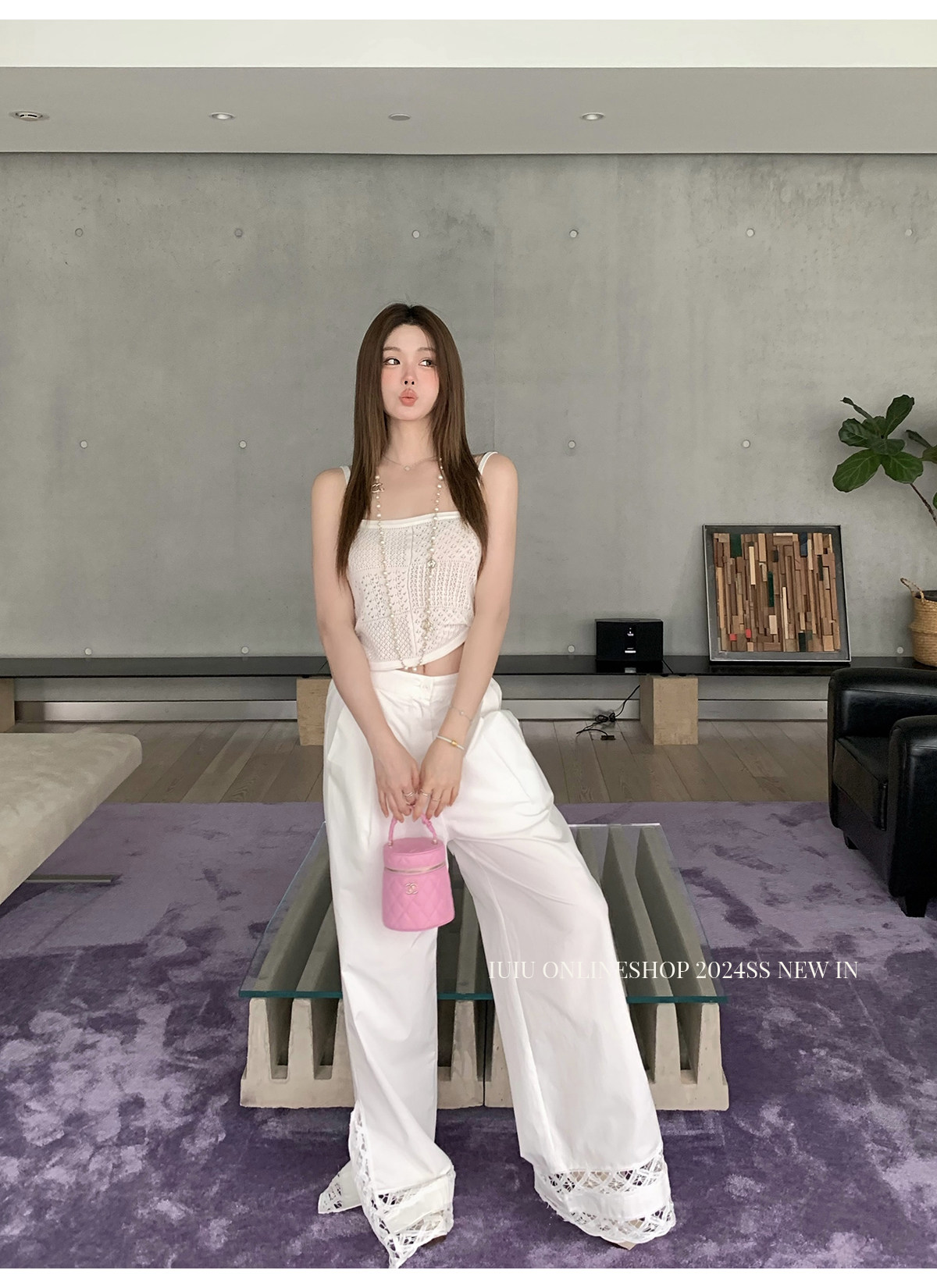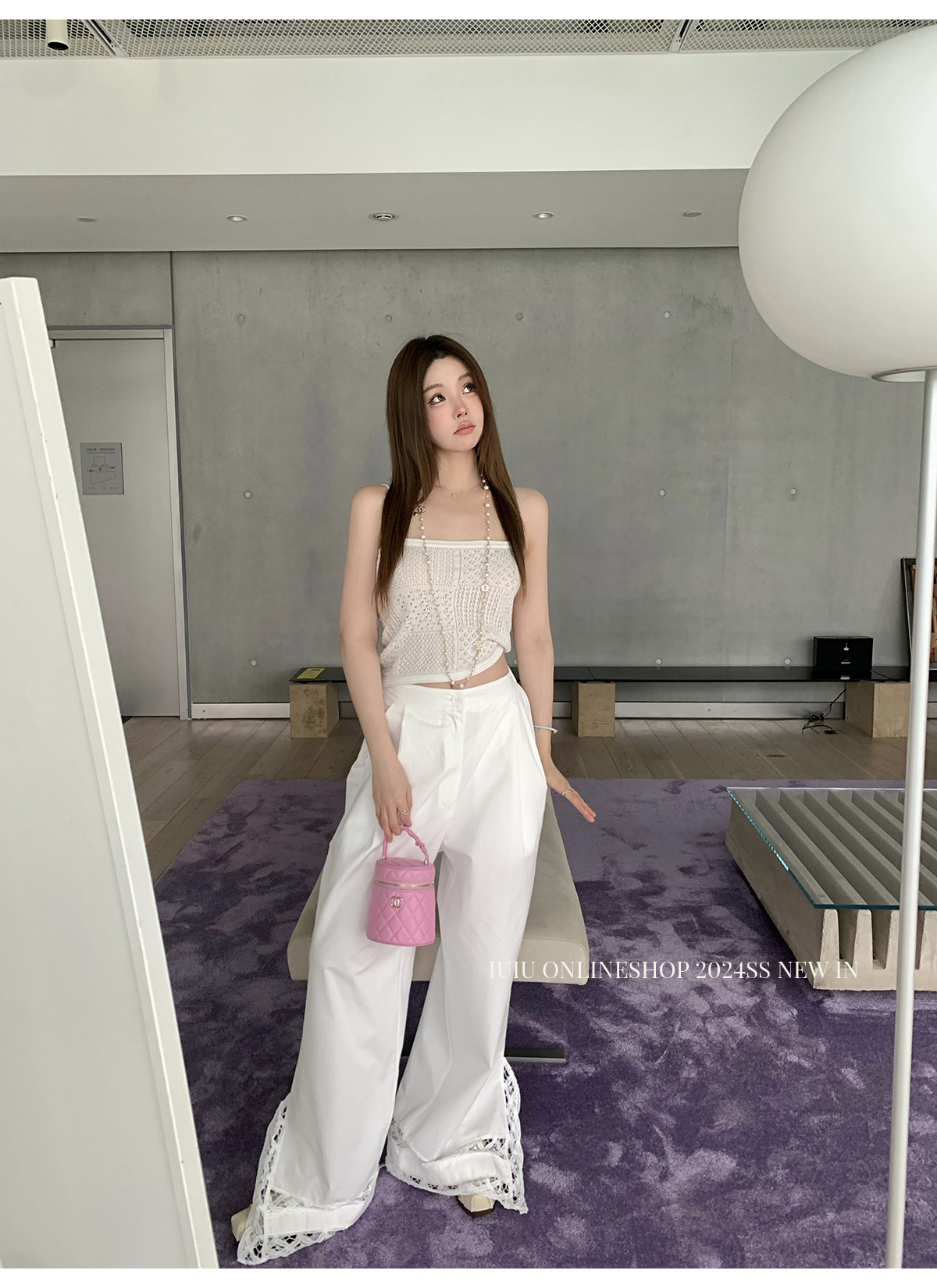 下裝是蕾絲花邊拼接的休閑褲