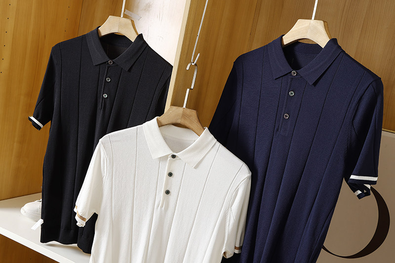 POLO式的翻領,伊力特豎條,半門襟三粒扣,
