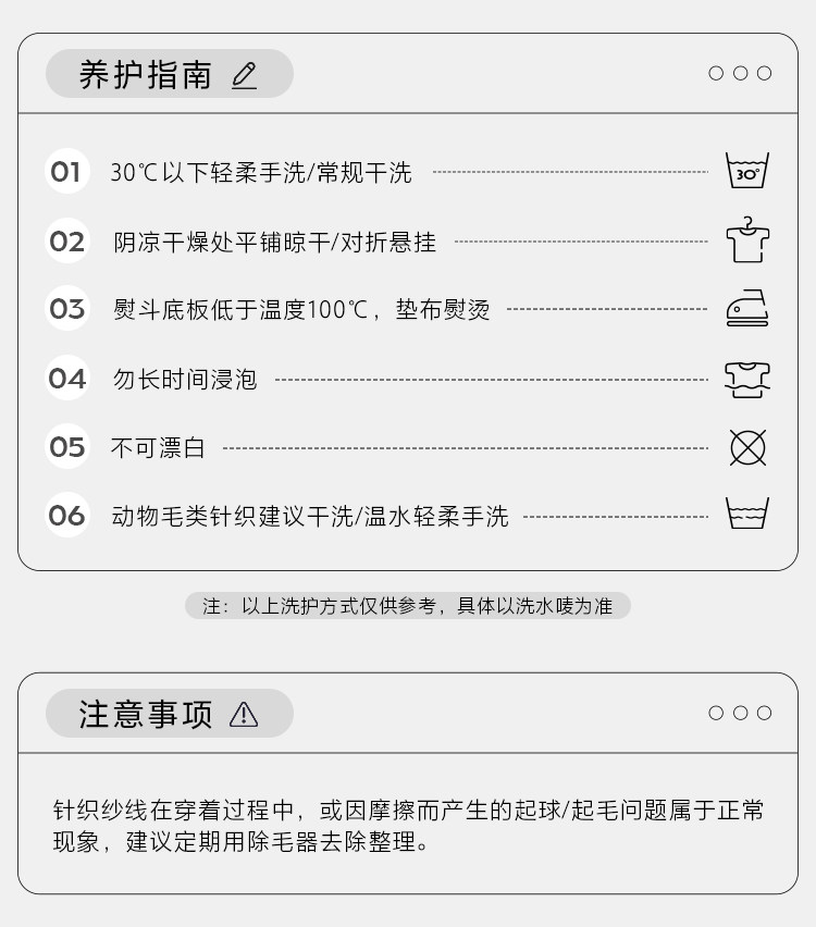| 洗滌建議: | 針織衣服在洗滌前,拍去灰塵放在冷水中浸泡10~20分鐘,拿出后擠干水分,放入洗衣粉溶液或肥皂片溶液中輕輕搓洗,再用清水漂洗。為了保證毛線的色澤,可在水中滴入2%的醋酸(食用醋亦可)來中和殘留的肥皂。這樣針織衫洗后變大的可能性就降低了。 |