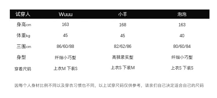 提醒:平面測量CM,因測量方法不同,存在2-3cm誤差屬于正常范圍。試穿表格 僅供參考