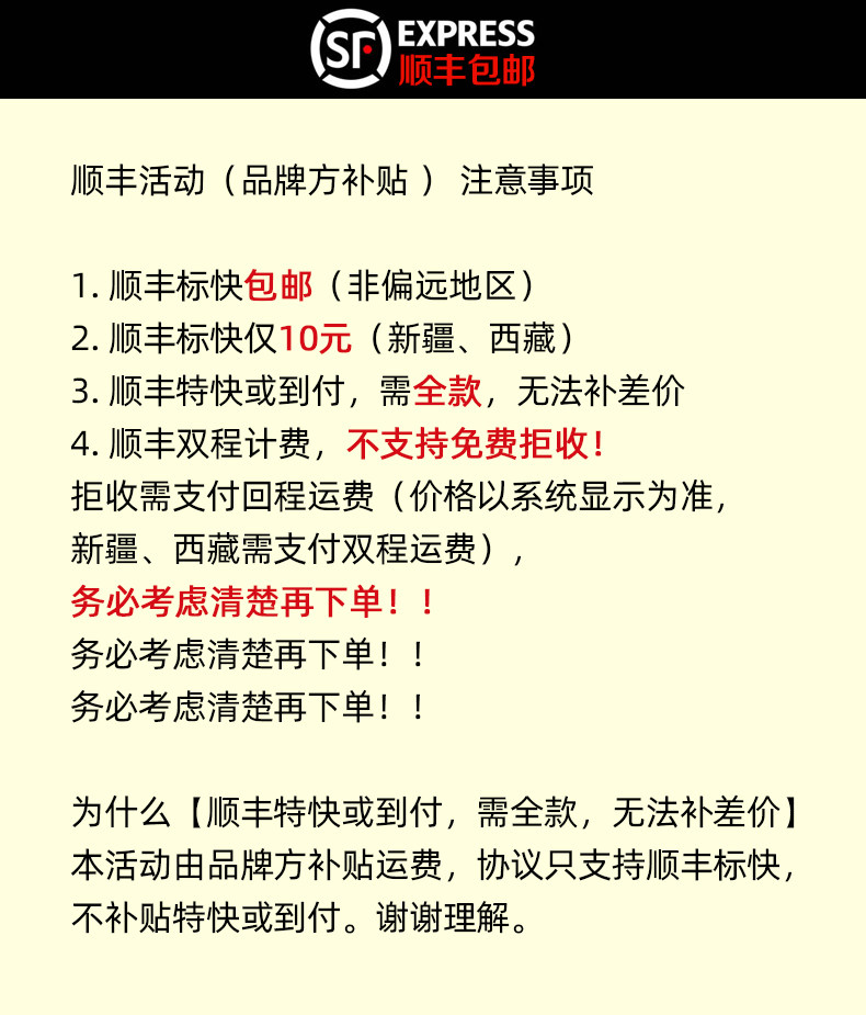訂單達到免運條件後,運費將涵蓋關稅及5公斤以內包裹的基本運費。若包裹最終稱重超過5公斤,超重部分將依據集運倉運費計算公告(https://m.bcatlogistics.com/single?id=115)依照材積重量加收運費。客服人員將在收到加收運費通知後與您聯繫。若於收到收費通知D+5日內無法聯繫上您或未得到回覆,訂單將直接取消,包裹將進行逆物流退回廠商。此外,消費者需承擔大陸端的往返運費(約新台幣200至2000元不等)。若未支付逆物流費用,將無法進行退款作業。建議您在下單前先與商家客服確認運費預估金額。 - 「全球購折價券及運費折抵券,為消費者免費領取,視為附條件使用的優惠券,僅限訂單成功完成後生效。若因斷貨、缺貨等不可控因素導致訂單取消,折價券/運費折抵券因交易未成立而失效,恕不返還。消費者領取及使用本折價券,即視為同意相關活動規則及限制。」
